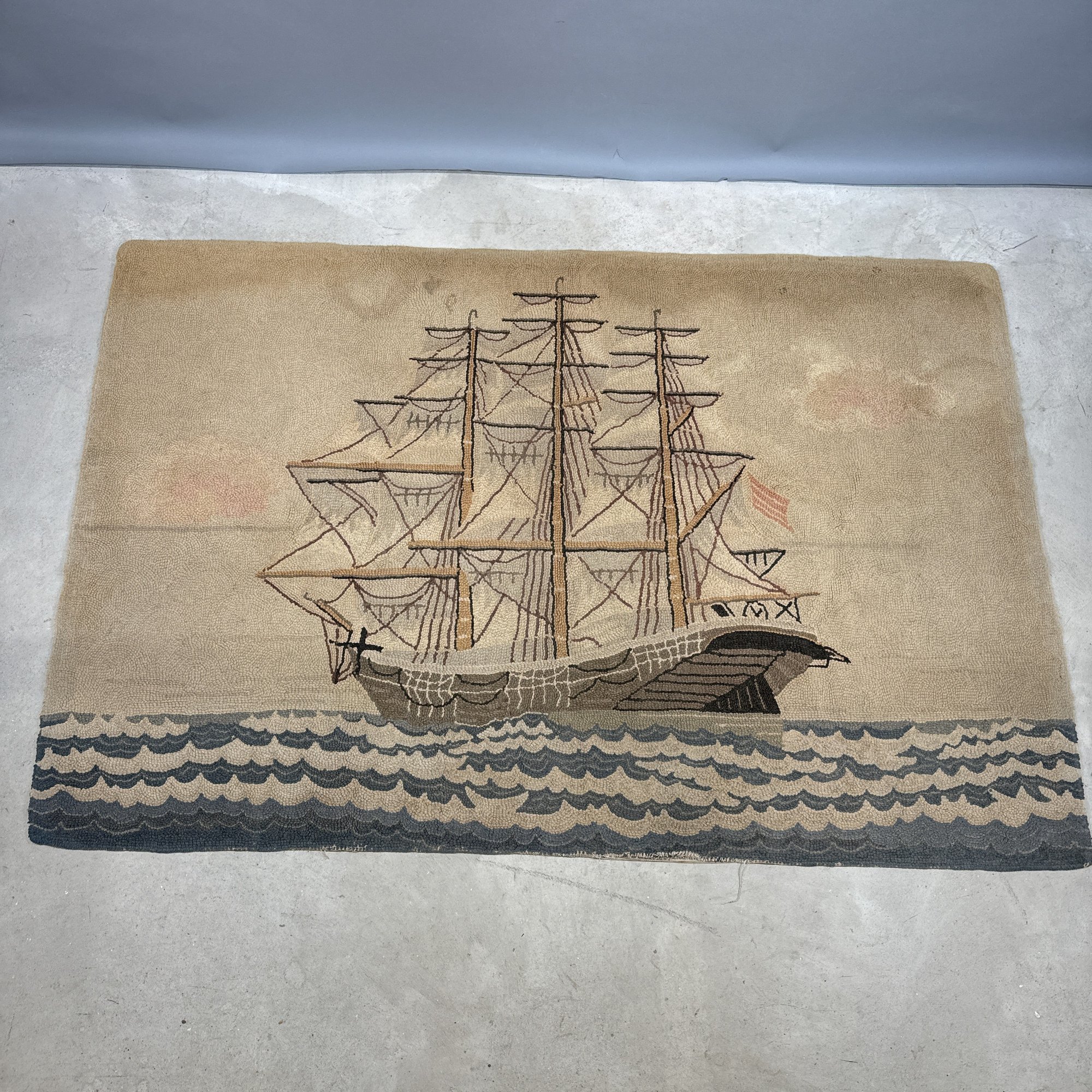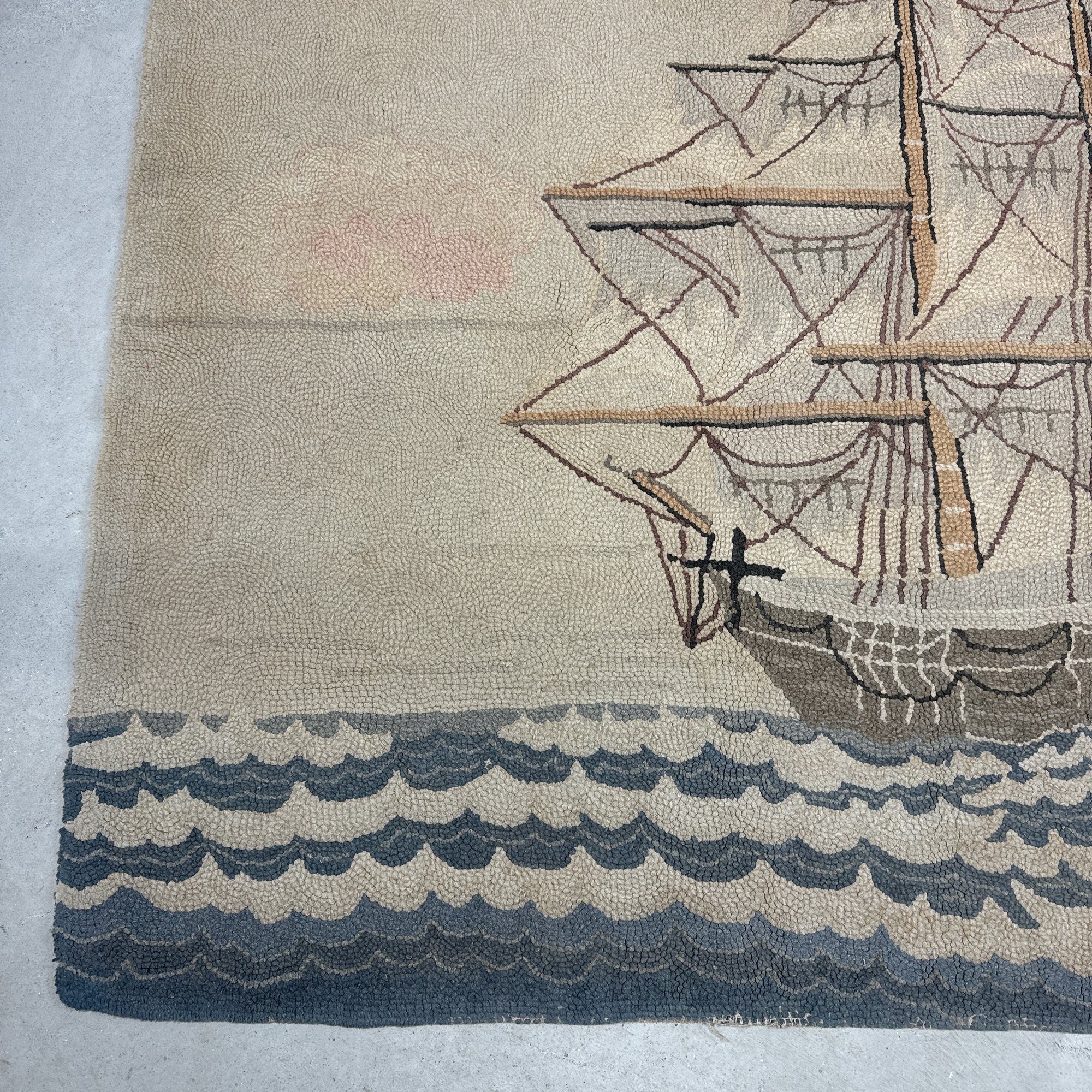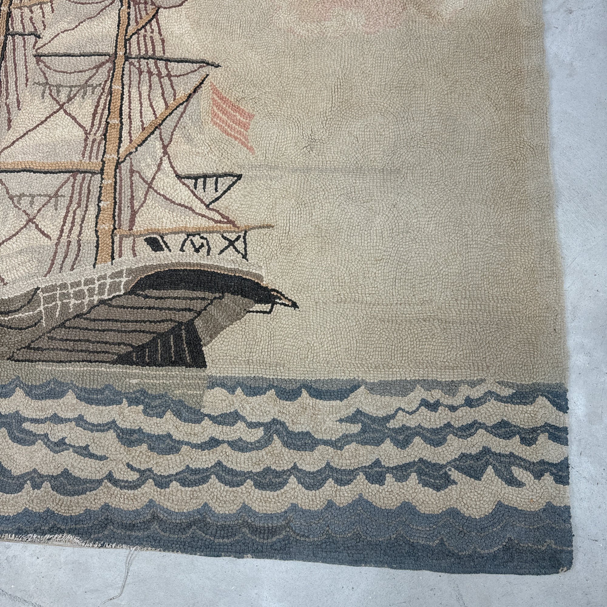 Large American Hooked Rug Depicting a Three-Masted Ship. Worked in shades of brown, blue, red and cream yarns with a ship sailing on choppy waters.