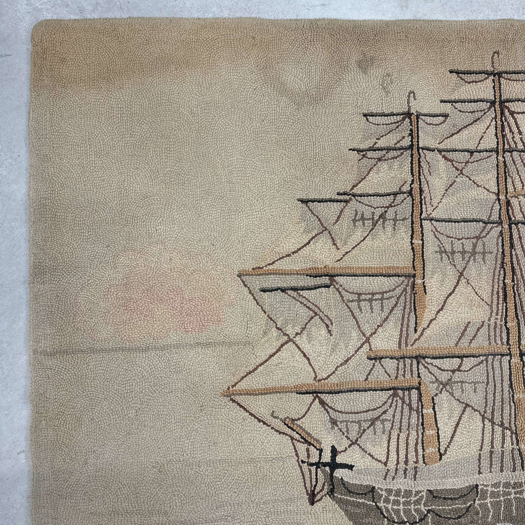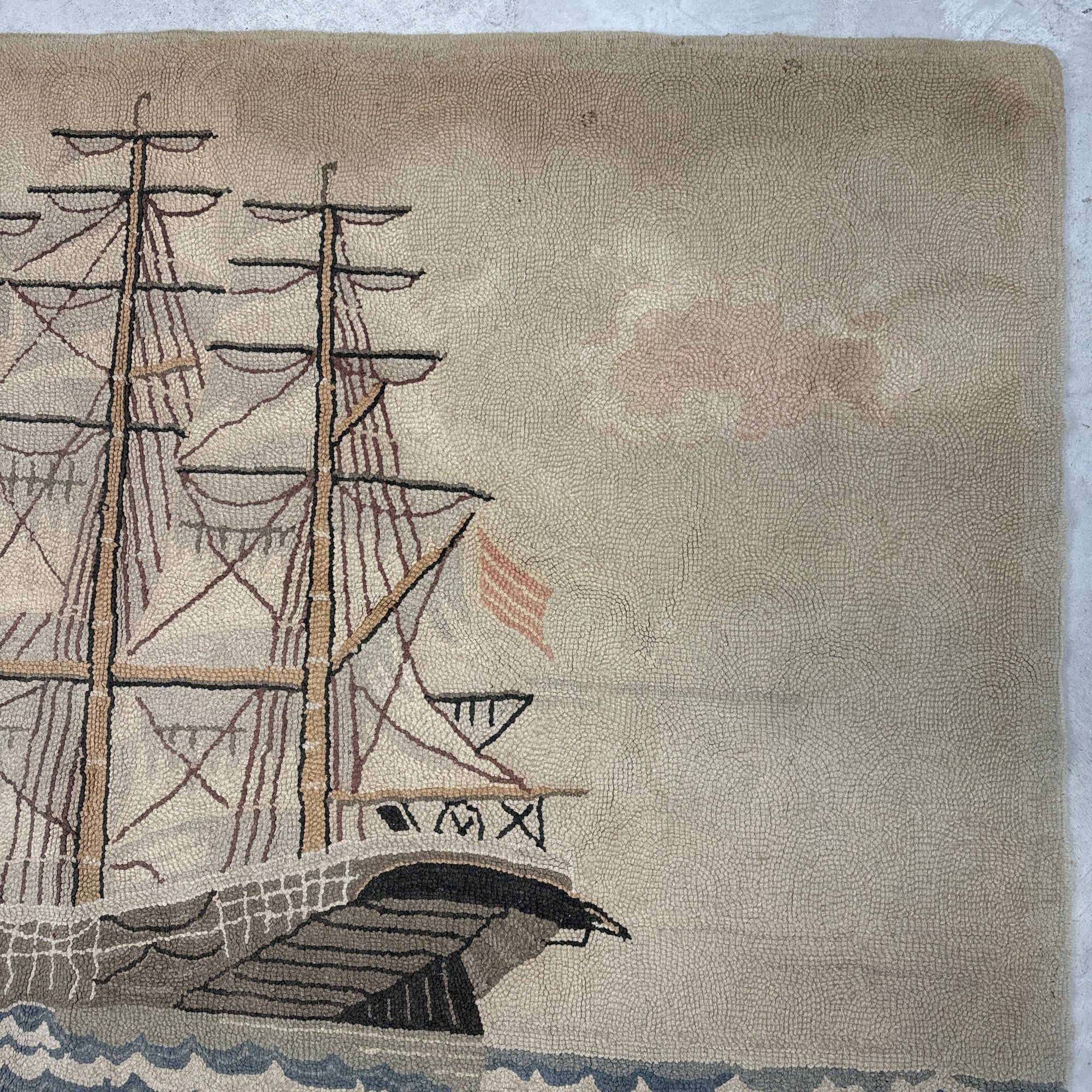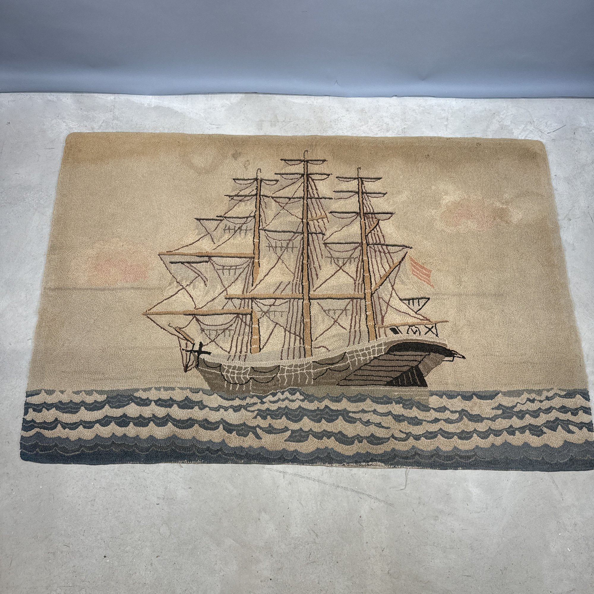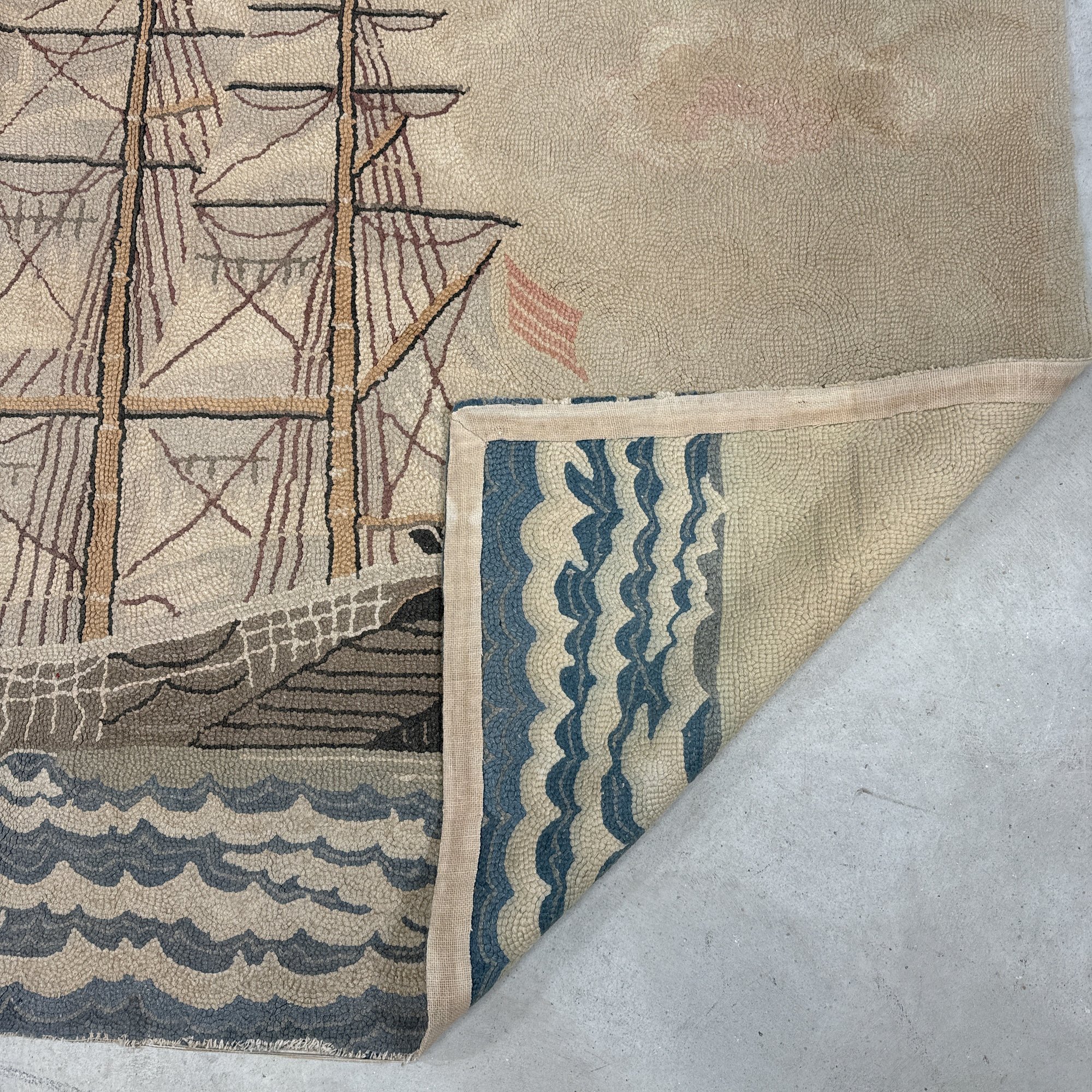 Large American Hooked Rug Depicting a Three-Masted Ship. Worked in shades of brown, blue, red and cream yarns with a ship sailing on choppy waters.