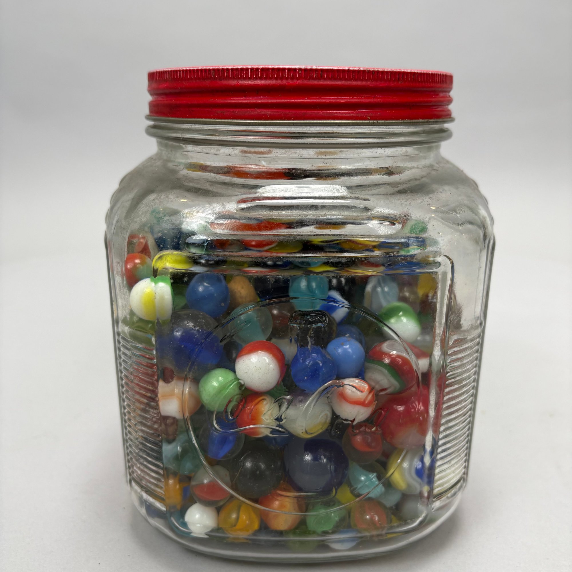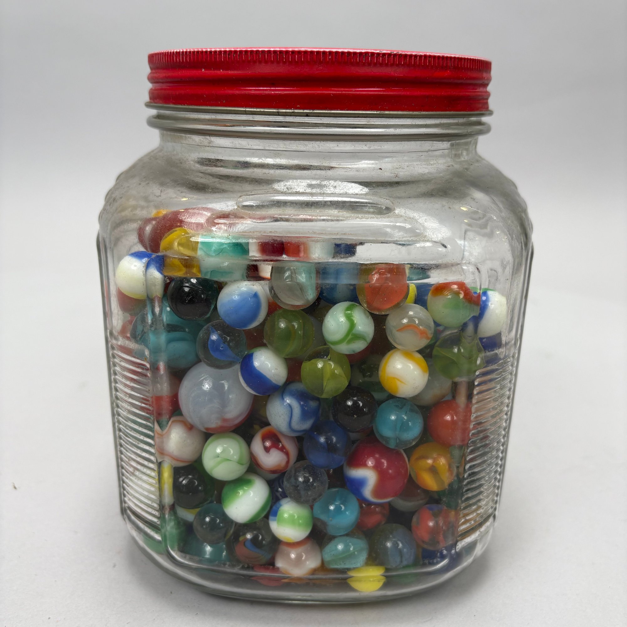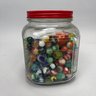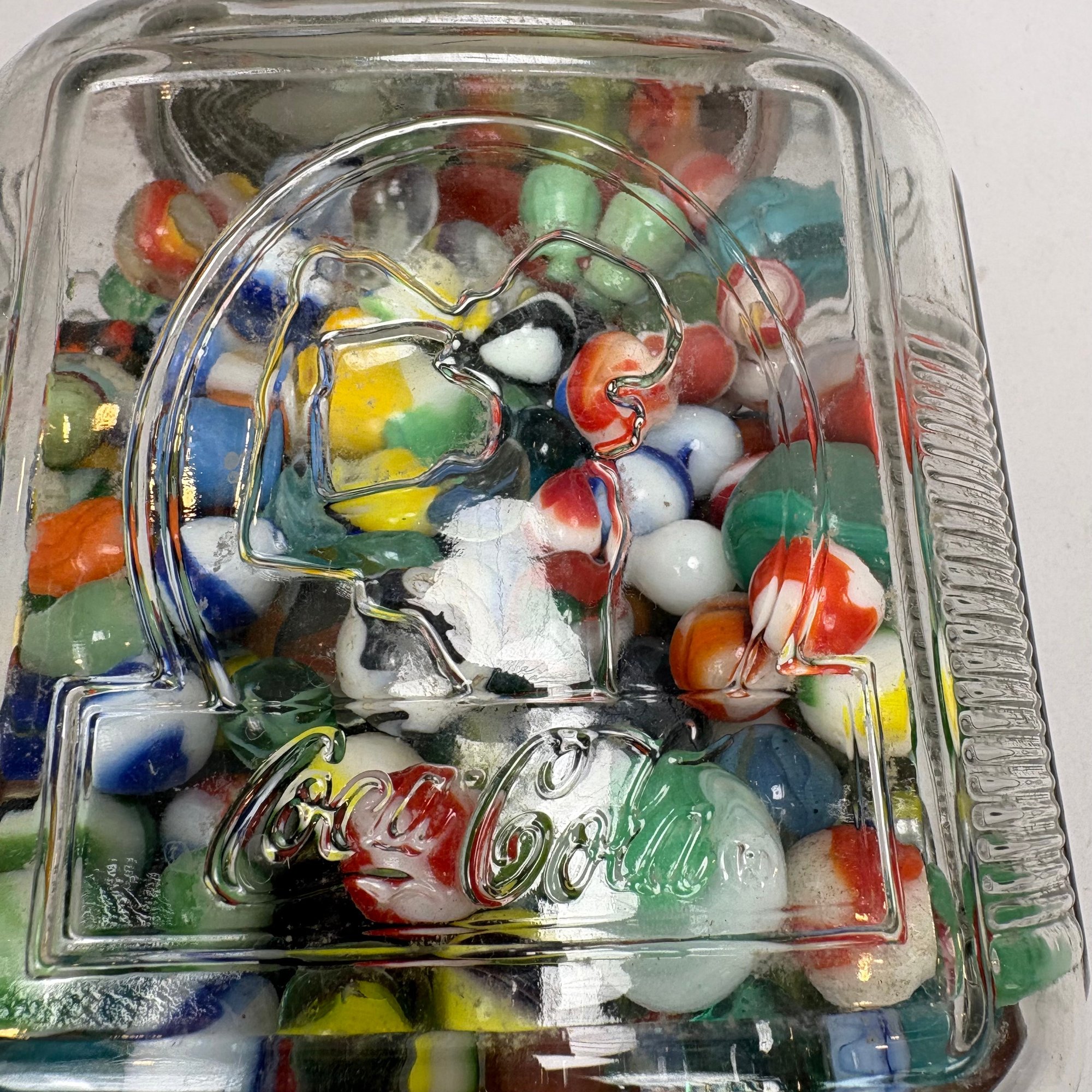 Large Collection of Assorted Vintage Marbles, Contained in Two Glass Jars. One jar with red cover molded "Coca Cola," machine made and including cat's eyes, aggies, swirled and clear colors.