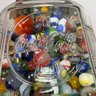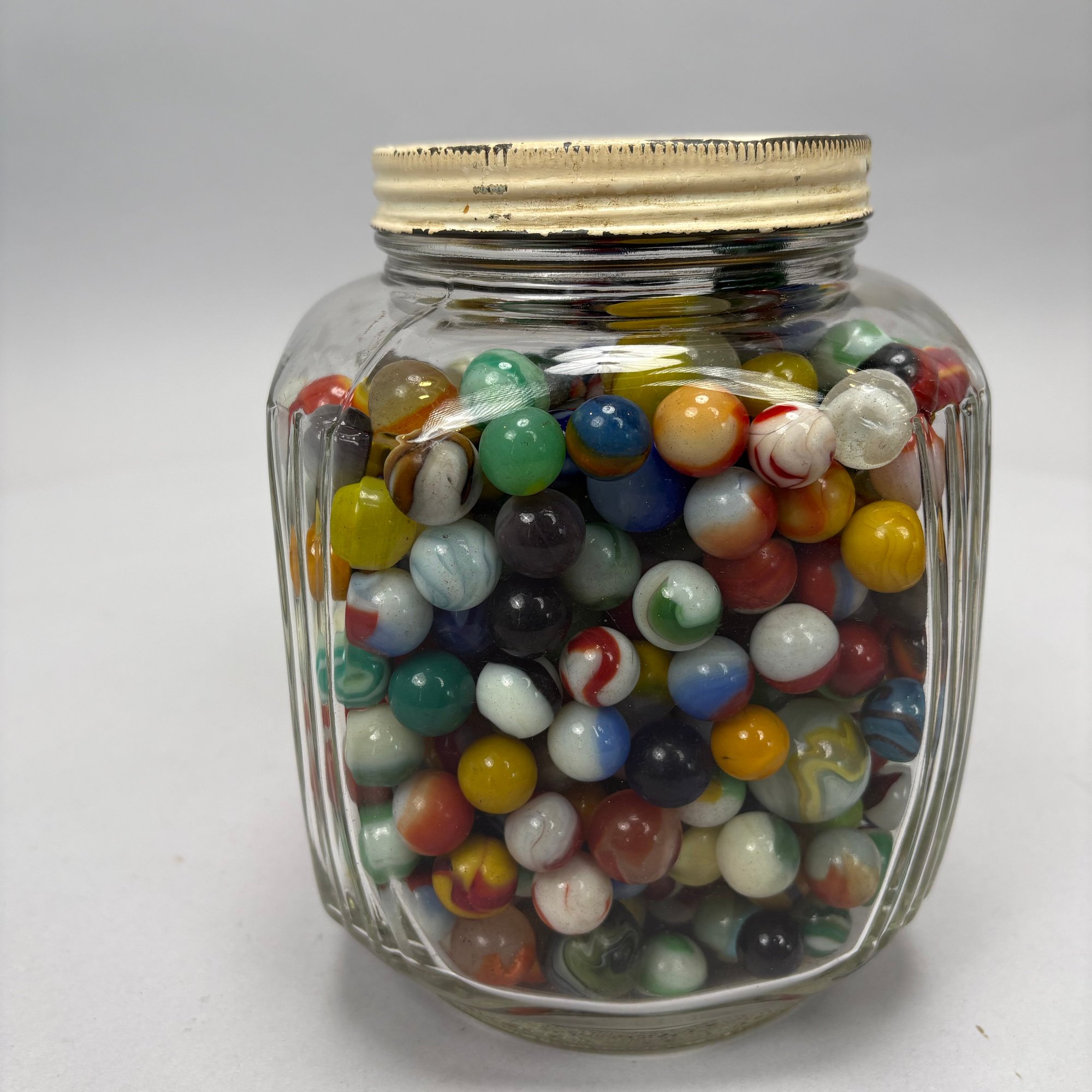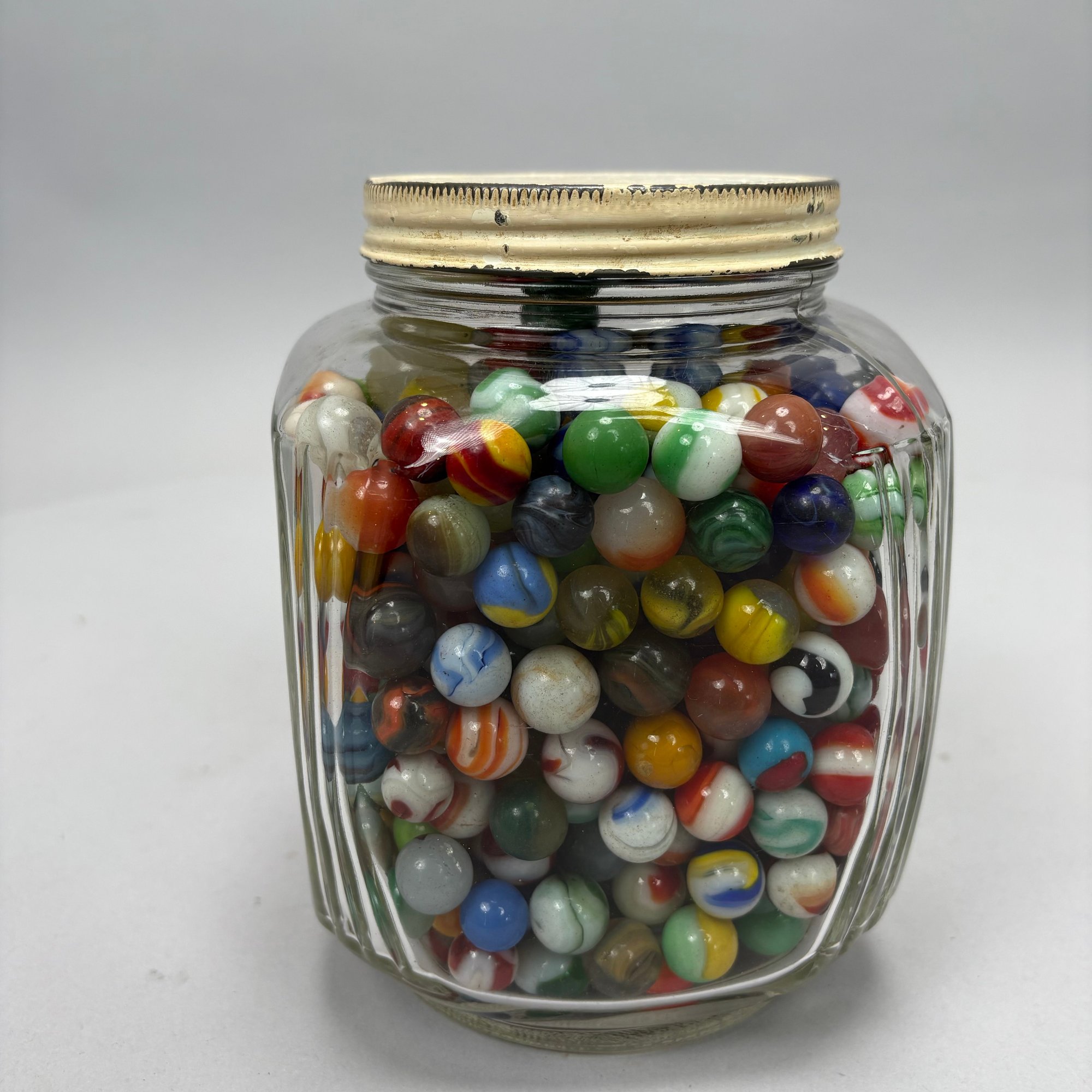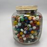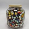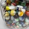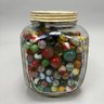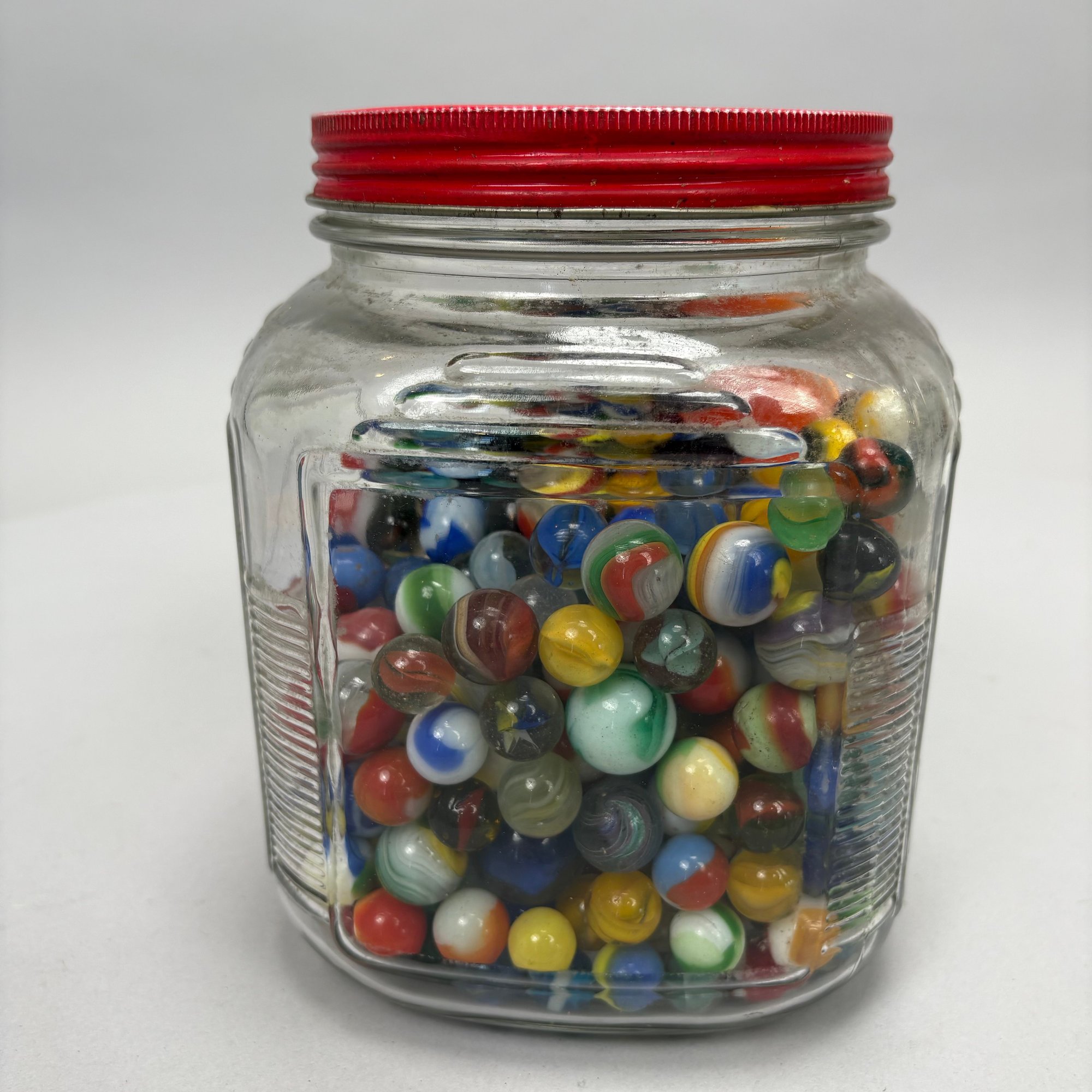 Large Collection of Assorted Vintage Marbles, Contained in Two Glass Jars. One jar with red cover molded "Coca Cola," machine made and including cat's eyes, aggies, swirled and clear colors.