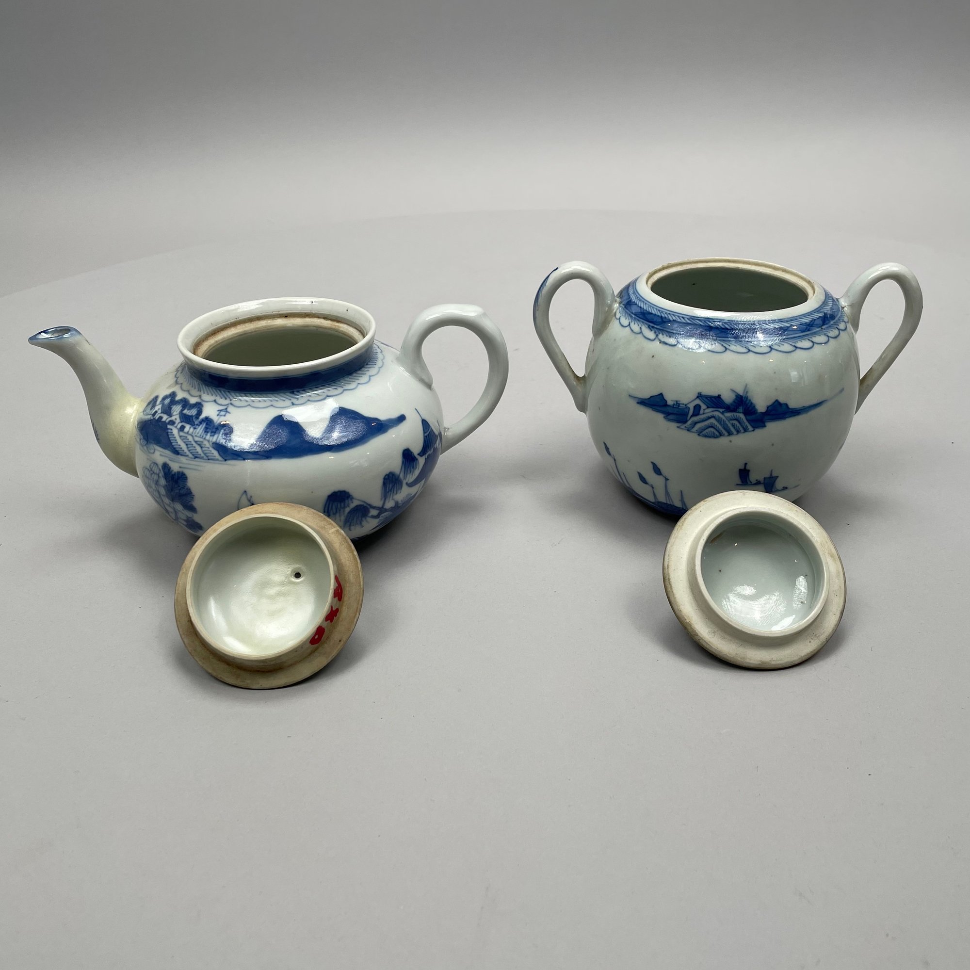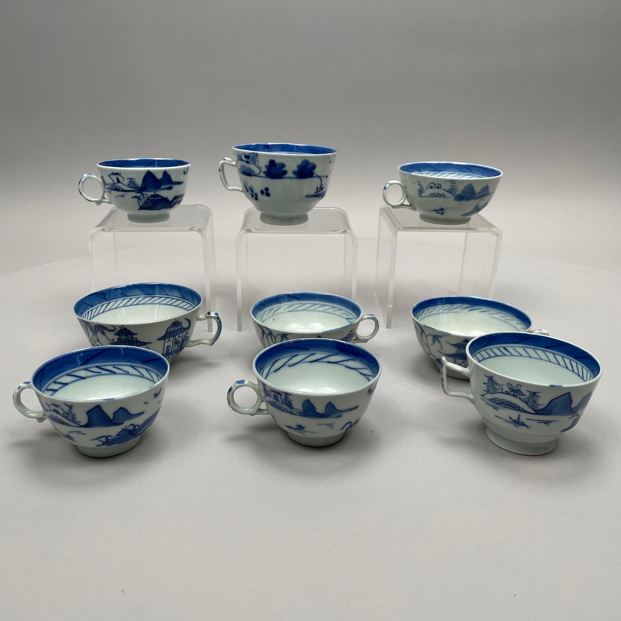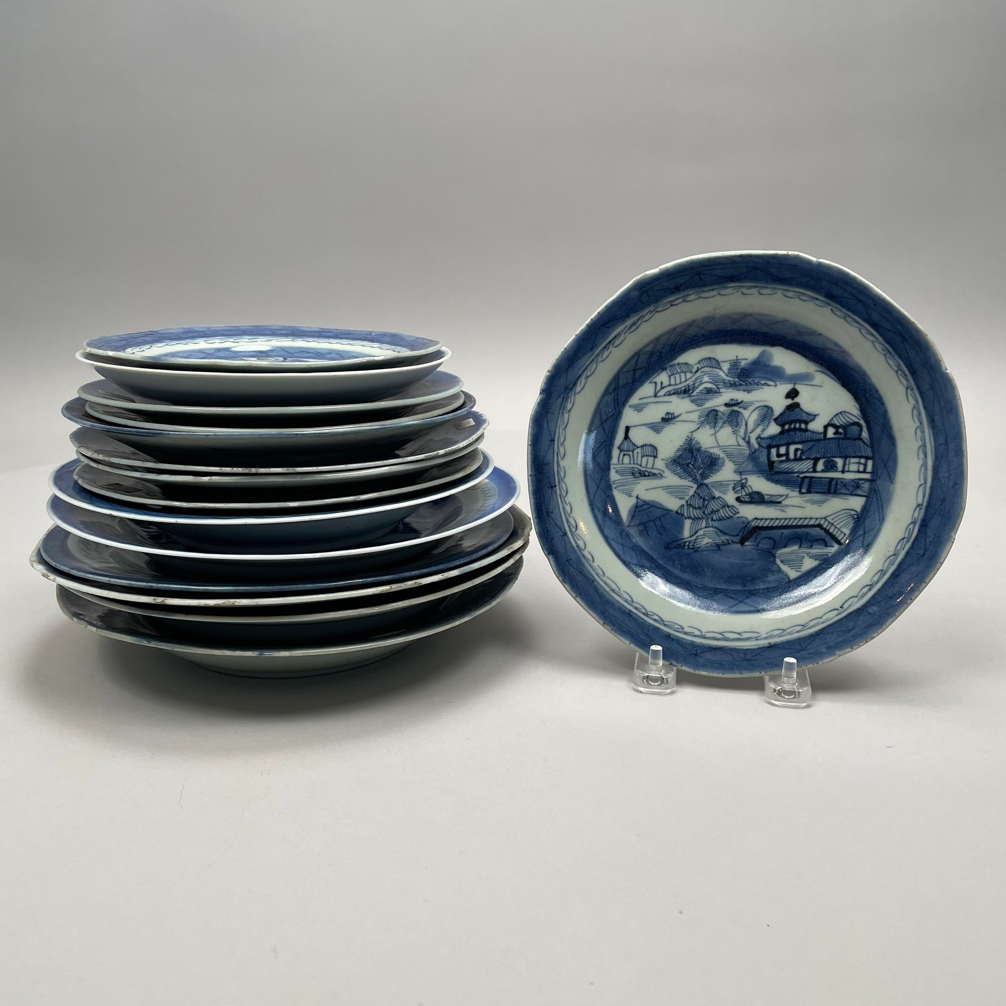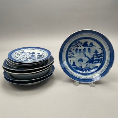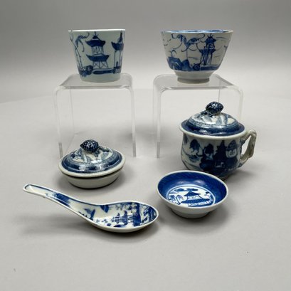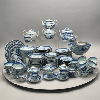 Large Group of Chinese Export Canton Porcelain Wares, Nineteenth Century. Comprising serving pieces, liners, teapots, sugar bowls and covers, plates, two-handled cups, cups and saucers.