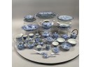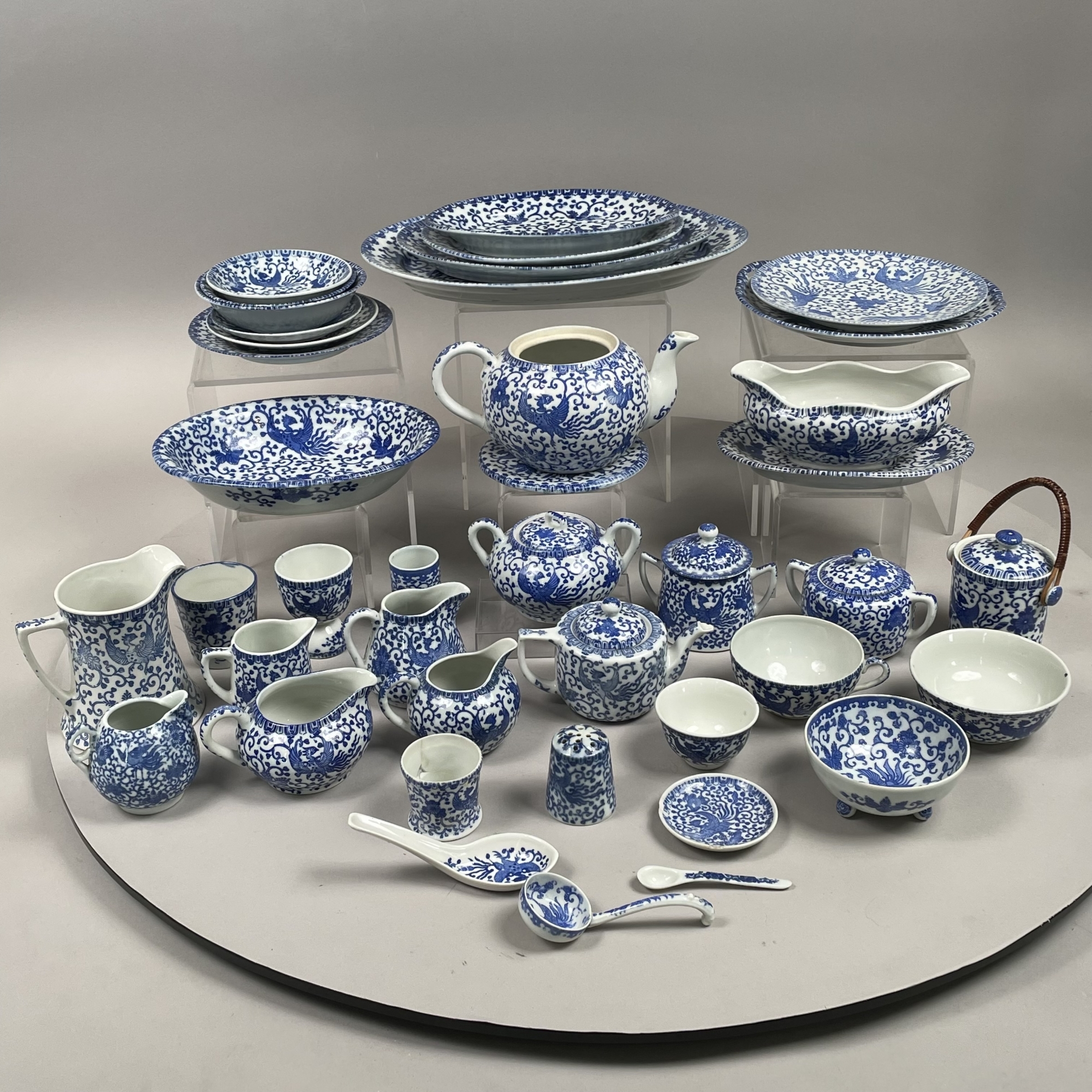 Comprising four graduated platters, circular tray, oval vegetable dish, tureen with fixed stand, six 8.375 in. plates, sixteen 6.75-7.375 in. plates, twelve side dishes, two rice bowls and one rice spoon, teabowl and saucer, seventeen pudding dishes, four egg cups, seven salt and pepper shakers, two condiment jars, toothpick holder, sauce ladle, spoon, five beakers, pitcher, eighteen teacups and nineteen saucers, large teapot and stand with sugar bowl and cream pitcher, two small teapots, two sugar bowls and four cream pitchers, various printed factory marks in underglaze-blue. (134)