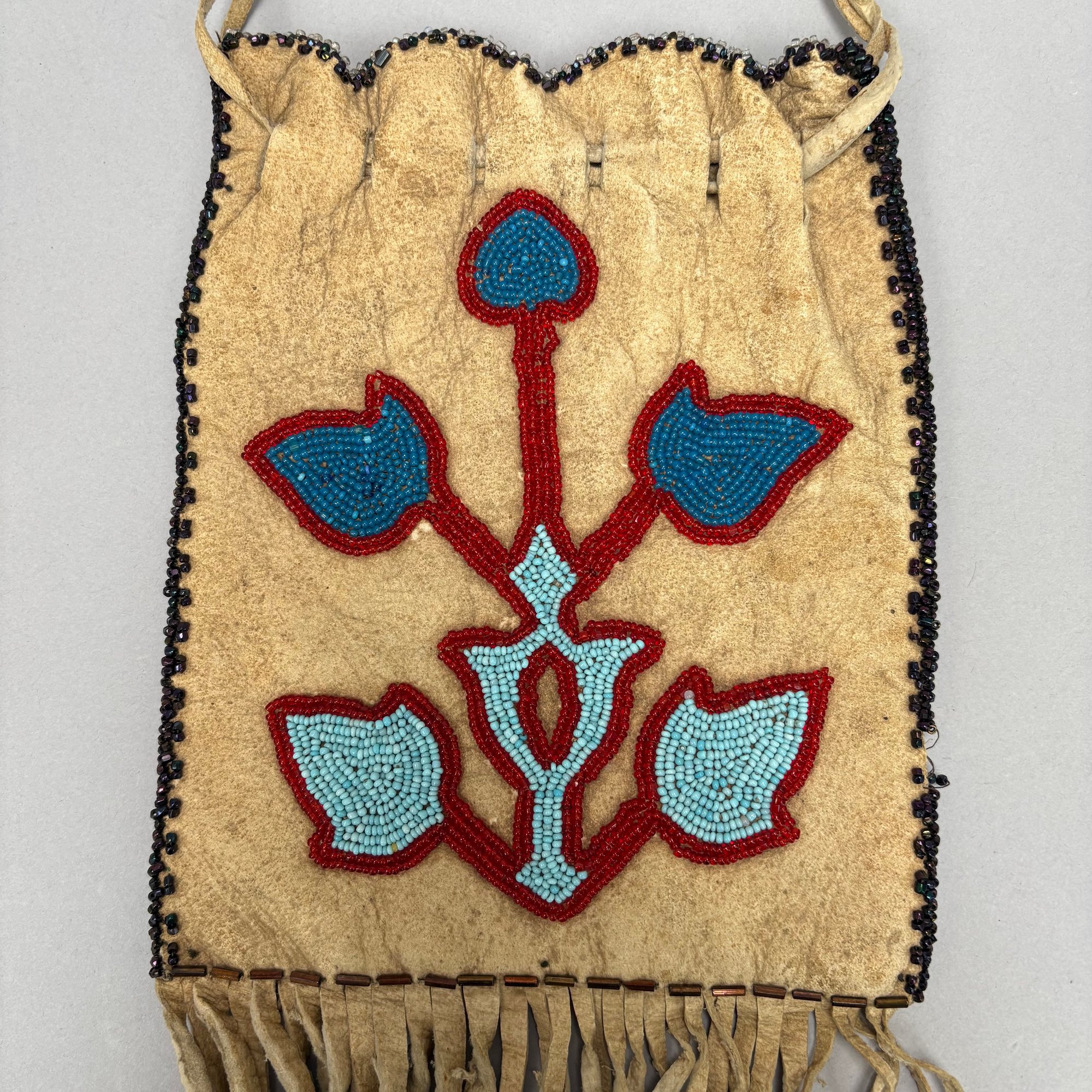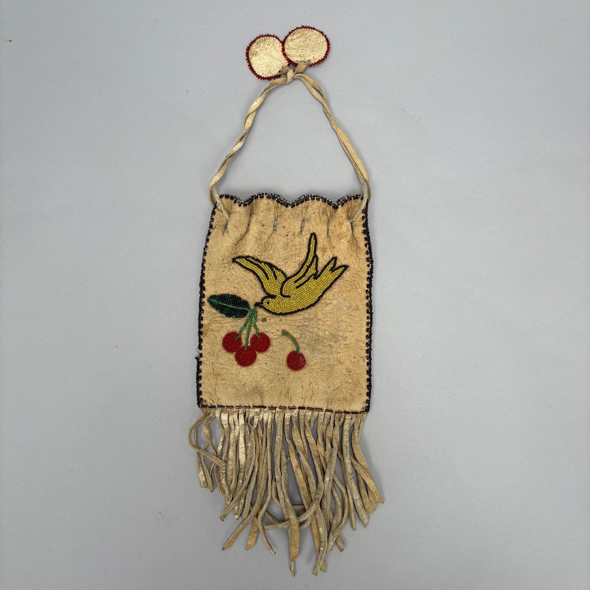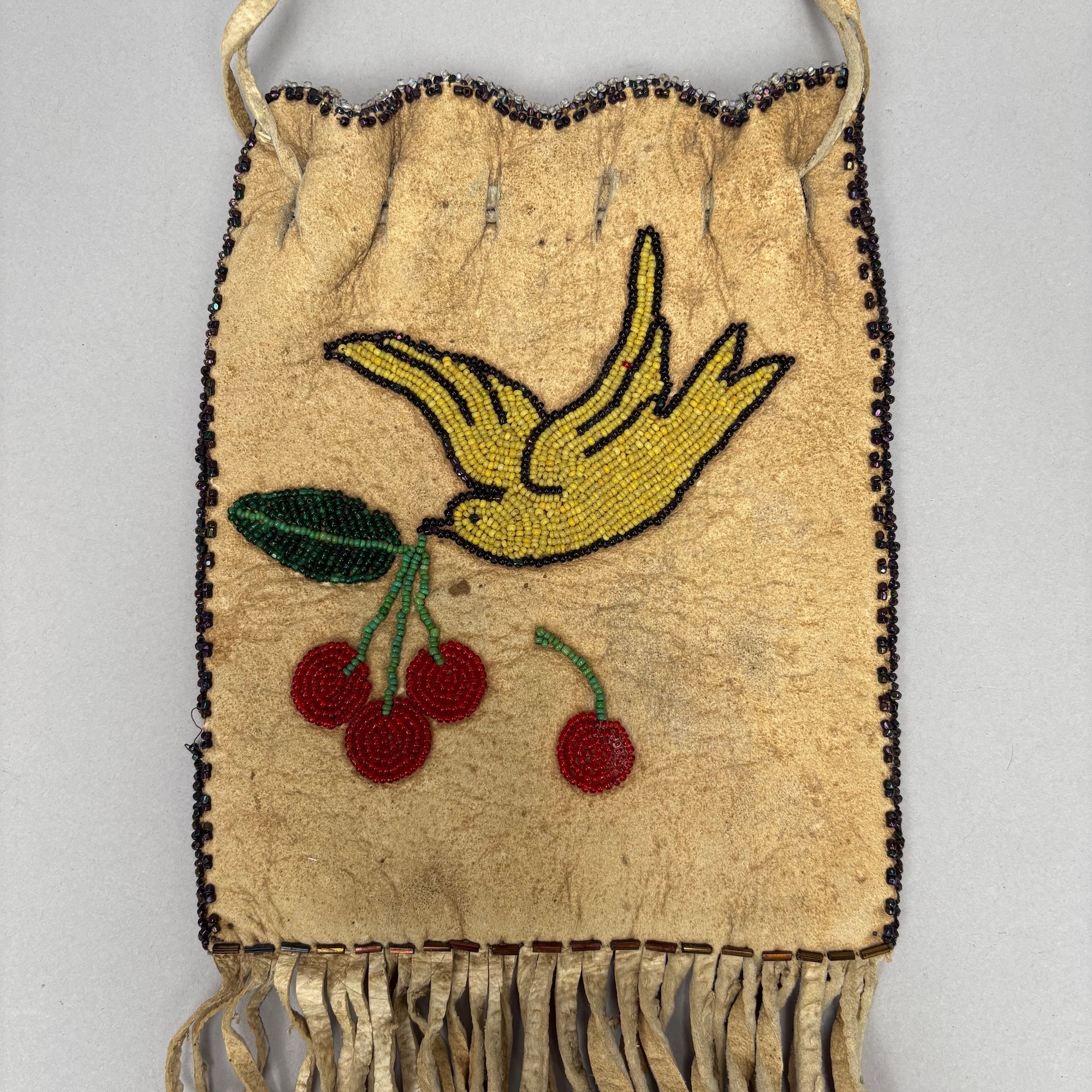 Leather Beadwork Pouch, Probably Native American, Possibly Great Lakes Region. Worked in beads with a yellow bird in flight and carrying a spray of cherries, the other side with a flower stem in blue, turquoise and red beads, beaded borders, and fringed bottom.