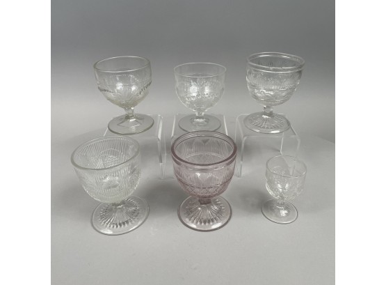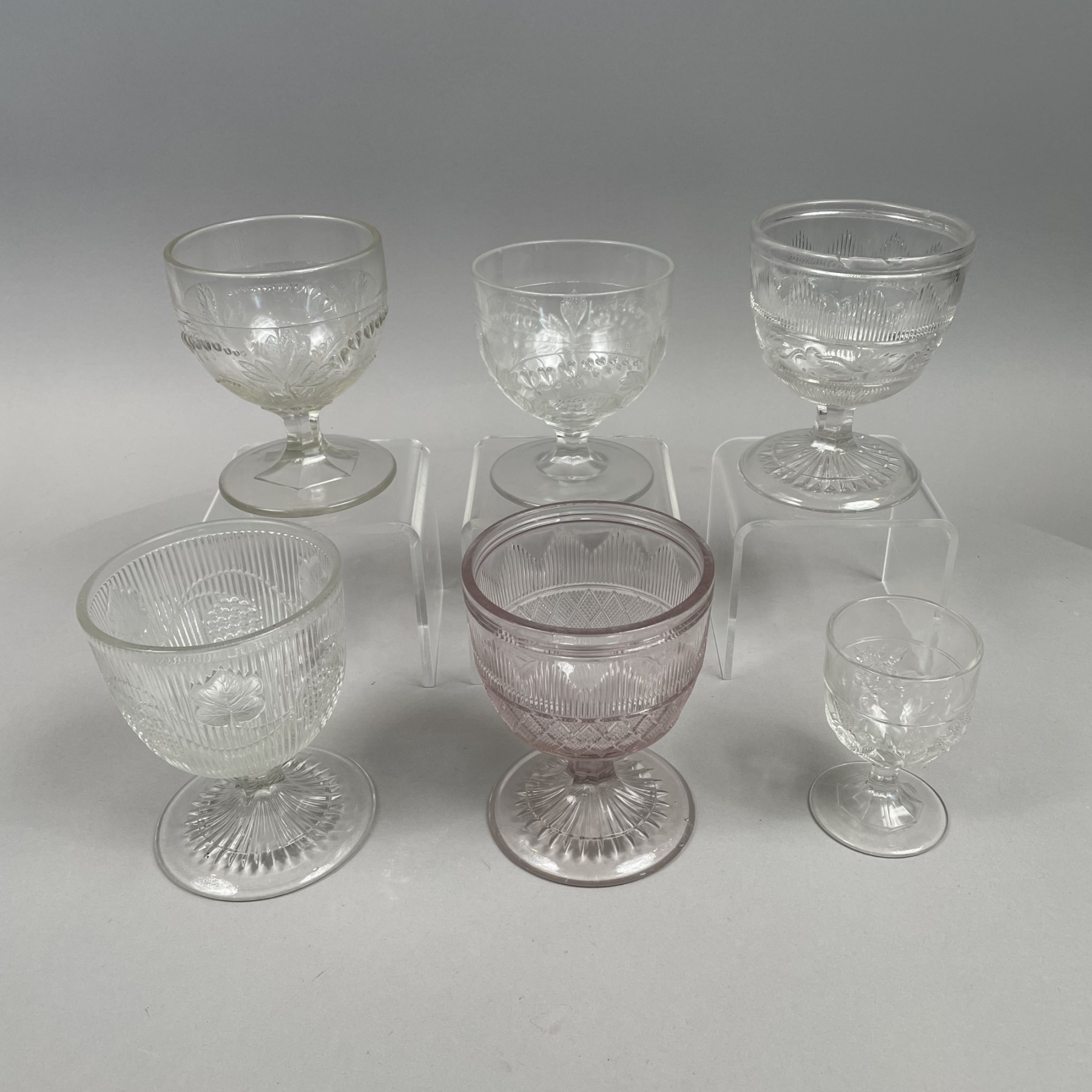 Comprising twelve 'Hamilton' pattern glass goblets, one 'Ribbed Grape' goblet, two 'Bleeding Heart' goblets and four sherry or cordial glasses, and eleven 'Full Rose' sherry or cordial glasses. (30)