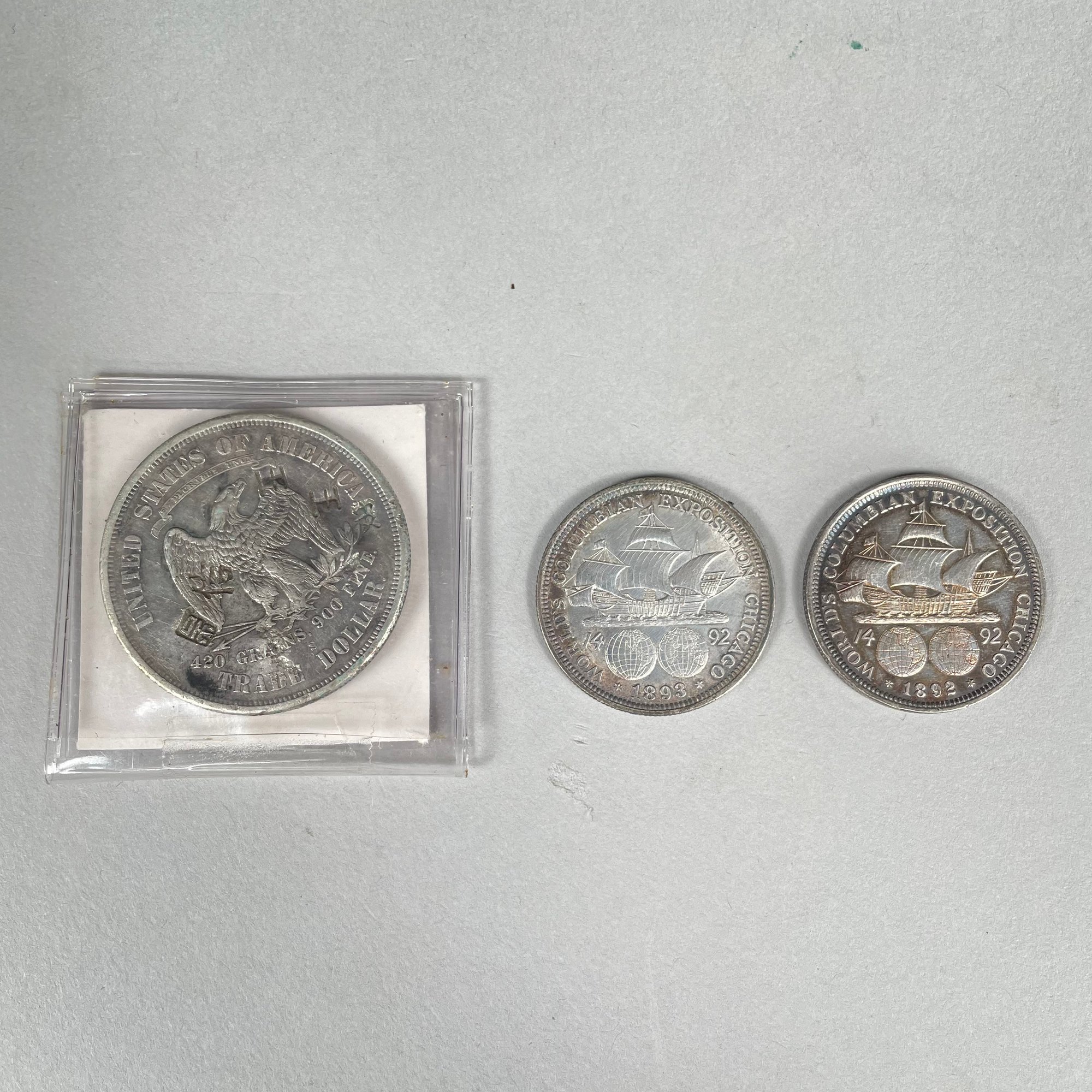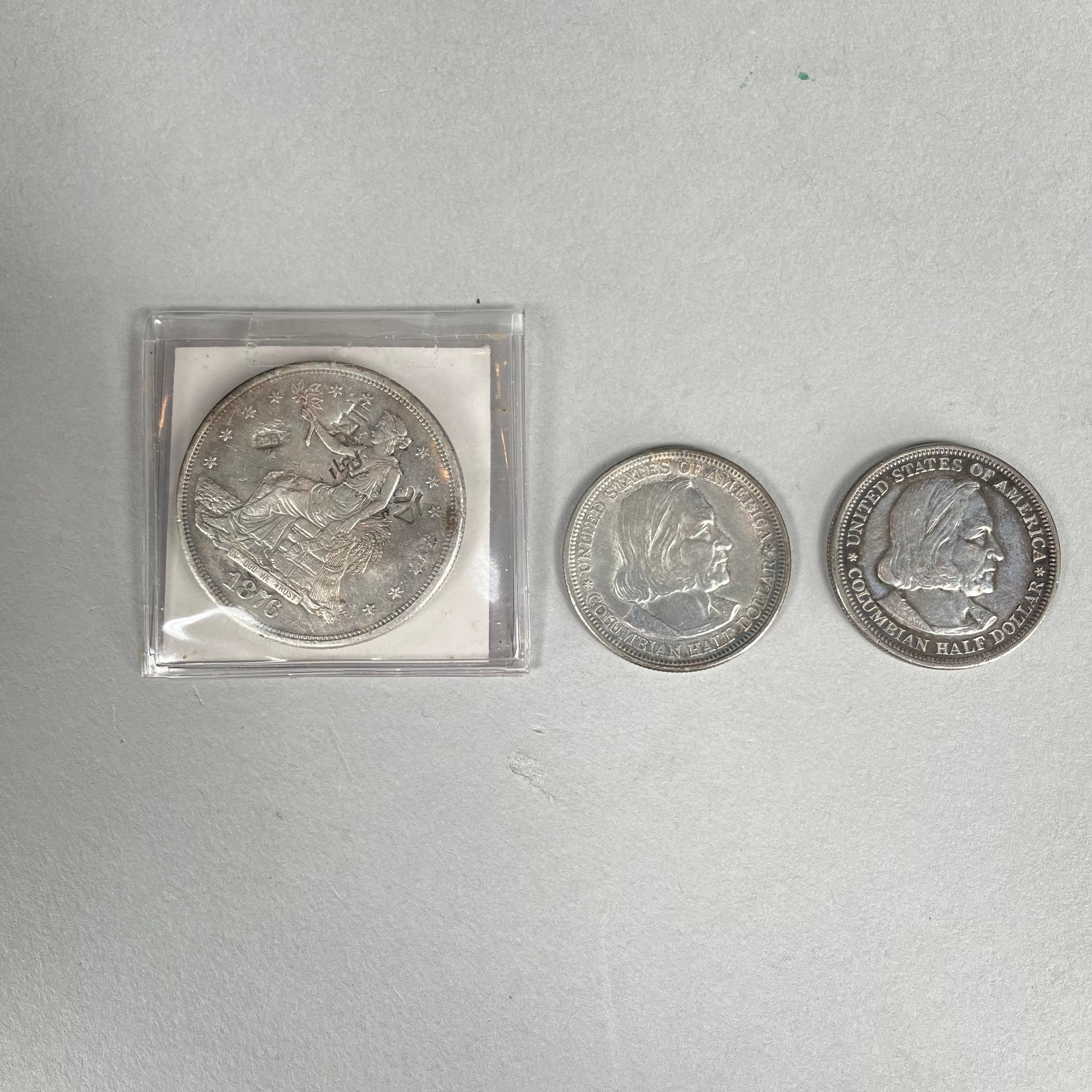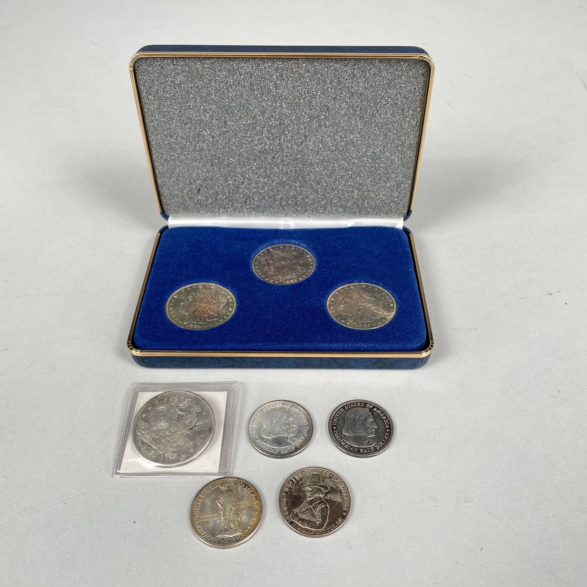 Lot of Four US Commemorative Half Dollars and Four US Silver Dollars, including two 1893 Columbian Exposition Silver Half Dollars; 1920 Pilgrim Silver Half Dollar; 1925 Lexington-Concord Silver Half Dollar; 1876 US Trade Dollar and three Morgan Silver Dollars, 1883-O, 1884-O & 1885-O.
