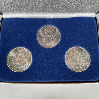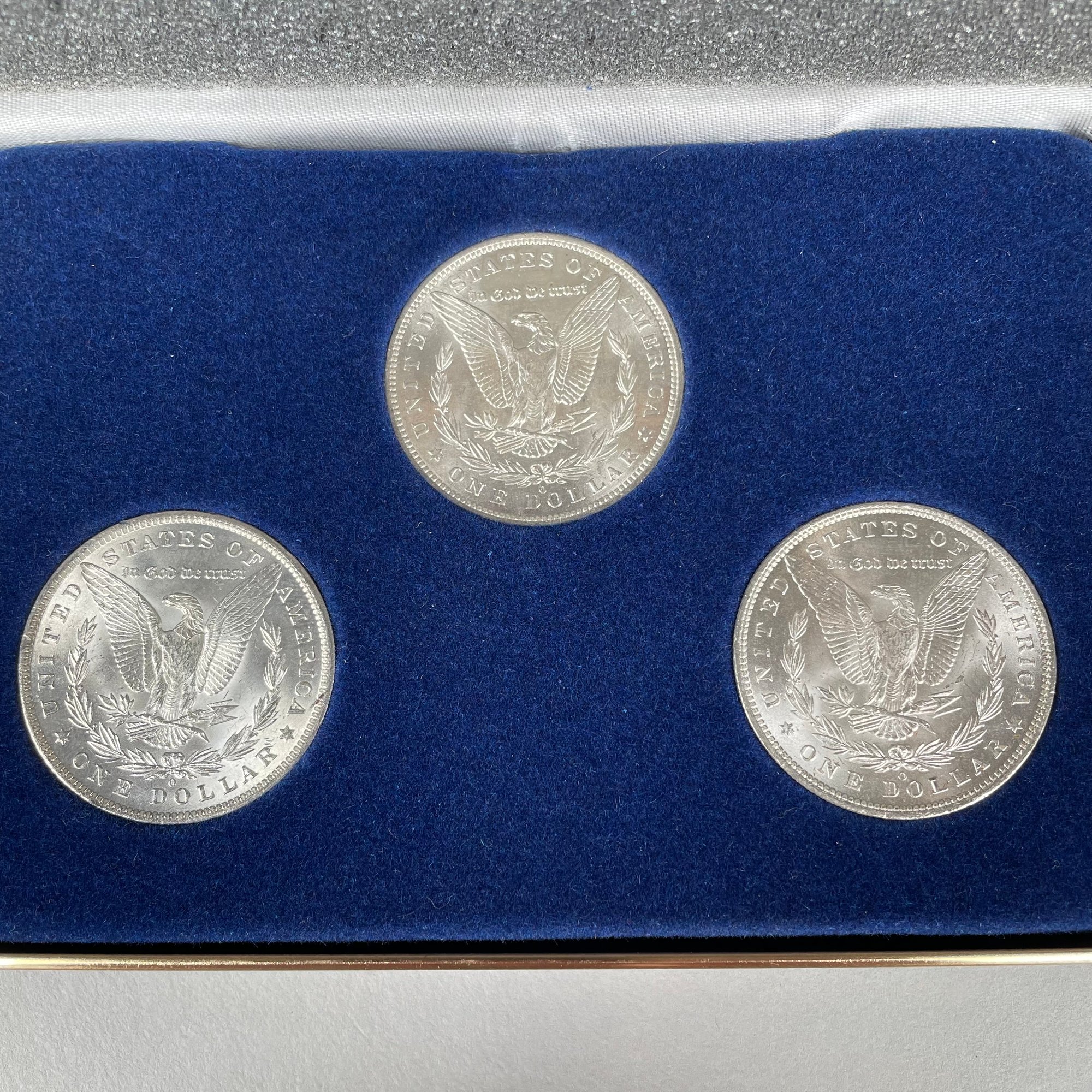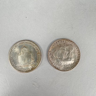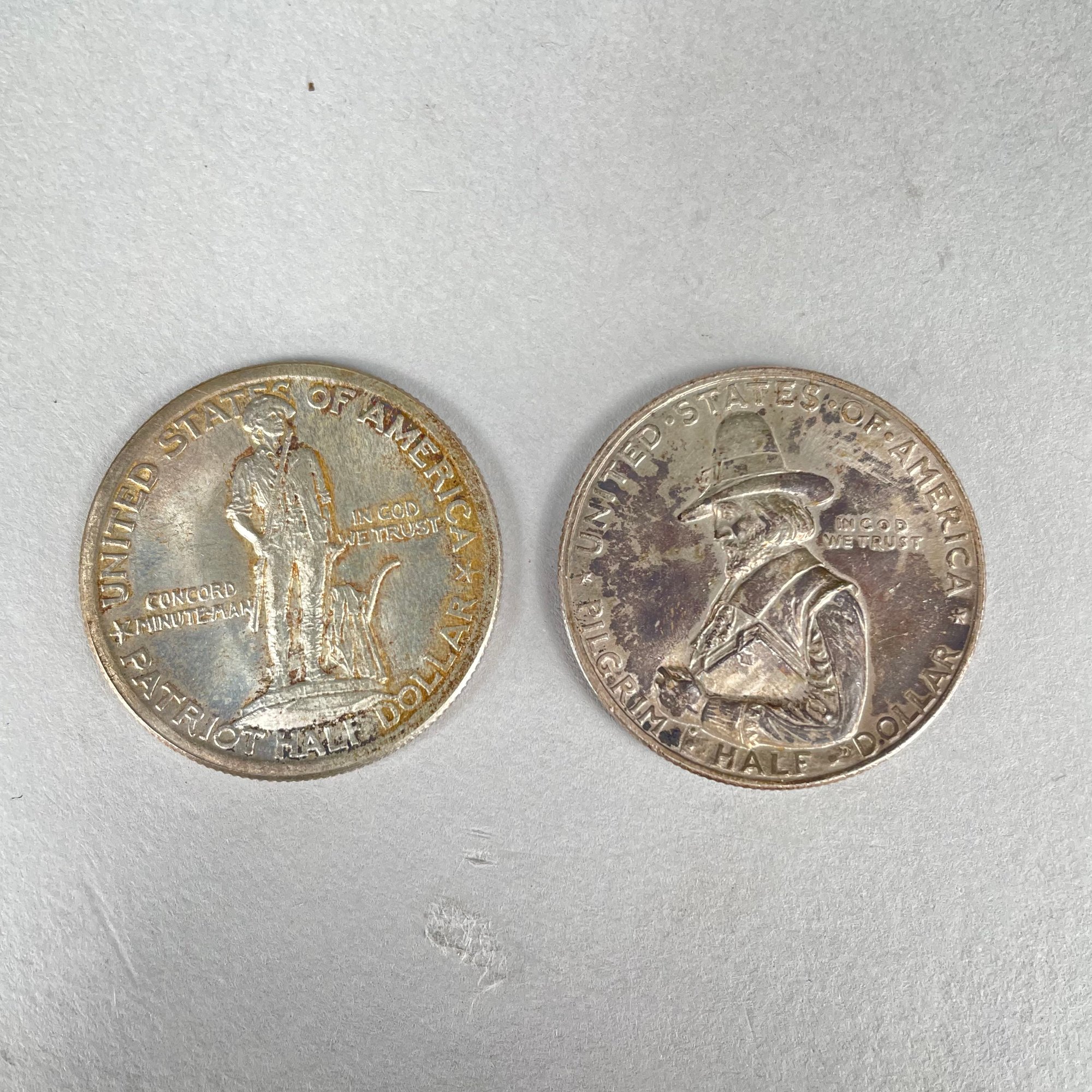 Lot of Four US Commemorative Half Dollars and Four US Silver Dollars, including two 1893 Columbian Exposition Silver Half Dollars; 1920 Pilgrim Silver Half Dollar; 1925 Lexington-Concord Silver Half Dollar; 1876 US Trade Dollar and three Morgan Silver Dollars, 1883-O, 1884-O & 1885-O.