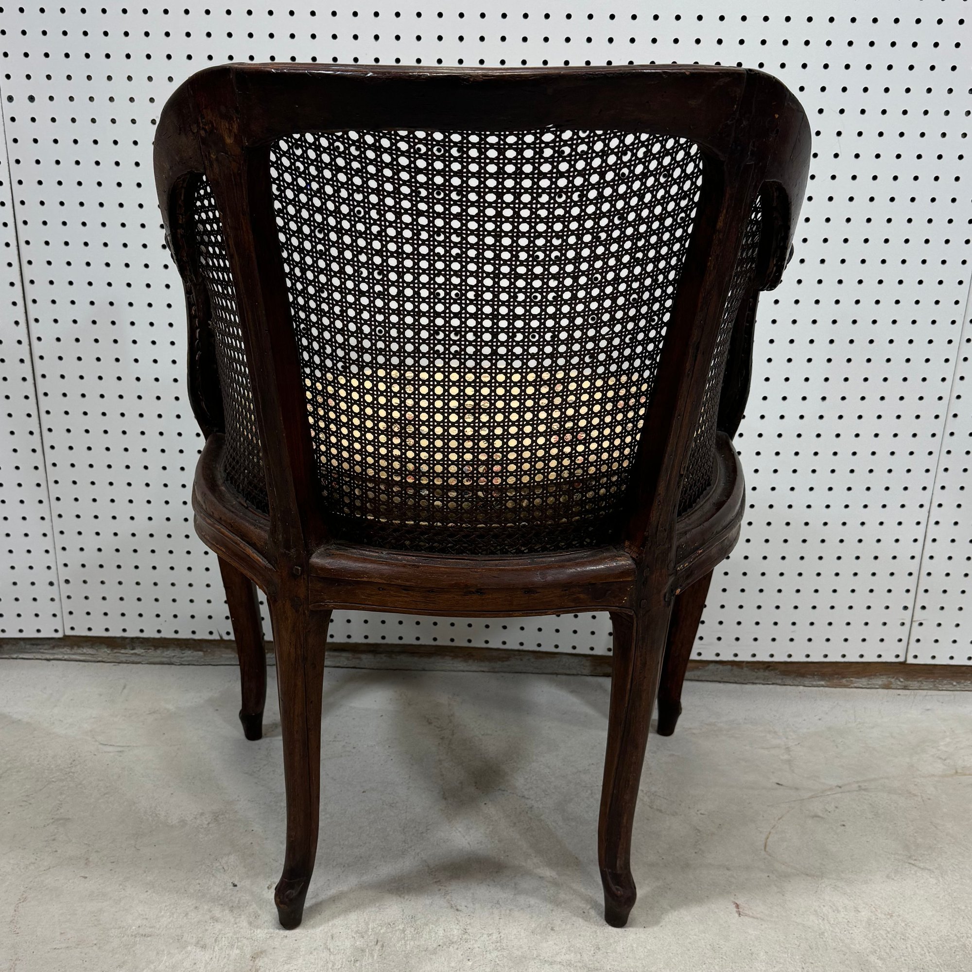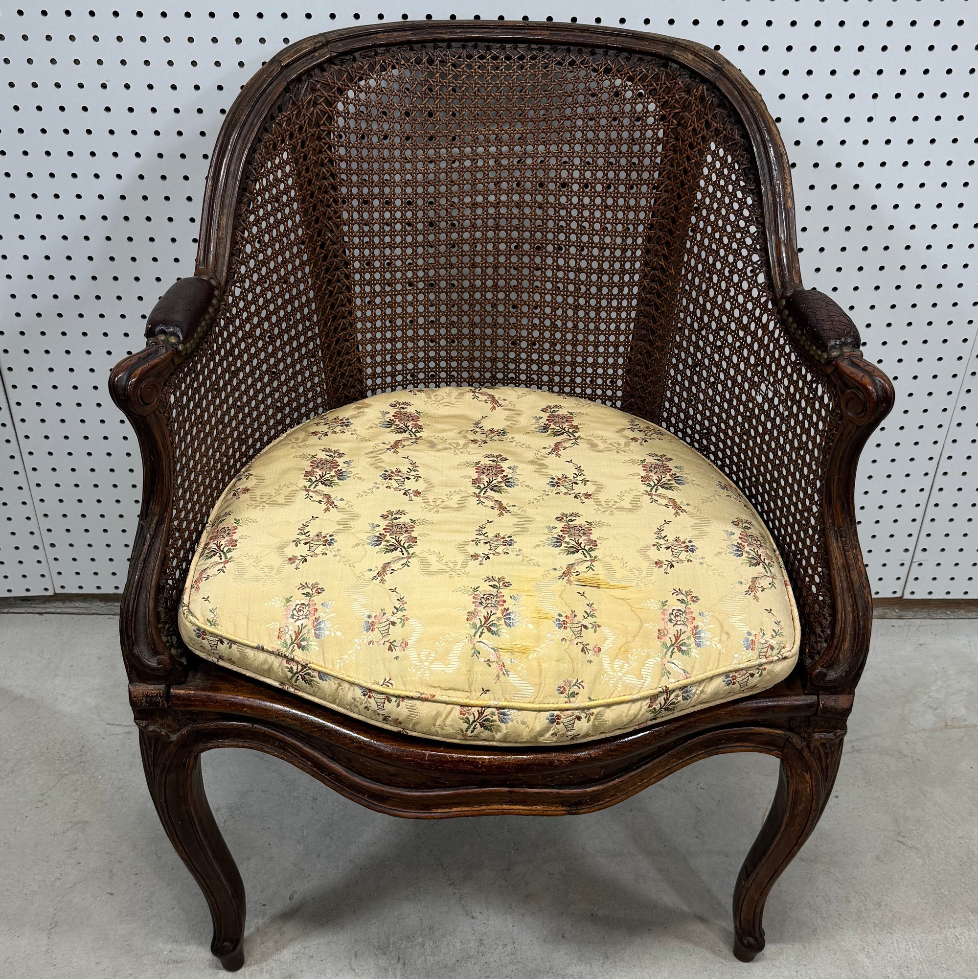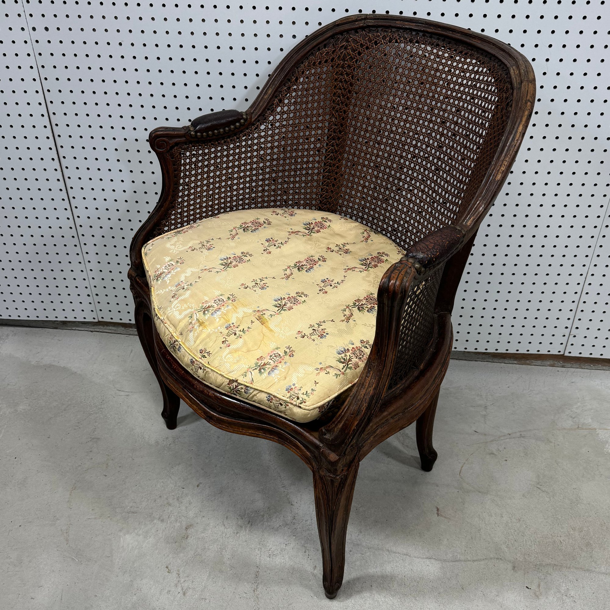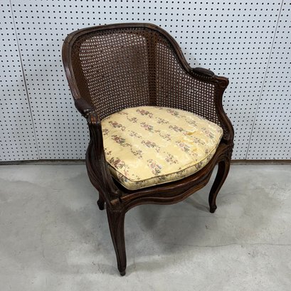 Louis XV Carved Fruitwood and Cane Bergere. The molded curved crest rail above a conforming cane back and continuing to sides with padded arms, the padded seat with loose seat cushion above a molded serpentine apron, raised on cabriole legs.