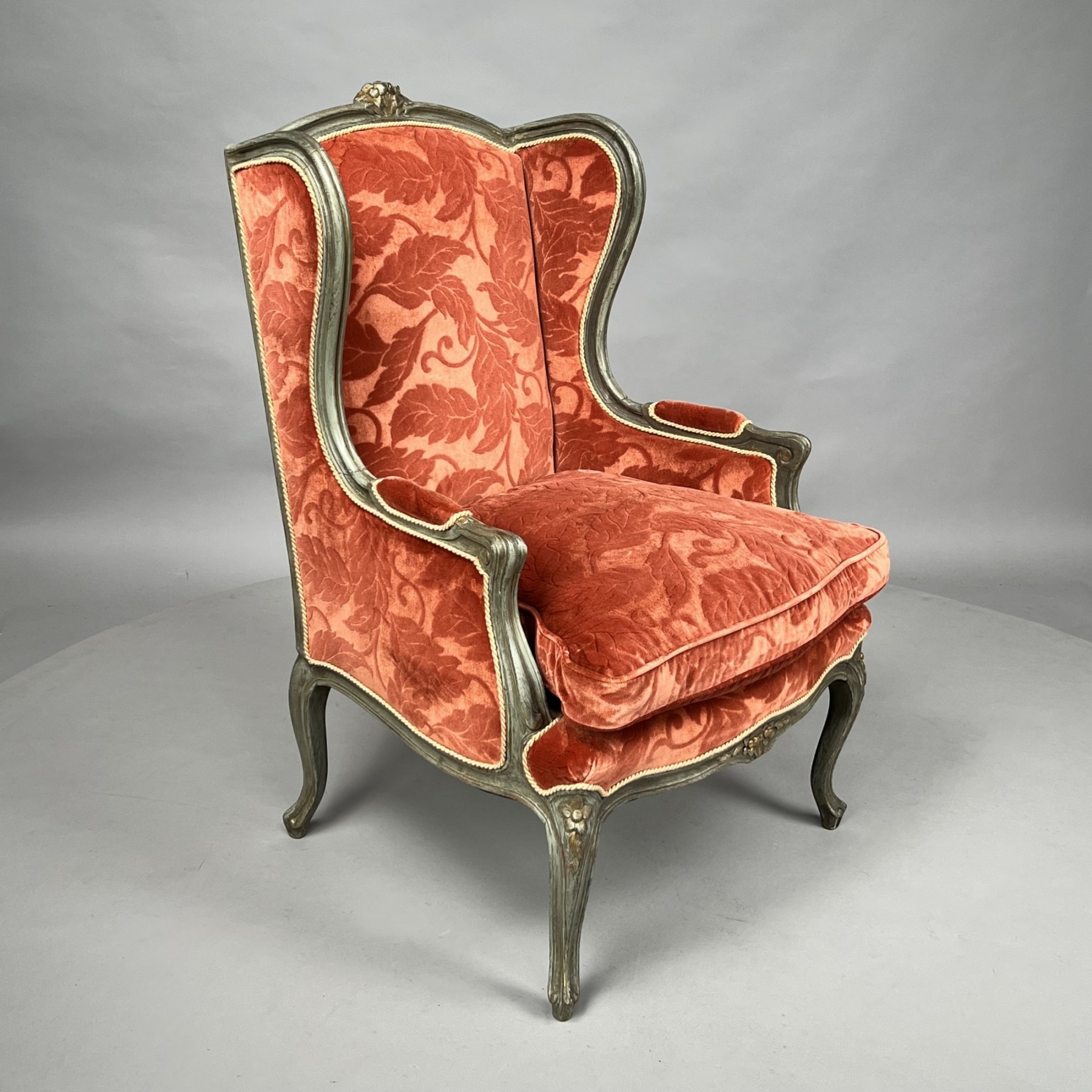 The molded serpentine crest centered with a floral crest, above a padded back and sides continuing to molded and padded arms, the loose seat cushion above a serpentine apron centered with flowers and continuing to cabriole legs.