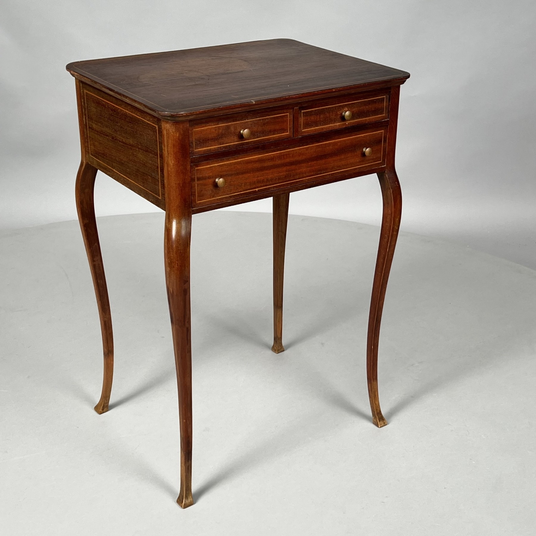 The rectangular top above a pair of aligned drawers over a long drawer, raised on slender cabriole legs.