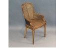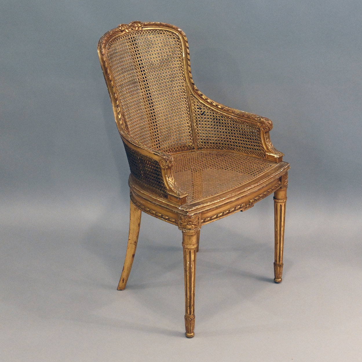 The curved ribbon-carved cane back centering a bow crest and continuing to scroll and acanthus-carved hand grips, the demilune cane seat above a ribbon-carved seat rail, raised on stop-fluted tapered legs headed by rosettes.