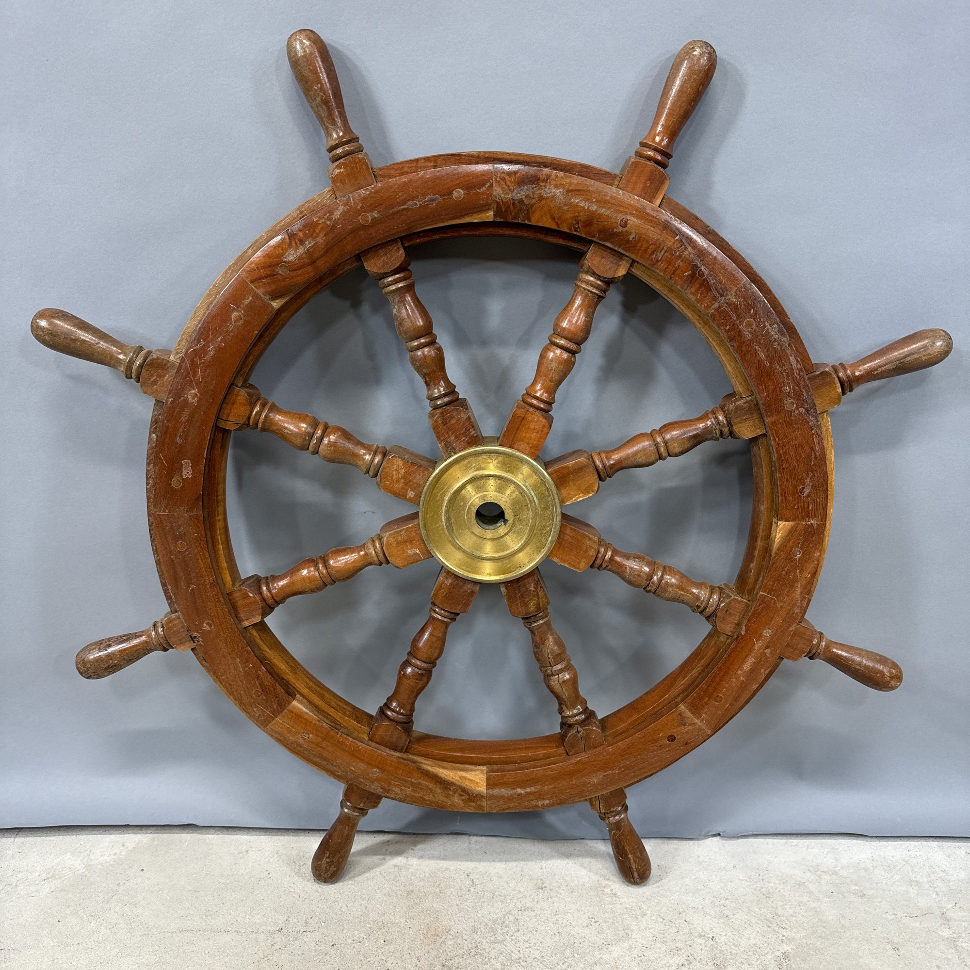 Mahogany and Brass Ship's Wheel. The brass hub within the circular wheel and eight block-and-turned spokes.