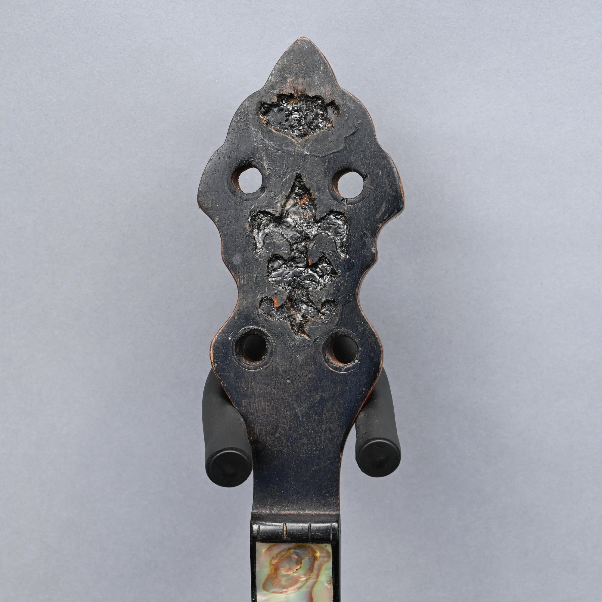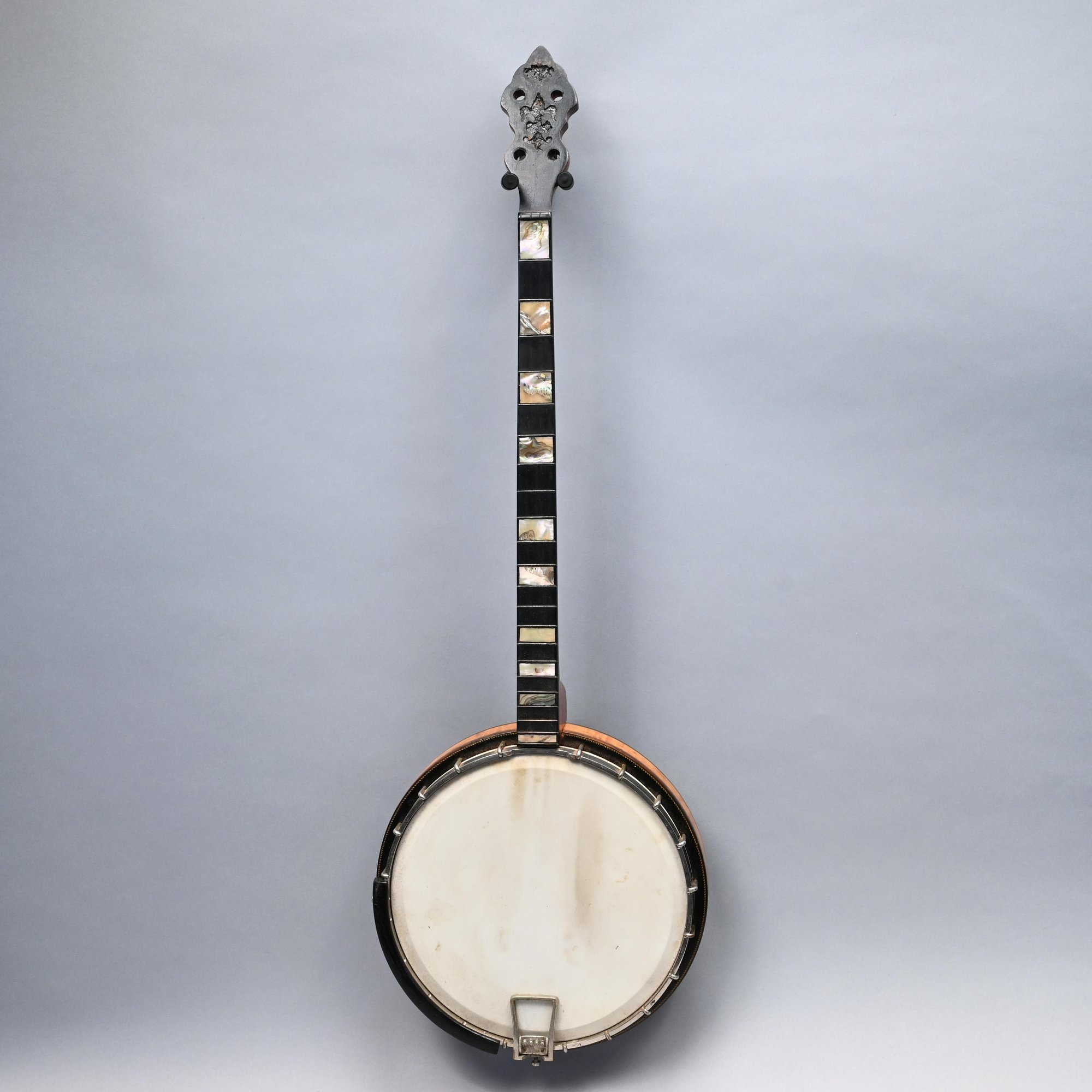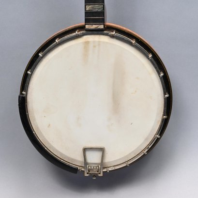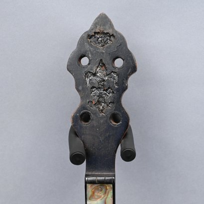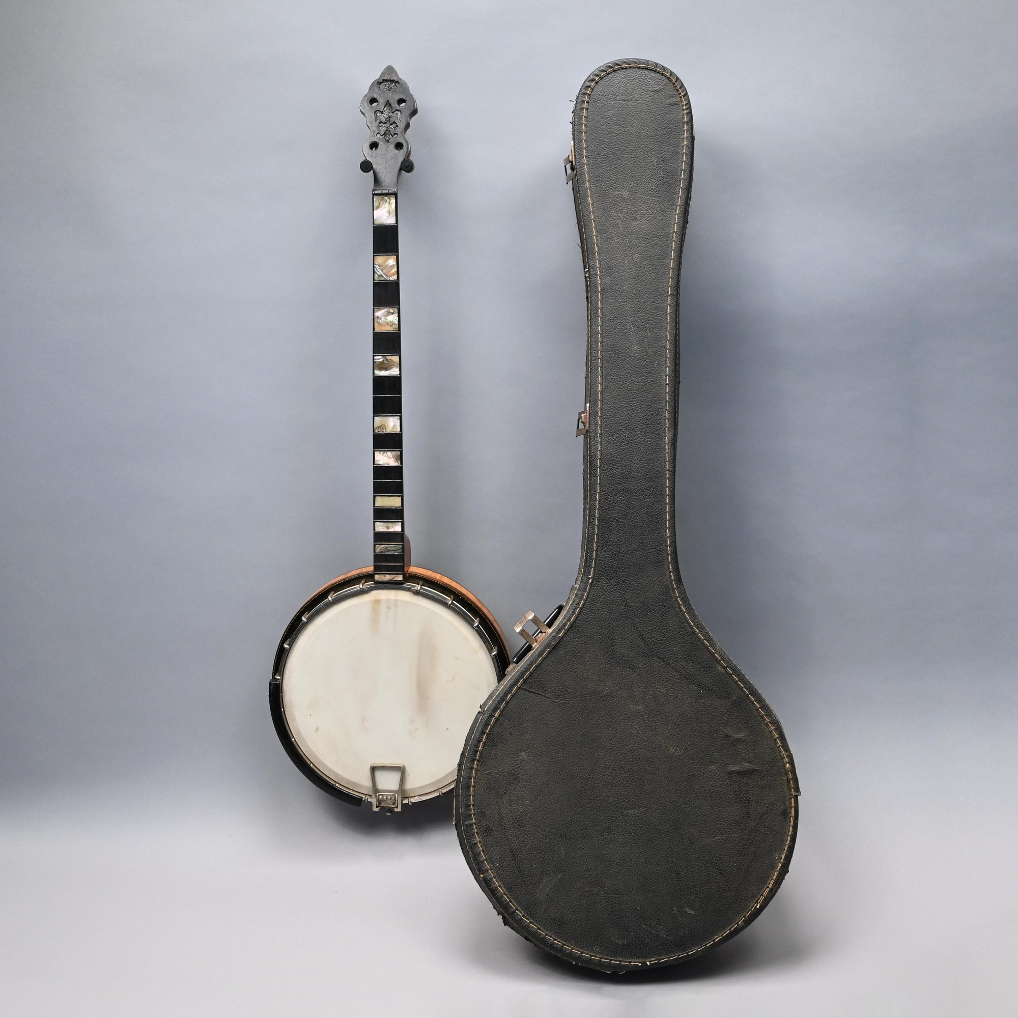 Mahogany and Flame Maple Mother-of-Pearl inlaid Five-String Open-Back Banjo. The peghead once inlaid with a fleur-de-lys, the neck with alternating abalone and ebony frets, stamped "41950" on the dowel stick, printed "REMO/ WEATHER KING/ BANJO/ MADE IN U.S.A." on the drum head; housed in a softside case.