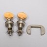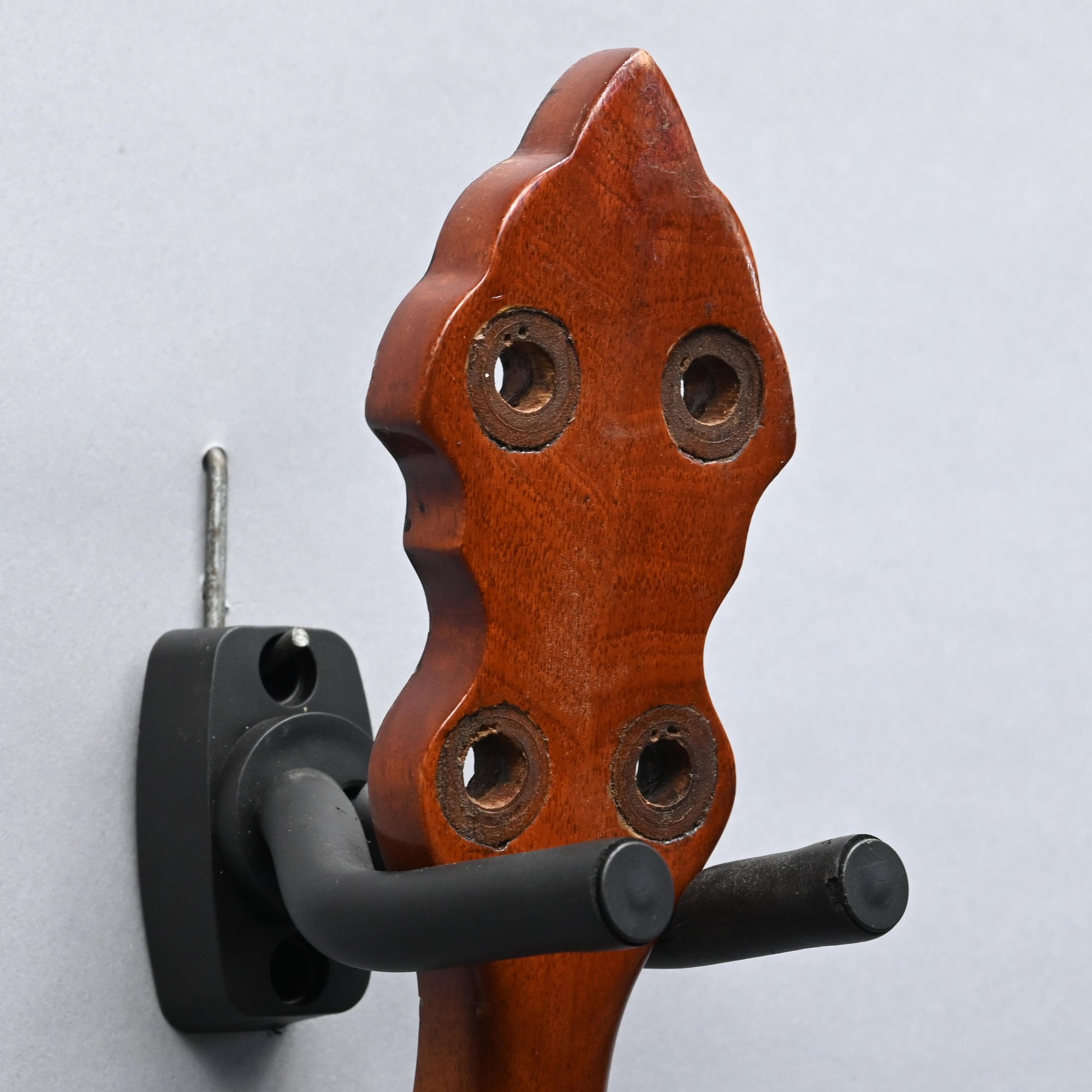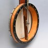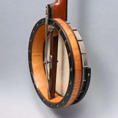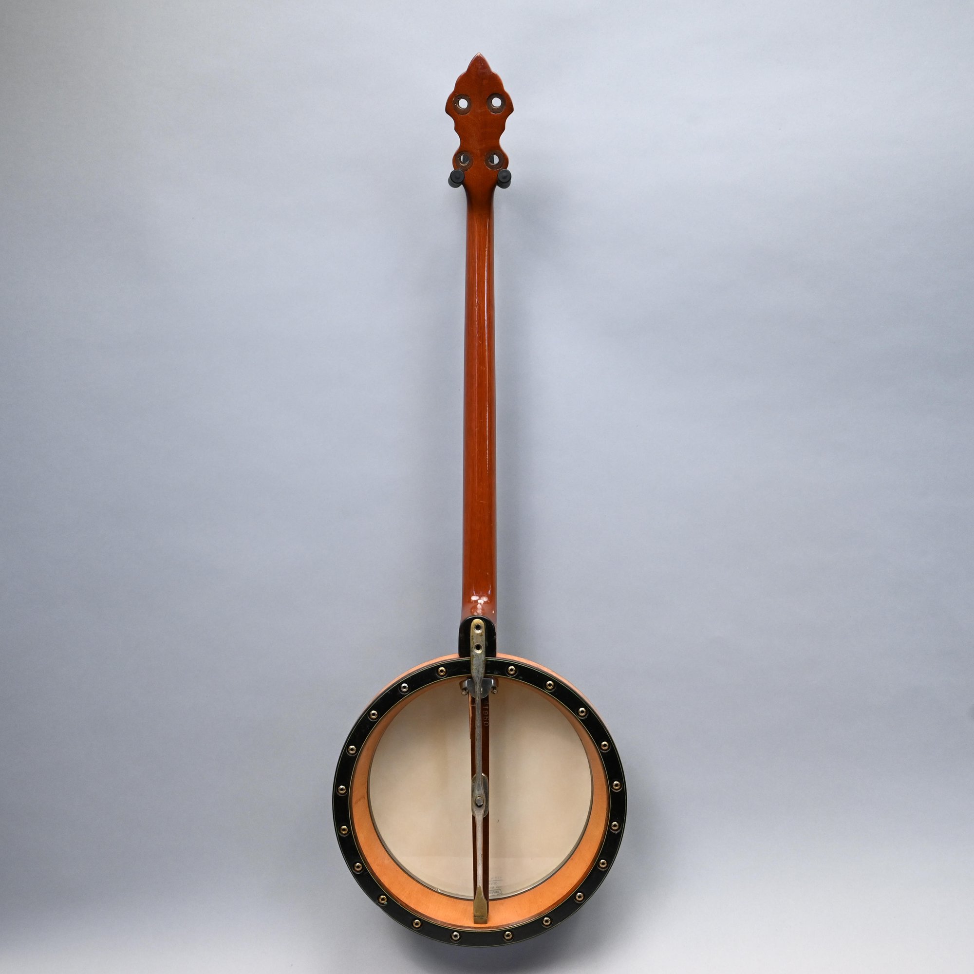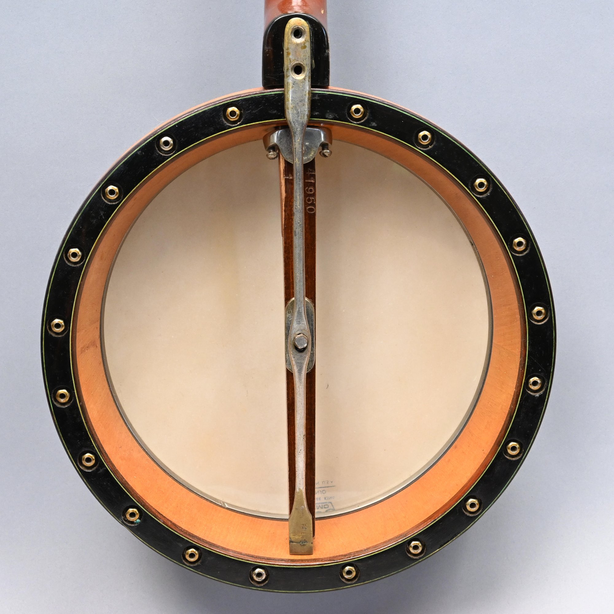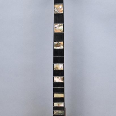 Mahogany and Flame Maple Mother-of-Pearl inlaid Five-String Open-Back Banjo. The peghead once inlaid with a fleur-de-lys, the neck with alternating abalone and ebony frets, stamped "41950" on the dowel stick, printed "REMO/ WEATHER KING/ BANJO/ MADE IN U.S.A." on the drum head; housed in a softside case.