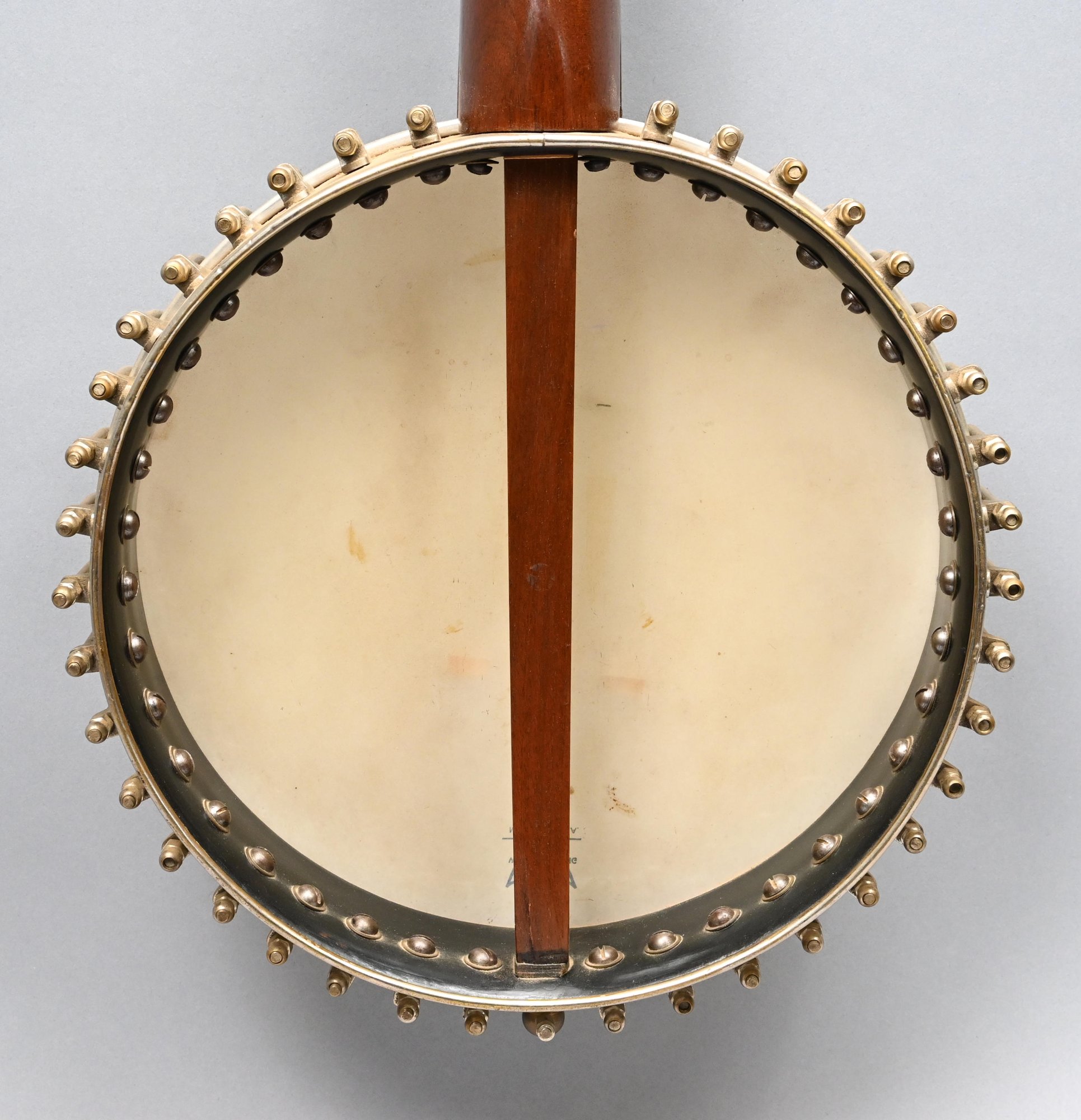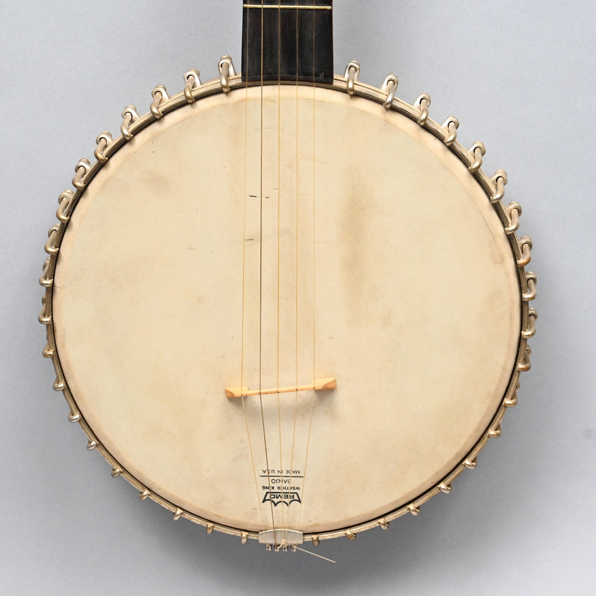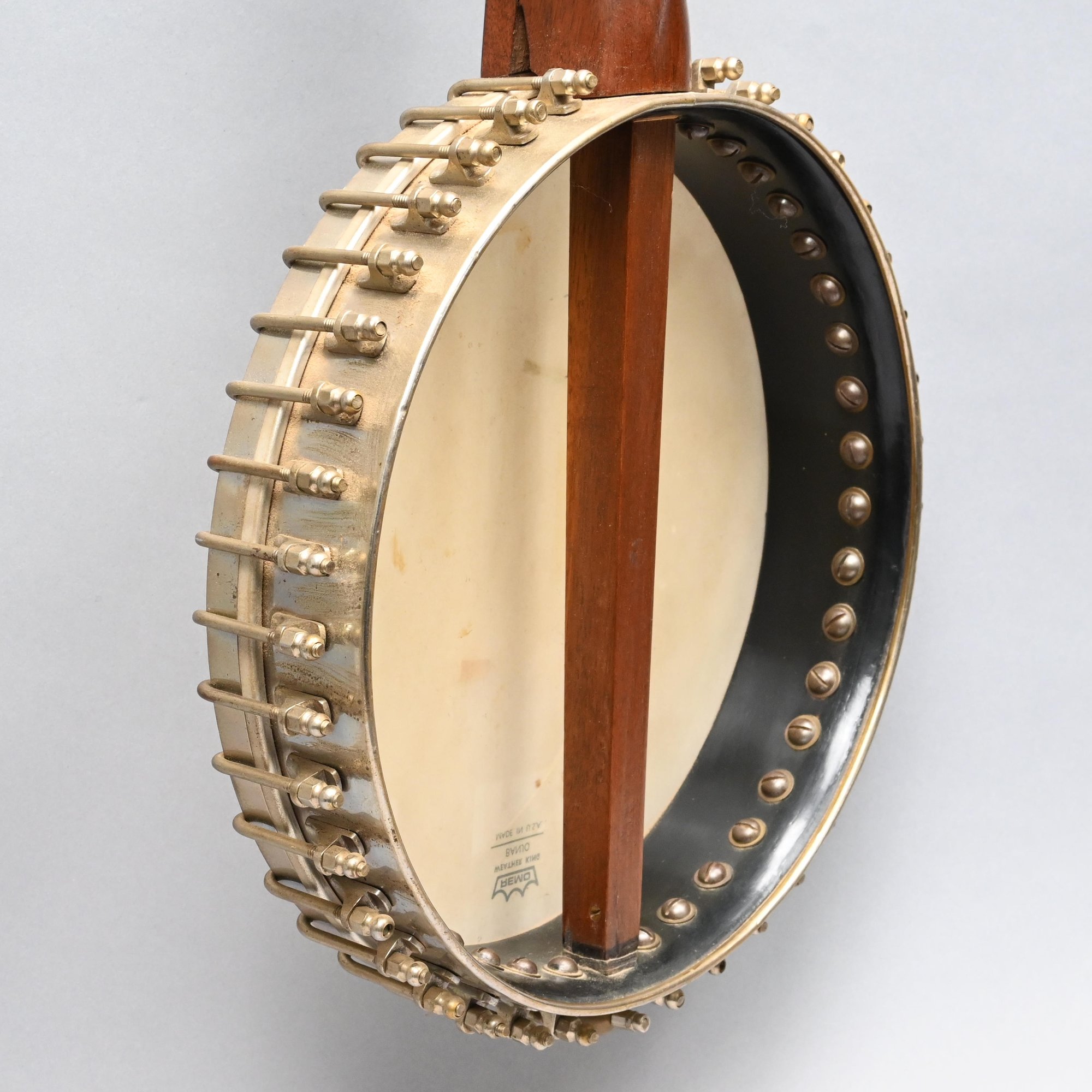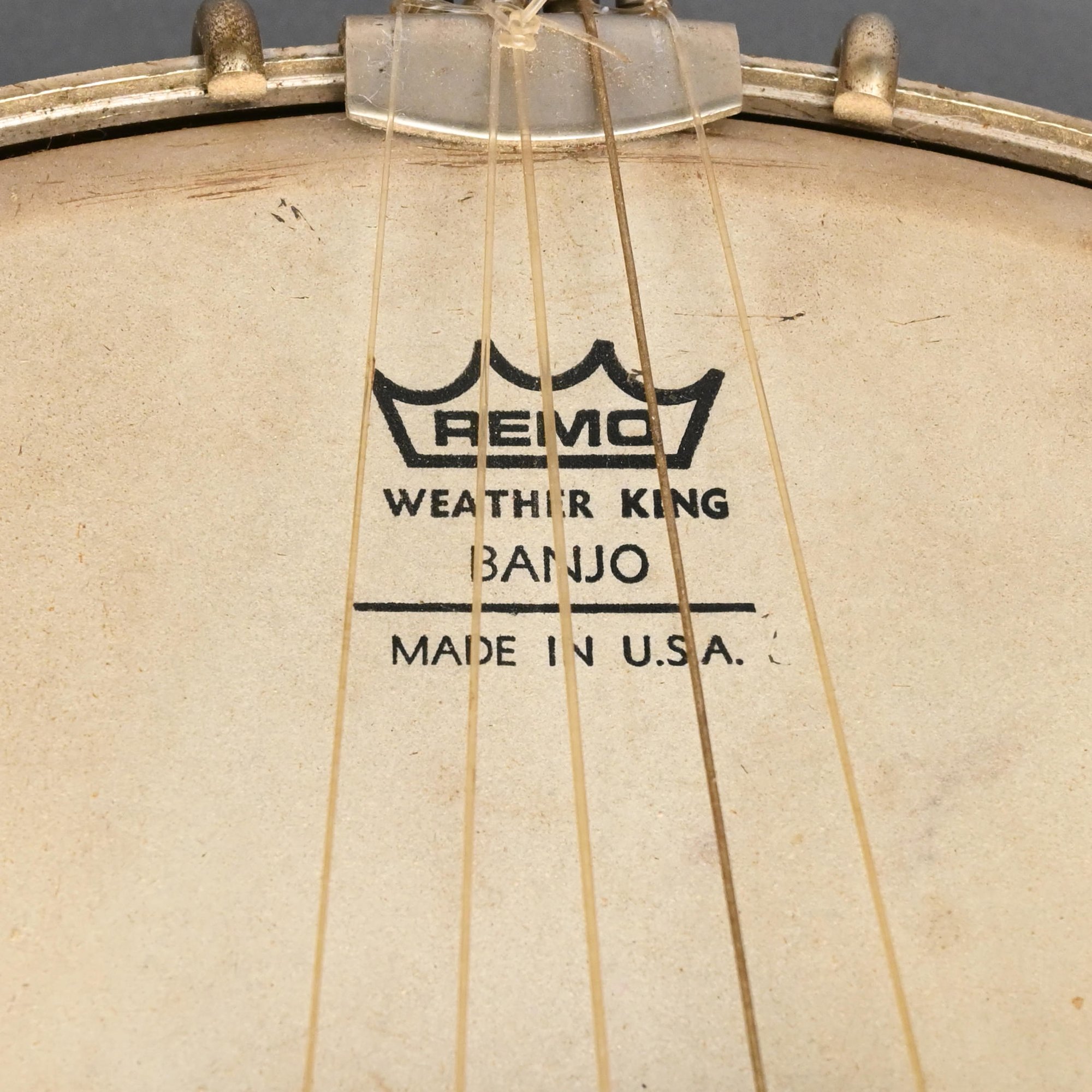 Mahogany Five-String Open-Back Banjo. Printed "REMO/ WEATHER KING/ BANJO/ MADE IN U.S.A." on the drum head.