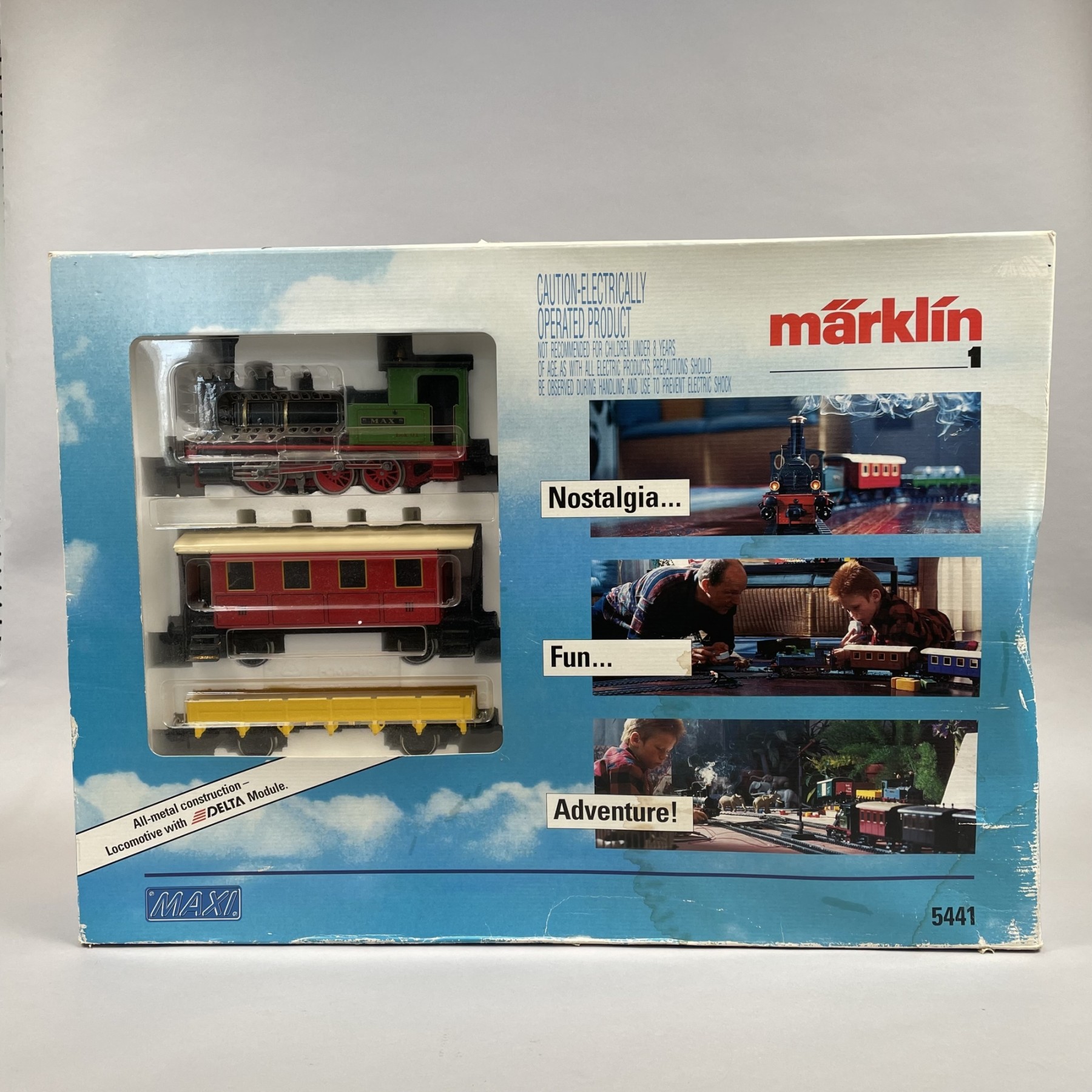 Comprising 1 Rossle Swabian tank locomotive, 1 Swabian red passenger car, 1 yellow low side car, two straight track sections, twelve curved track sections, power transformer with 30 VA output, and three manuals.