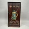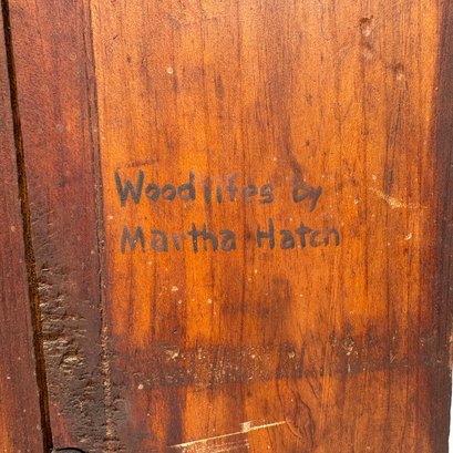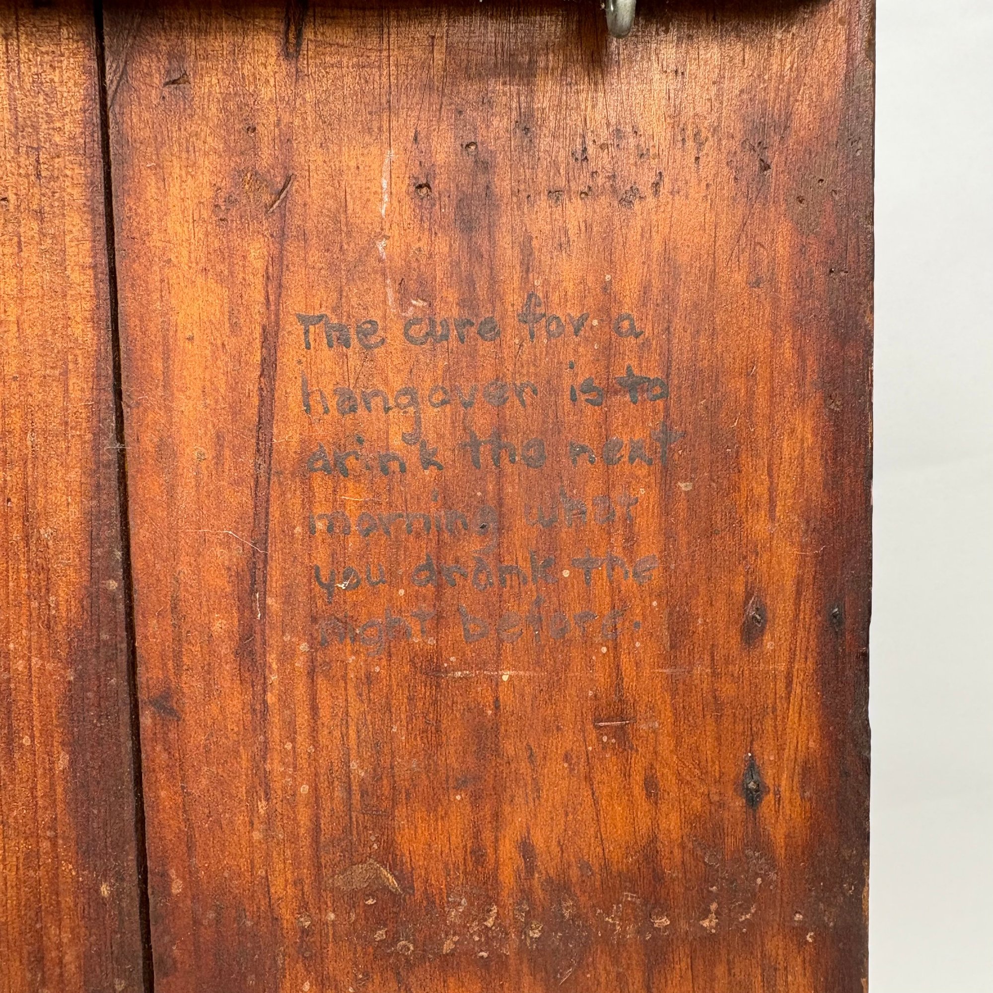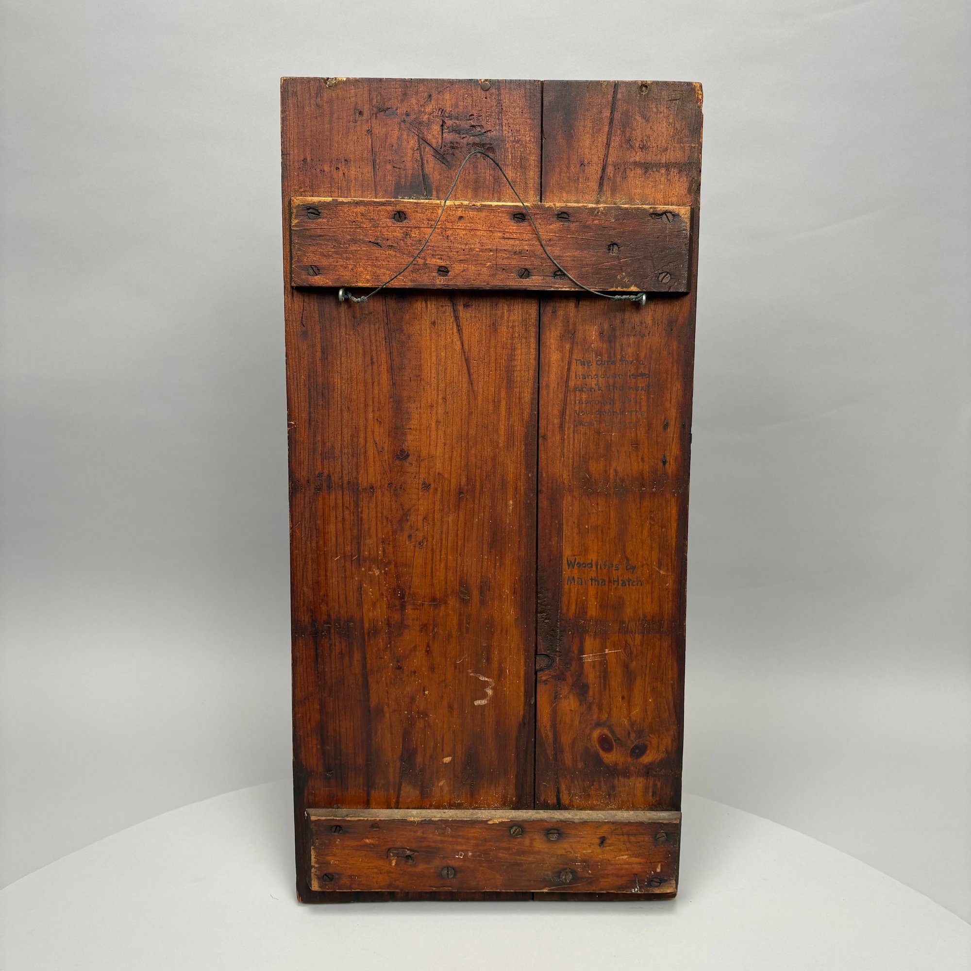 Martha Hatch "Woodlifes," Paint-Decorated Pine Cabinet Door. Painted with a picture of a stein and inscribed "hast du kater ist mein Rath trinke truly was du trankst spat" (The cure for a hangover is to drink the next morning what you drank the night before) and signed "Woodlifes by/ Martha Hatch."
