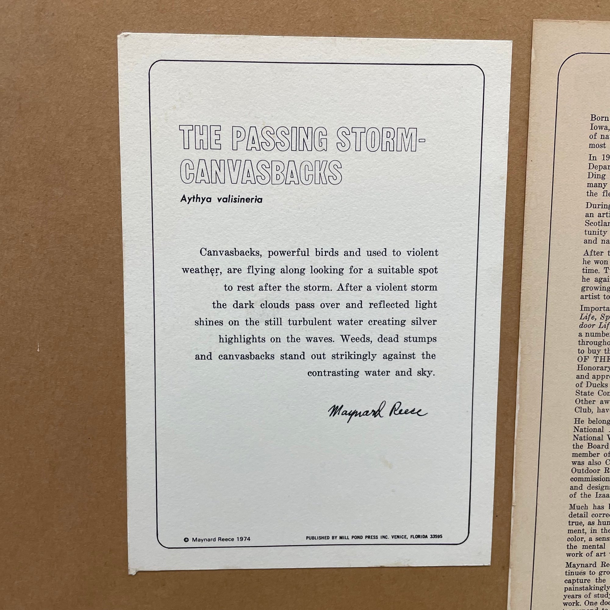 Maynard Reece (1920-2020). "The Passing Storm- Canvasbacks," 1974. Limited edition print number 849/ 950. Signed in the print lower left, numbered in pencil "849/ 950" lower left and signed "Maynard Reece" lower right, (7.625 x 11.125 inches, sight).