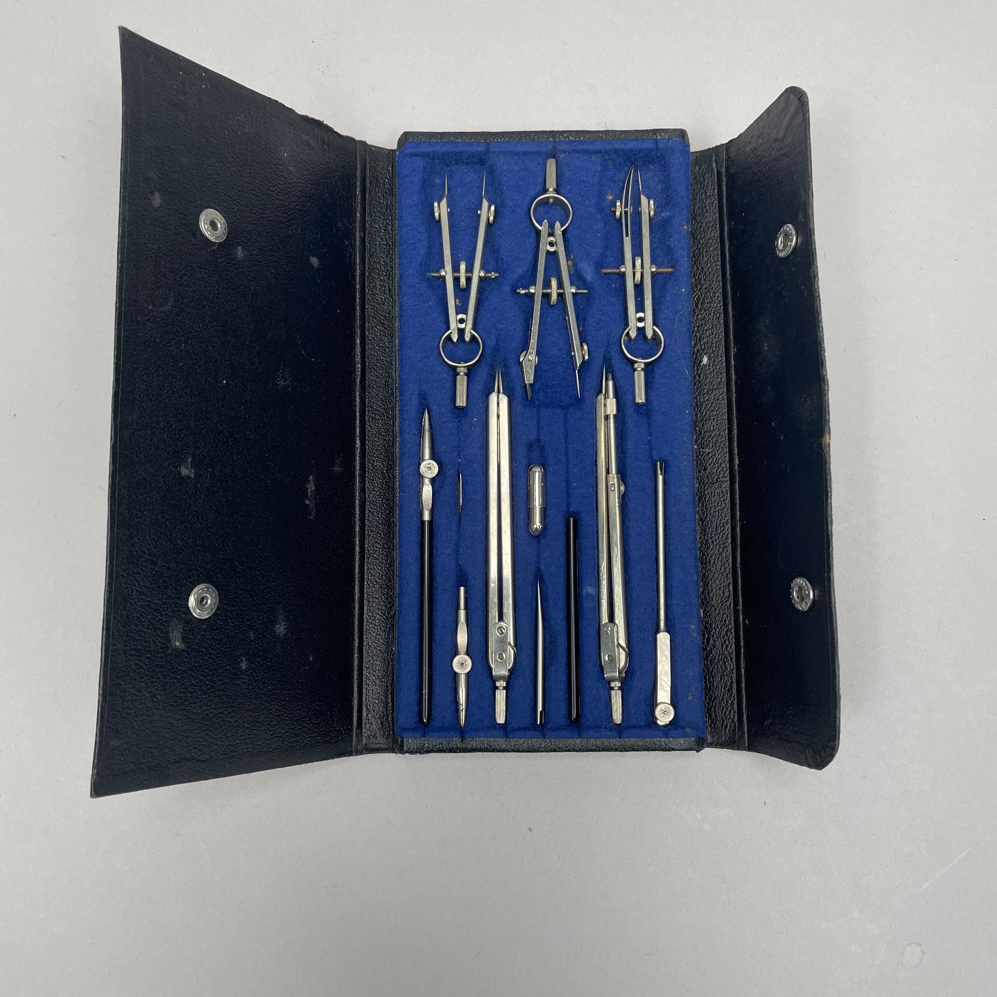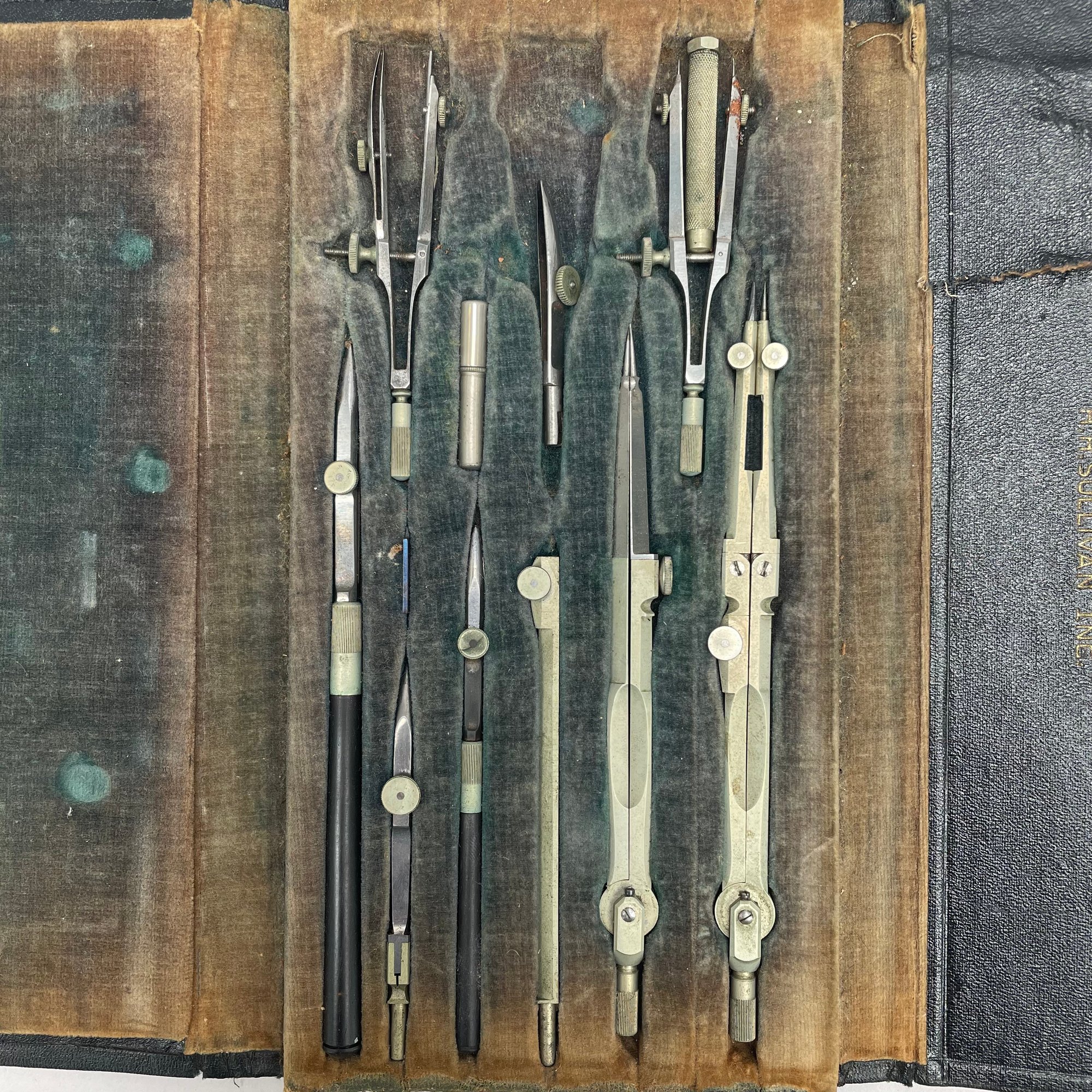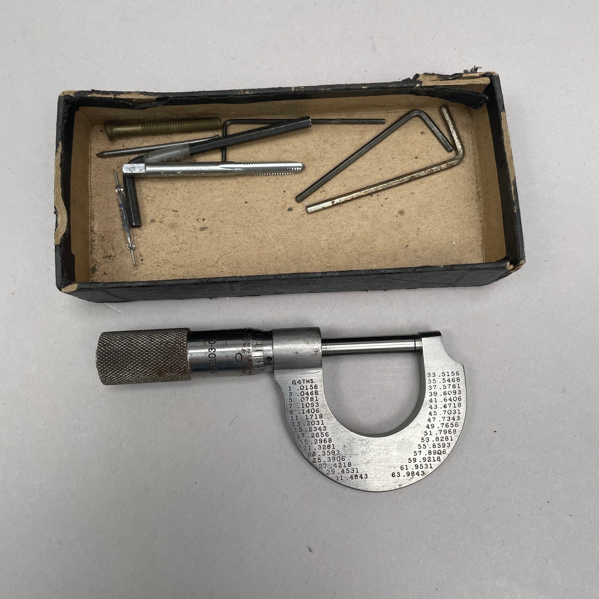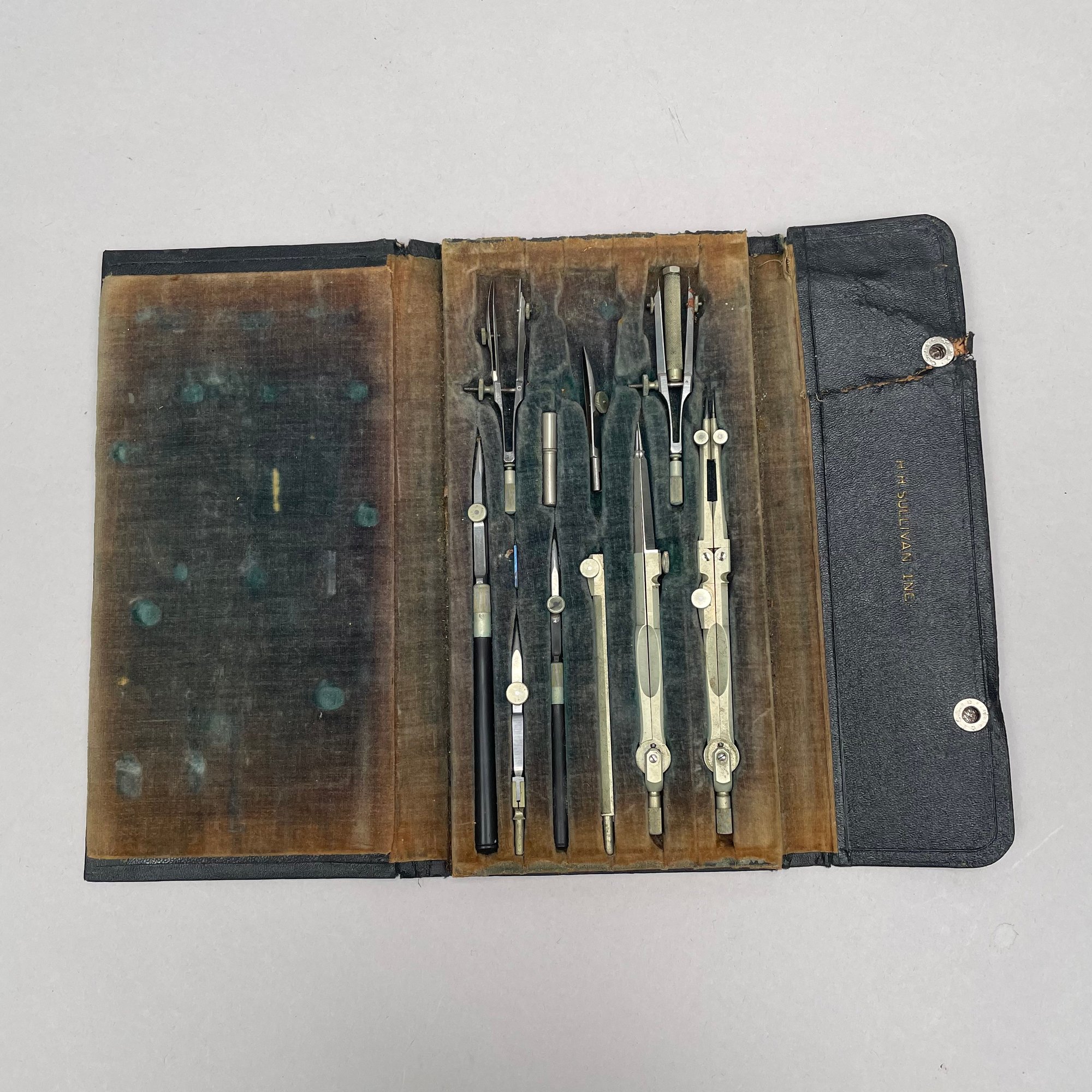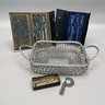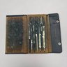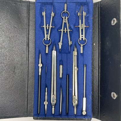 Metal Woven Basket, Two Sets of Cased Drafting Tools and a Micrometer. One drafting set marked "H.H. SULLIVAN, INC.," the micrometer "THE L.S. STARRETT CO., ATHOL, MASS. U.S.A."