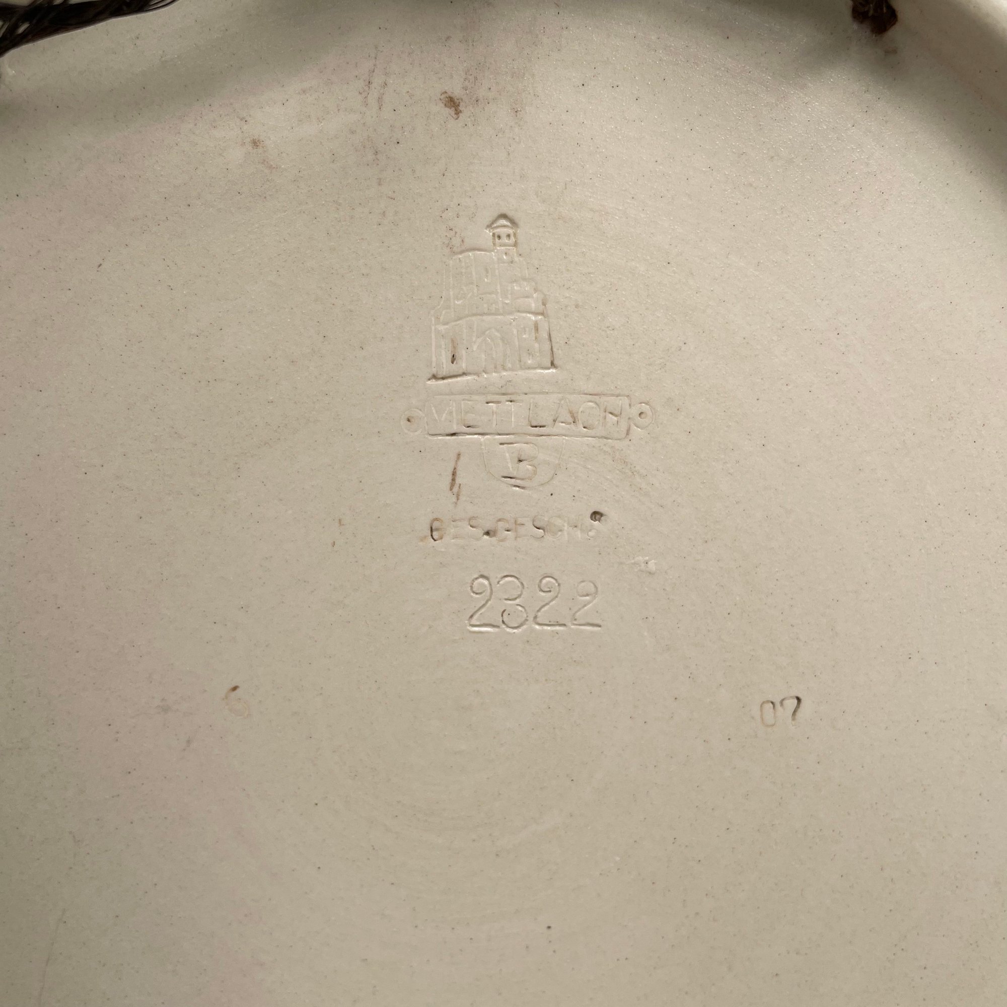 Mettlach Pottery Charger #2322, 1907. Impressed abbey mark, "METTLACH/ VB/ GES.GESCH" and number "2322."