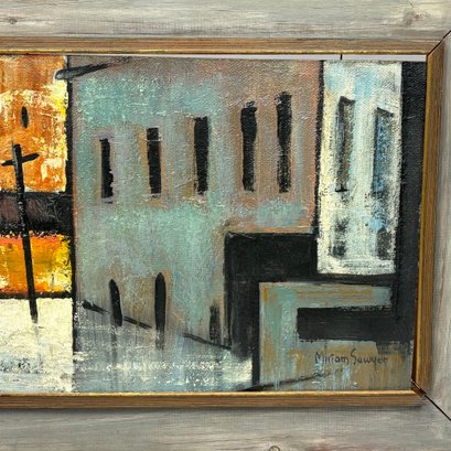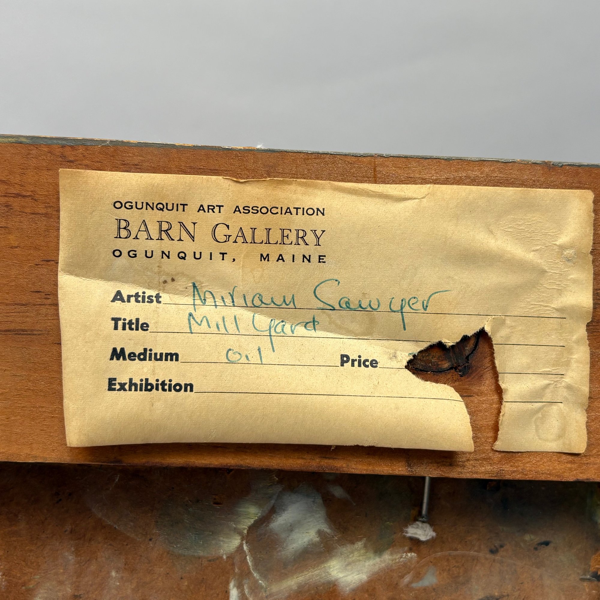 Miriam Sawyer (1913-1979, America). "Mill Yard." Oil on Masonite, signed "Miriam Sawyer" lower right, (13 x 28.875 inches).