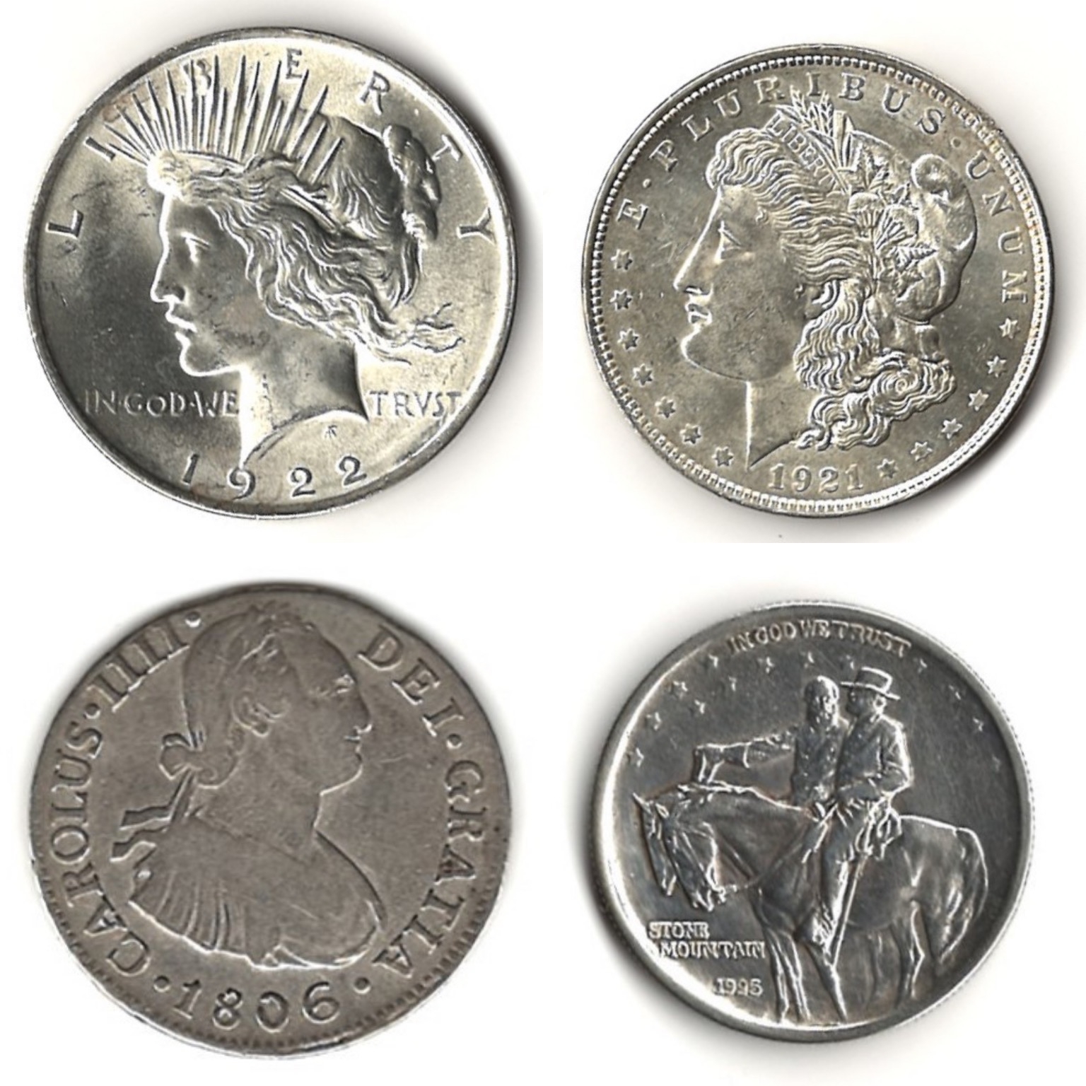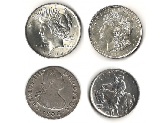 1922 Peace Dollar, 1921 Morgan Silver Dollar, 1925 Stone Mountain Commemorative Silver Half Dollar, 1938 D Buffalo 5c, 1806 2 Reales Carolus IIII (Peru).