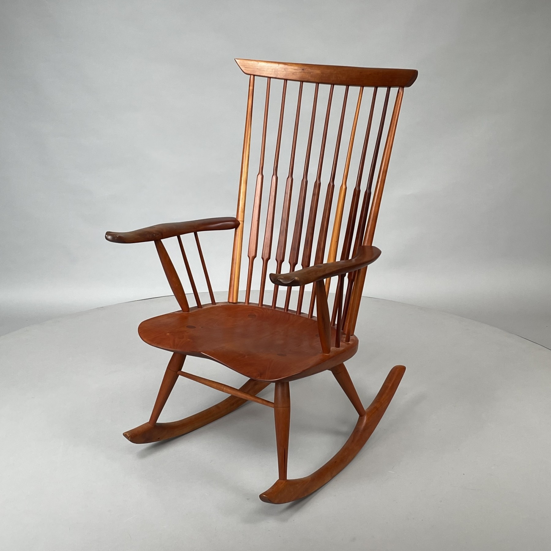 The bowed crestrail above a nine spindle back flanked by shaped arms with carved knuckles over a saddle seat raised on turned legs on shaped rockers. Richard C. Ruppel, Randolph, NH 1995.