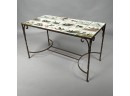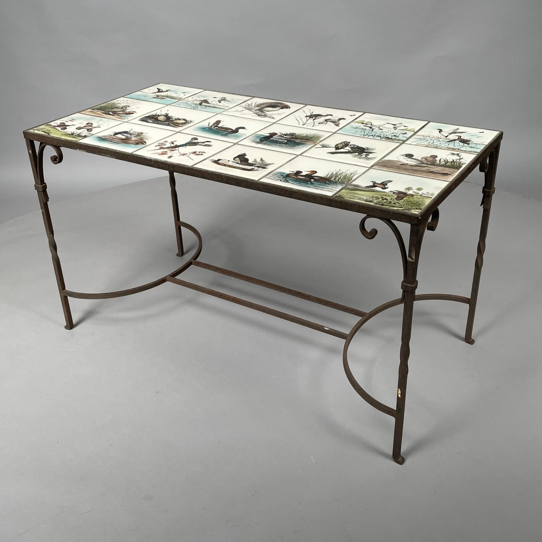 The rectangular inset tile top 18 with different tiles with assorted gamebirds, waterfowl and owls, raised on square twisted legs with scrolled returns, joined by a double H-stretcher.