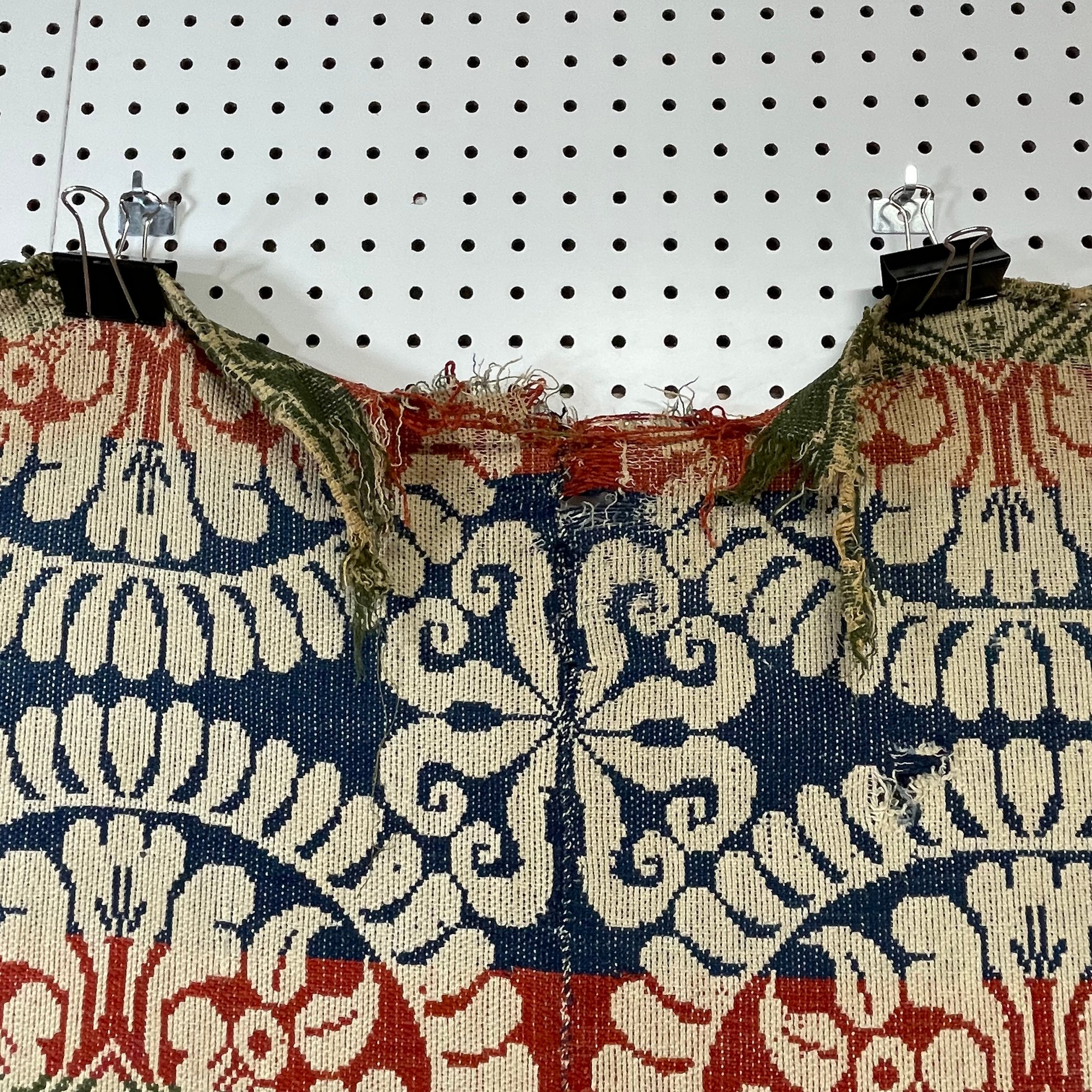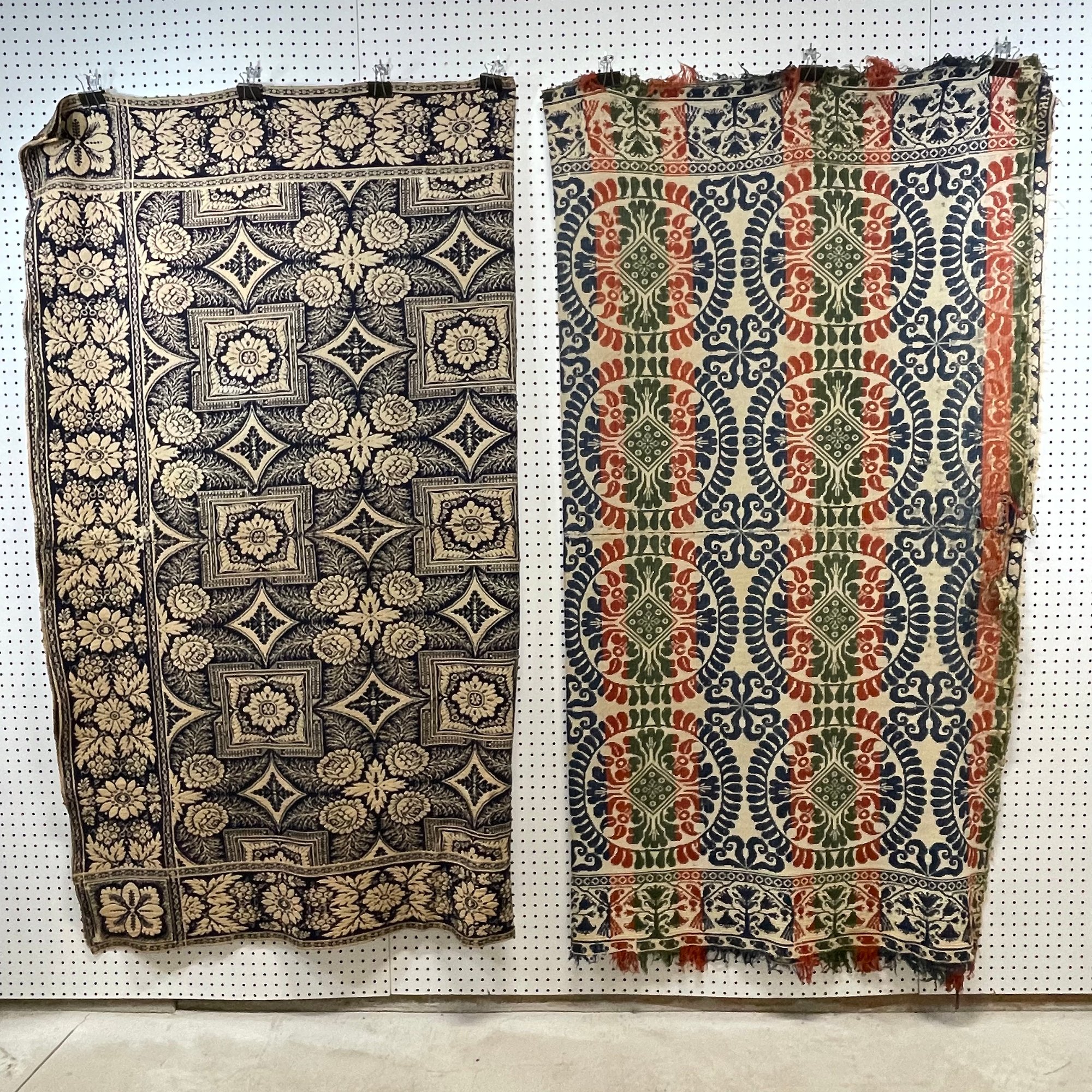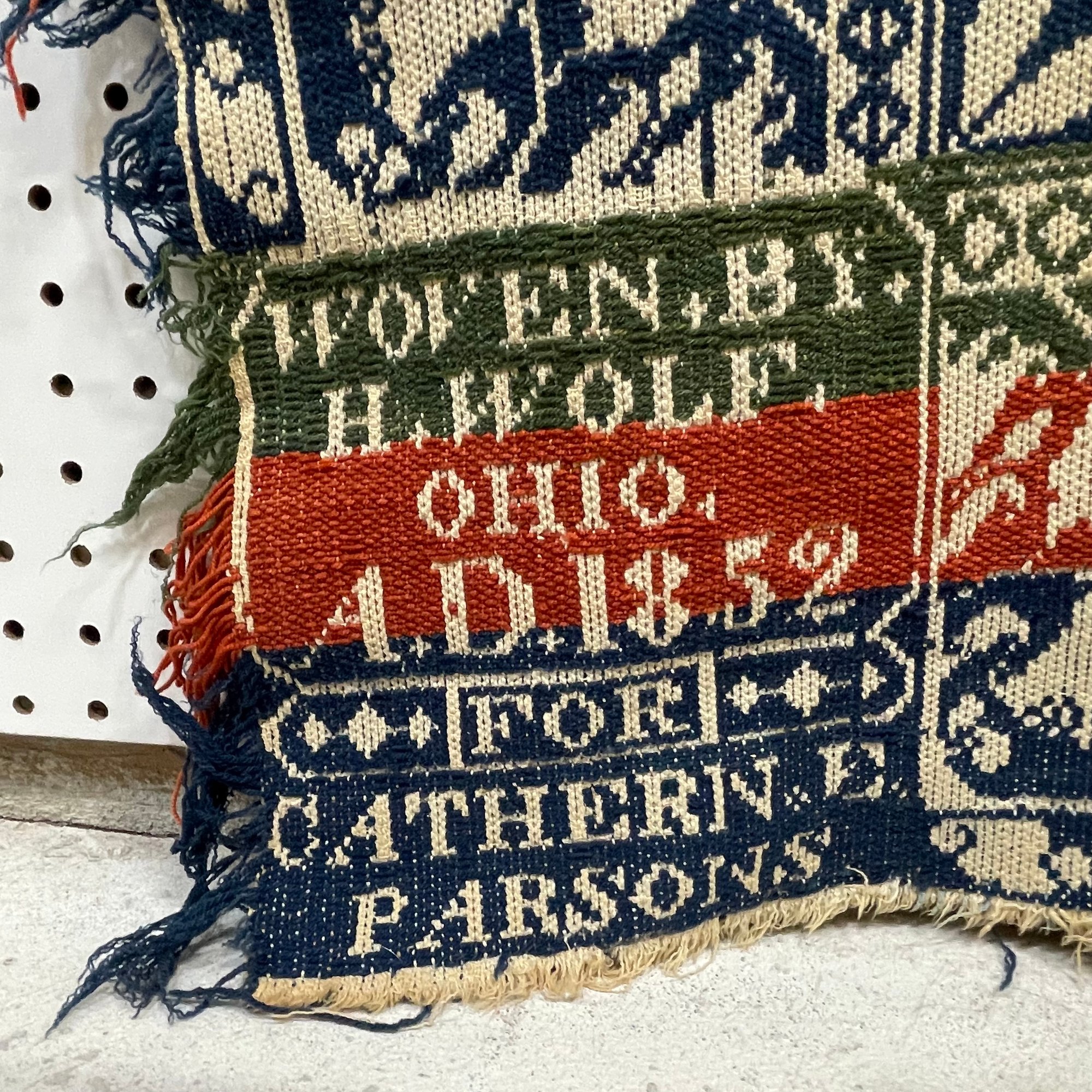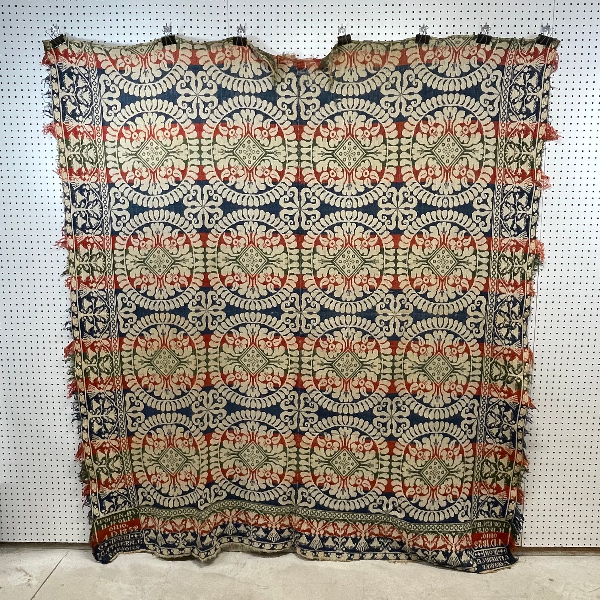 Ohio Three-Color Woven Jacquard Coverlet, 1852 and a Two-Color Coverlet. The red, blue and green coverlet woven with two signature blocks signed "WOVEN BY/ H. WOLF/ OHIO/ AD 1852/ FOR/ CATHERN.E/ PARSONS;" the blue and white coverlet unsigned.