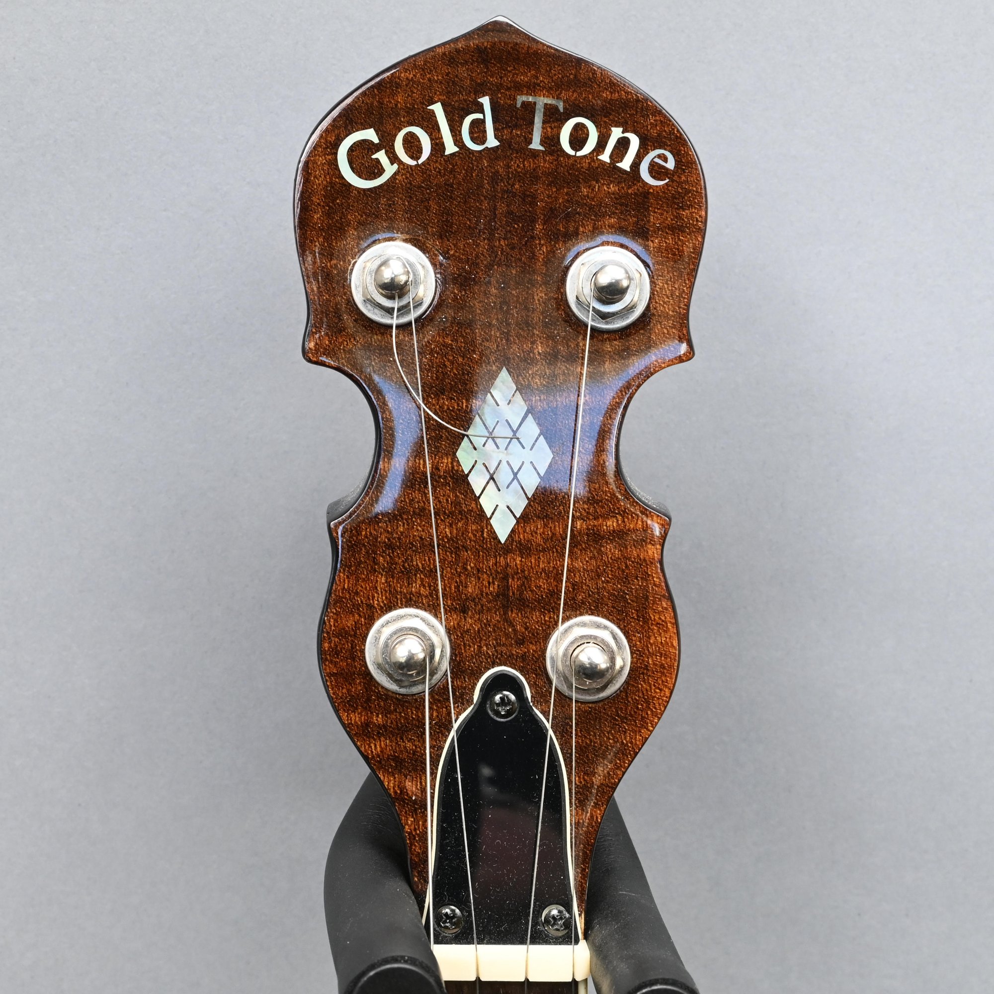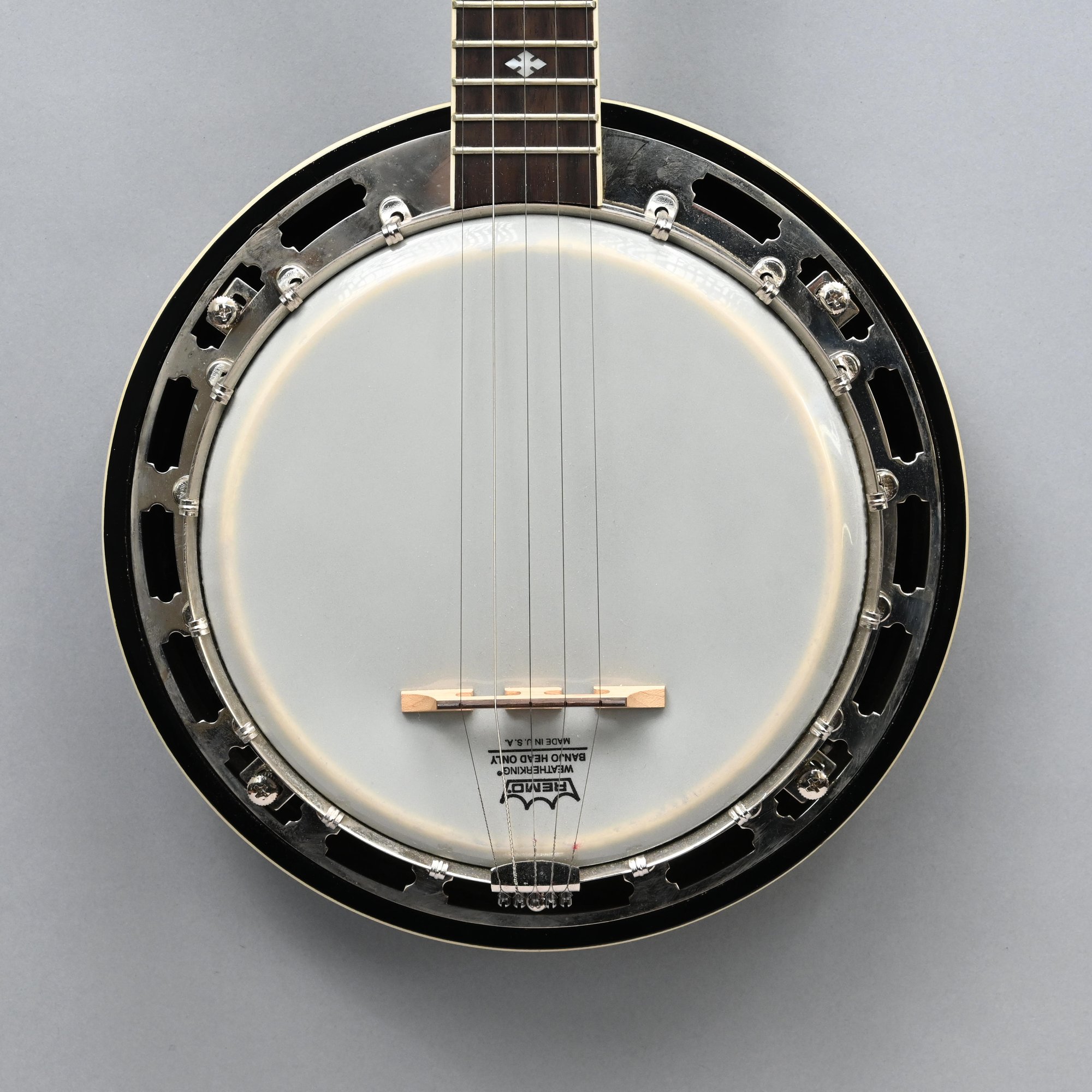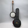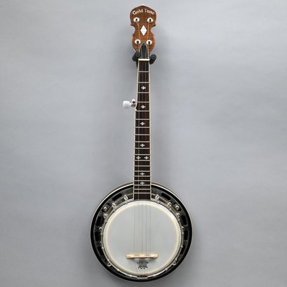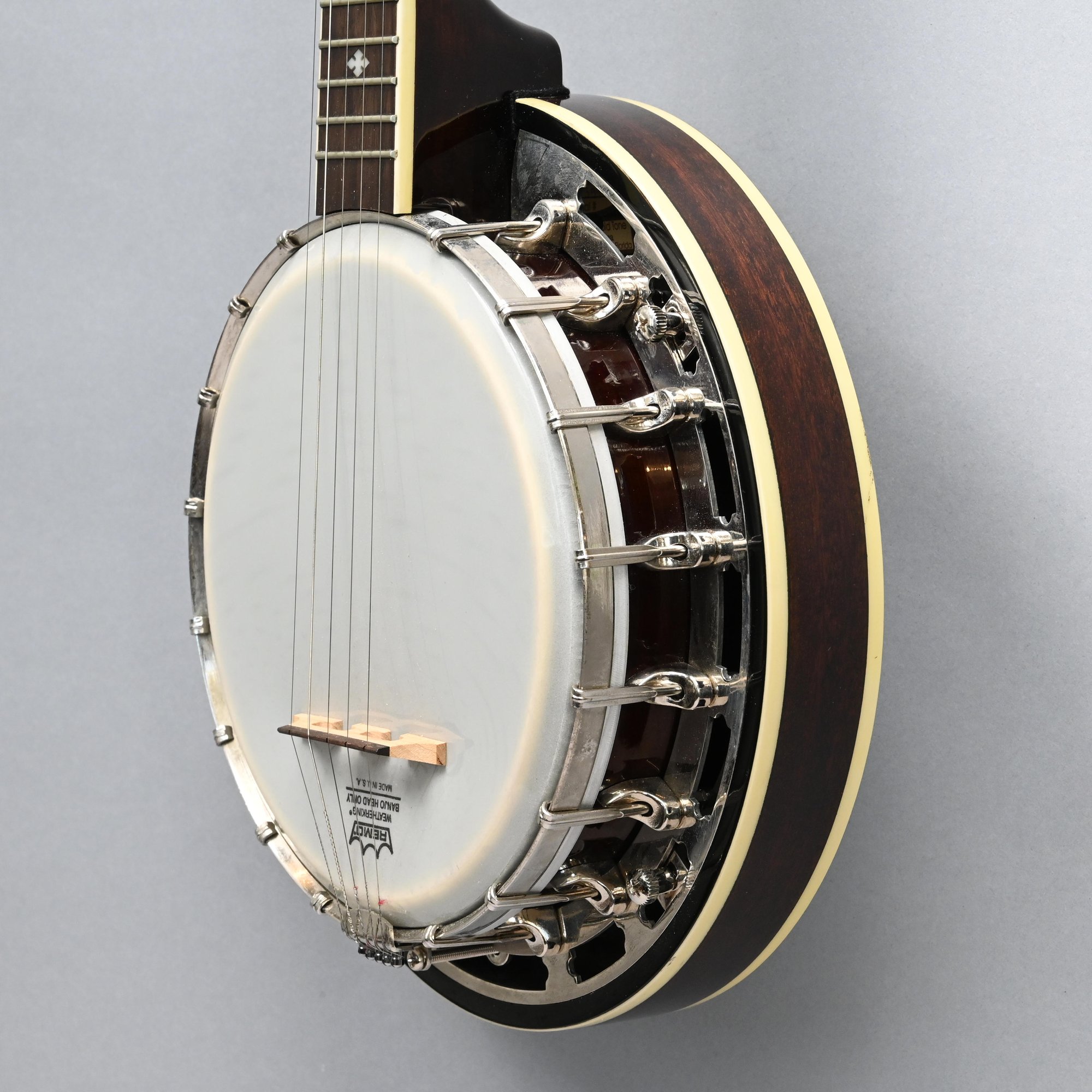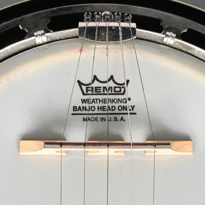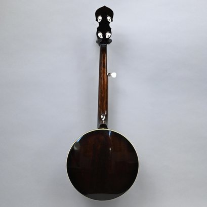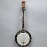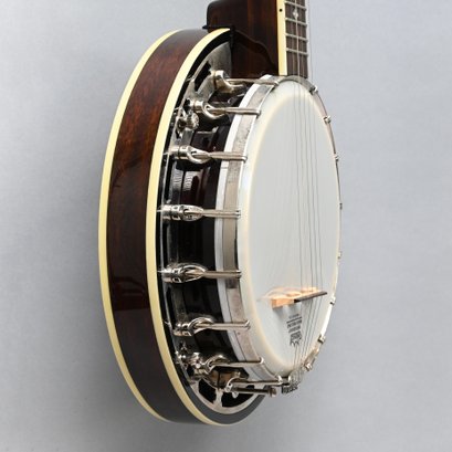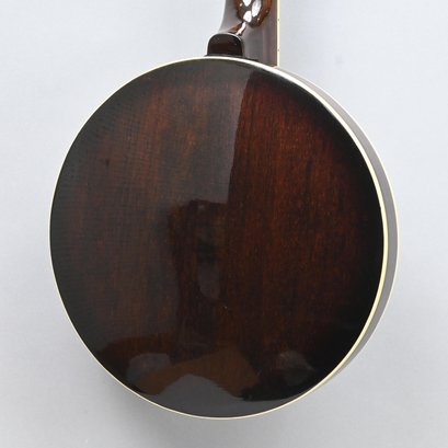 Gold Tone Rosewood Travel or Child's Resonator Banjo. Inscribed "Gold Tone" in gold plate on the peghead, inlaid in mother-of-pearl on the neck with snowflakes, printed "REMO/ WEATHERKING/ BANJO HEAD ONLY/ MADE IN U.S.A." on the drum head; housed in a soft sided case.