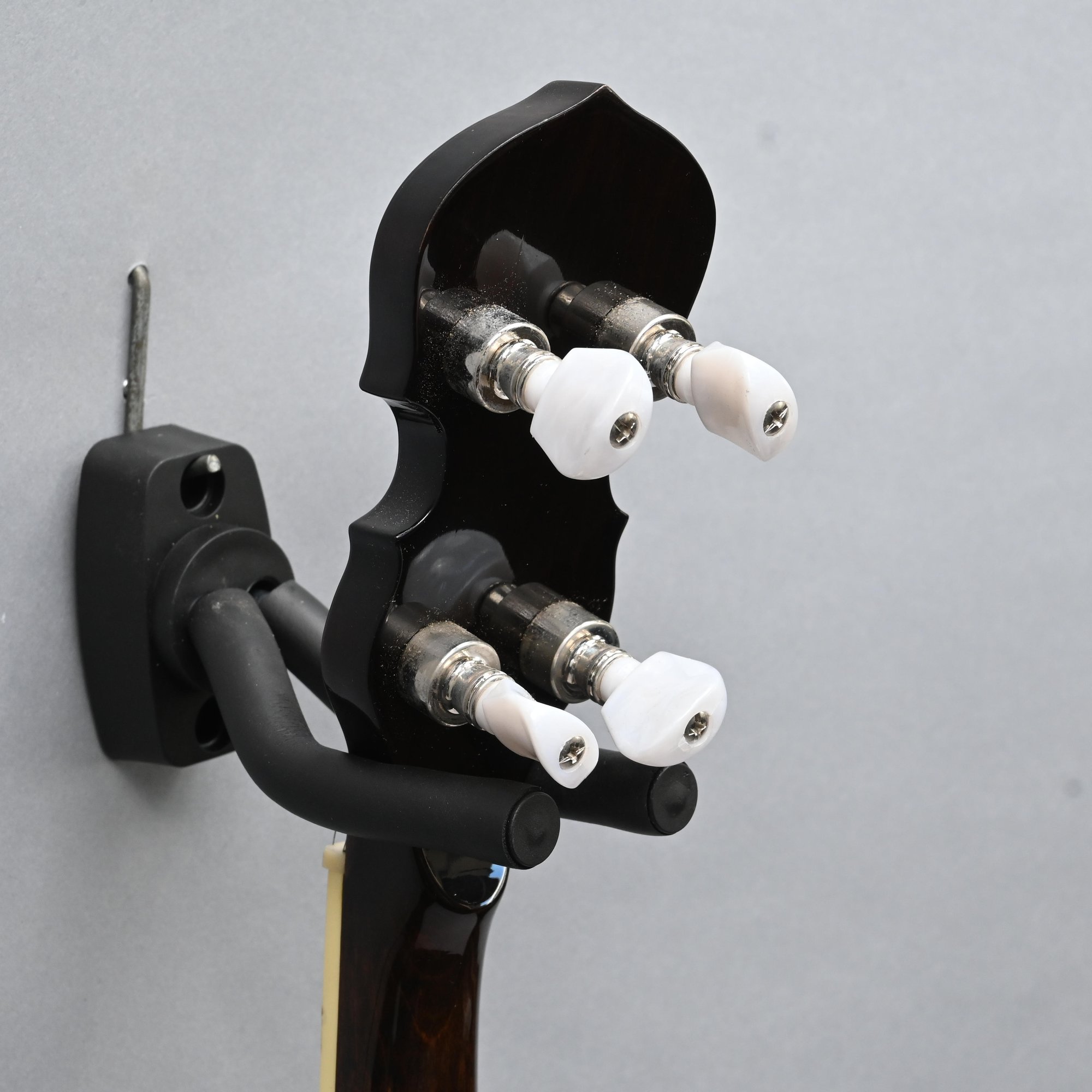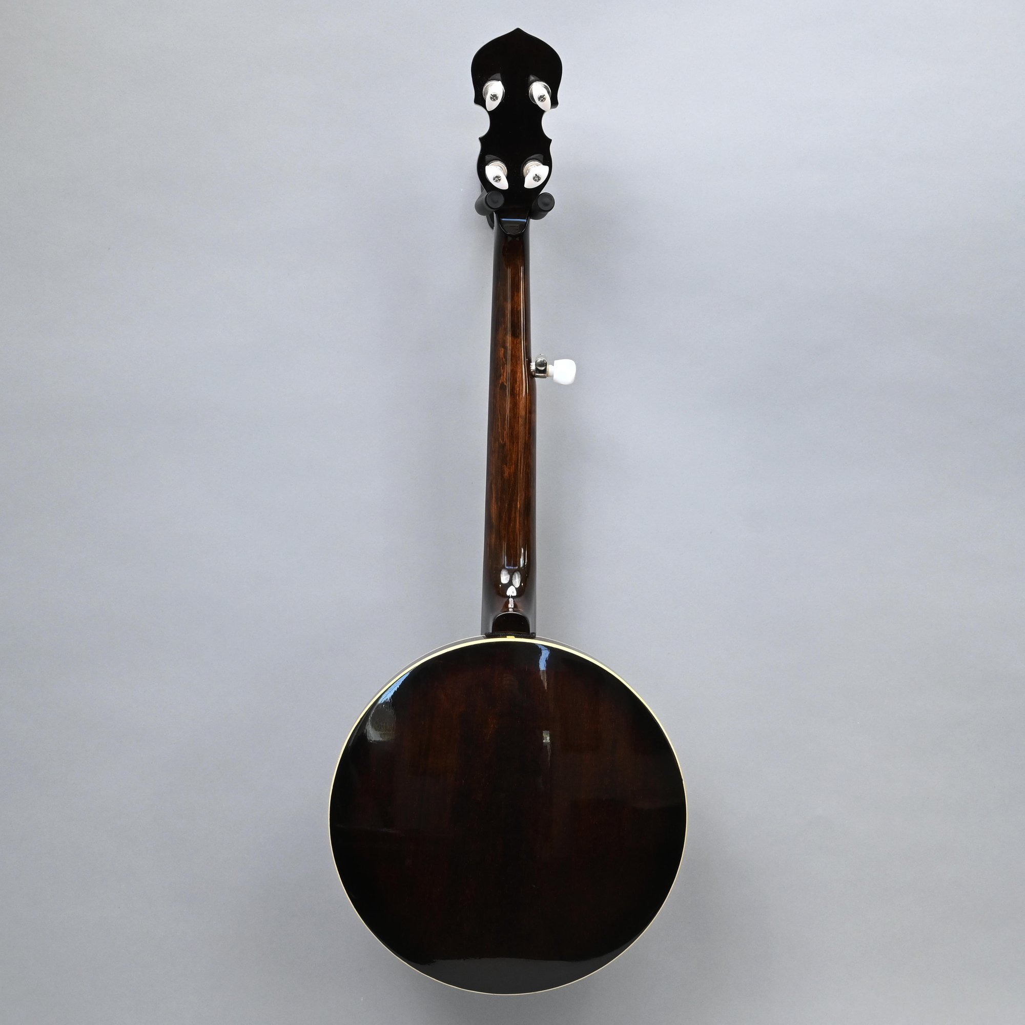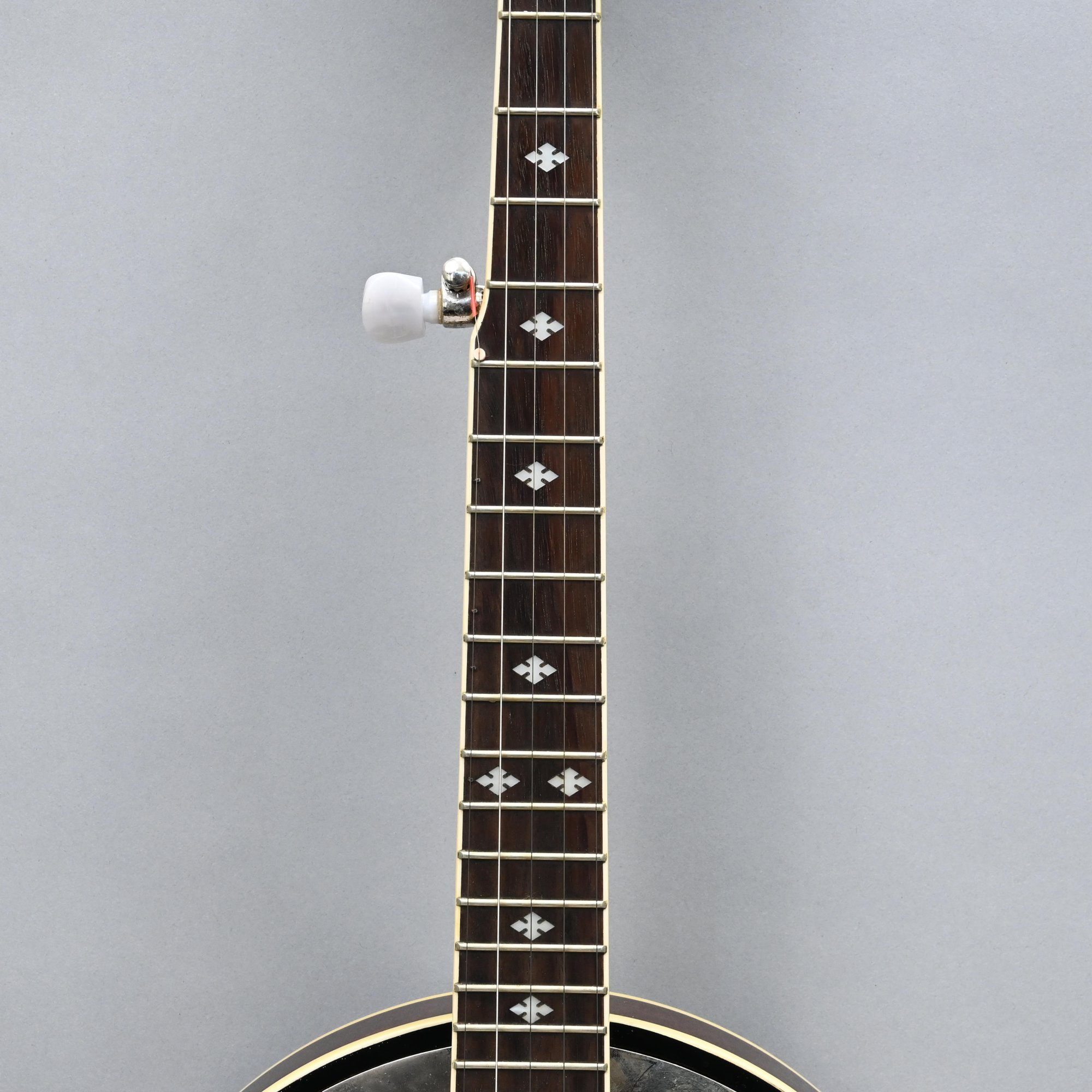 Gold Tone Rosewood Travel or Child's Resonator Banjo. Inscribed "Gold Tone" in gold plate on the peghead, inlaid in mother-of-pearl on the neck with snowflakes, printed "REMO/ WEATHERKING/ BANJO HEAD ONLY/ MADE IN U.S.A." on the drum head; housed in a soft sided case.