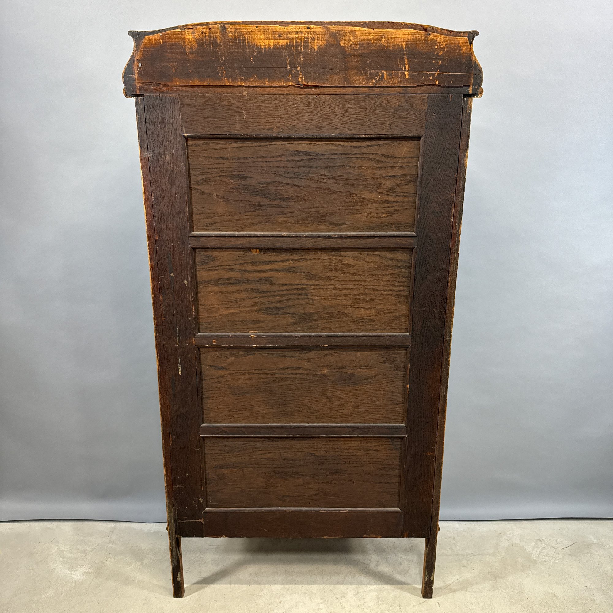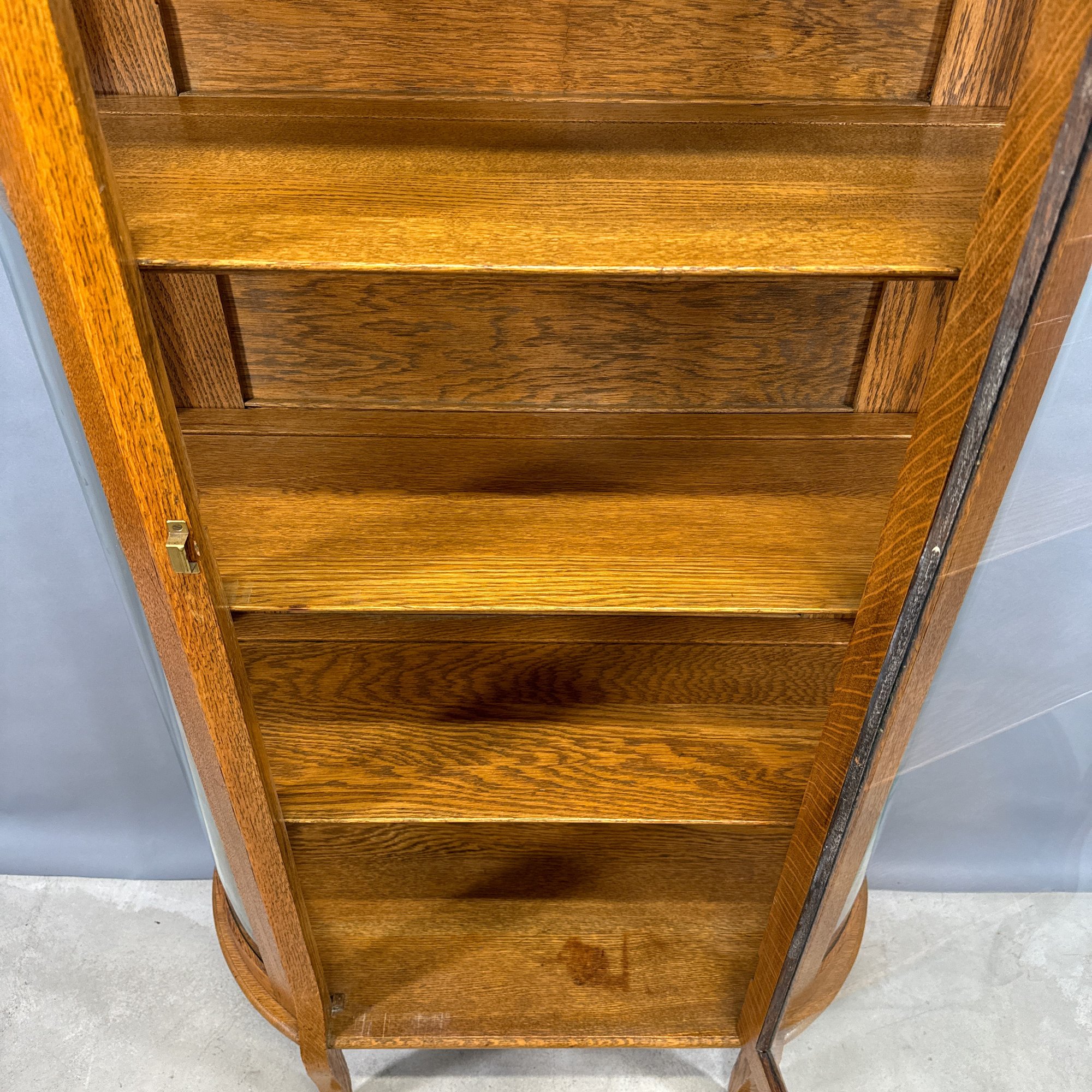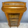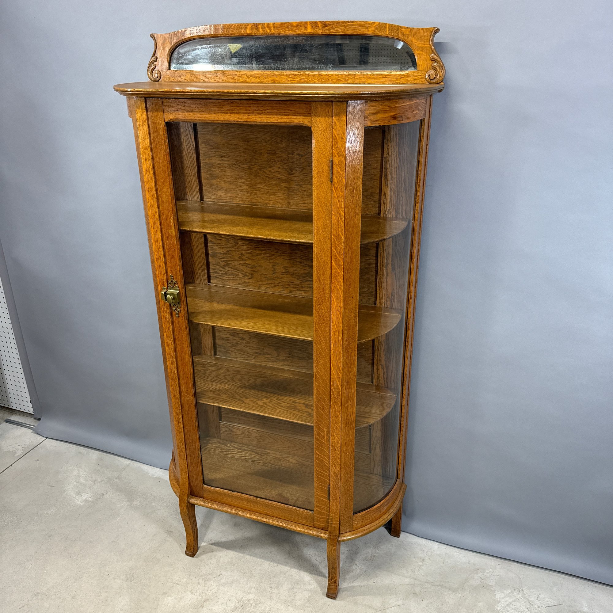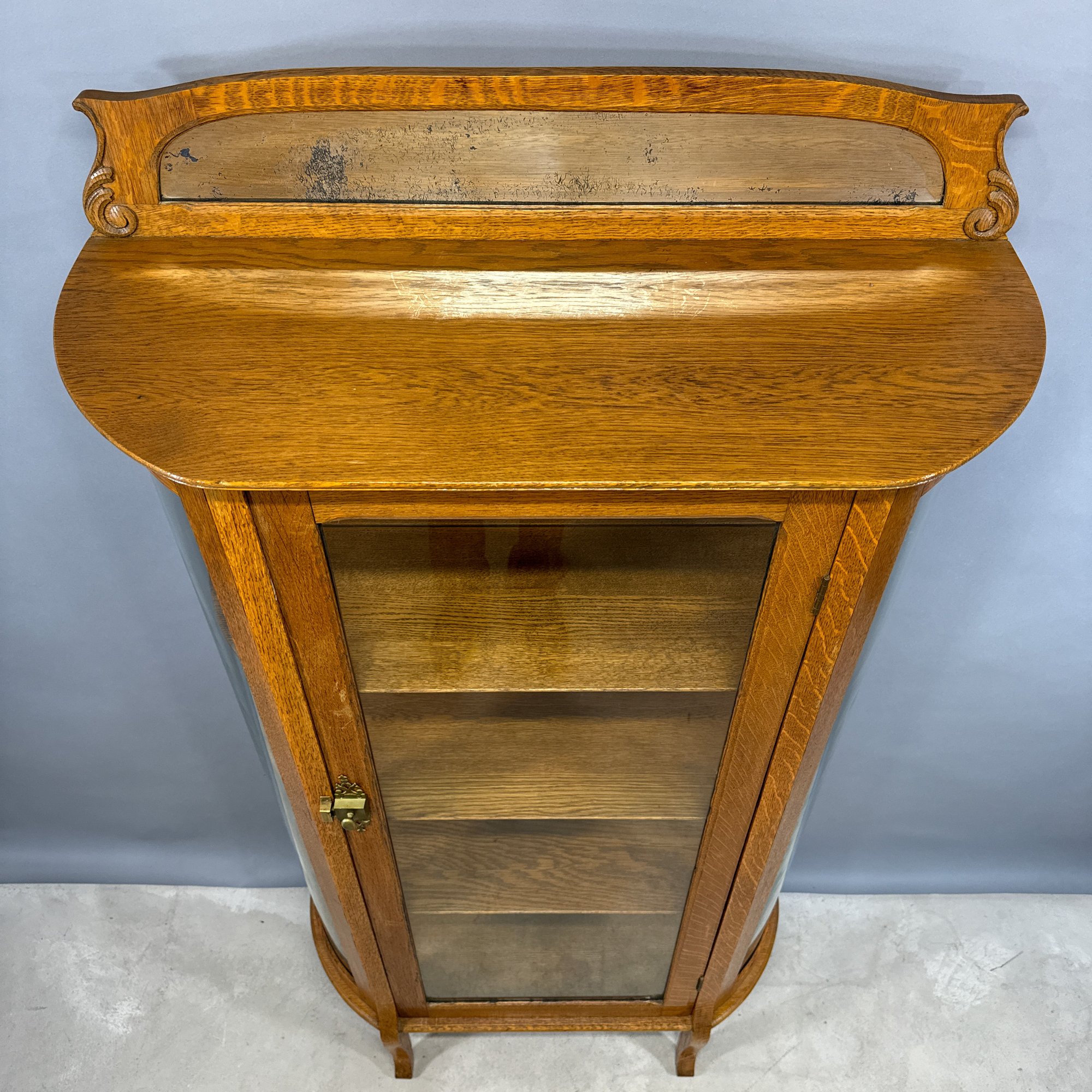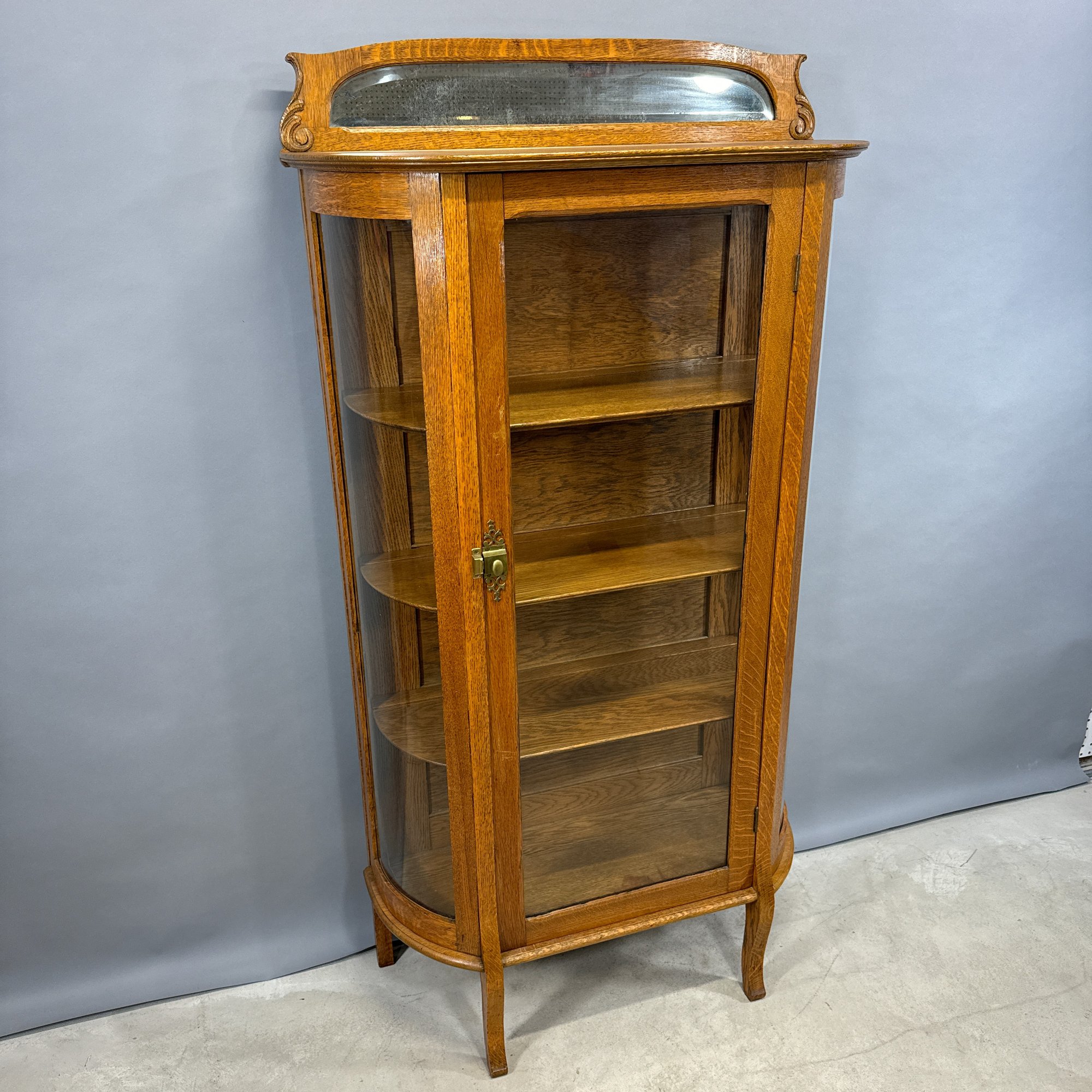 Golden Oak Bow-Front China Cupboard with Mirrored Top, Late 19th-Early 20th Century.