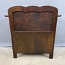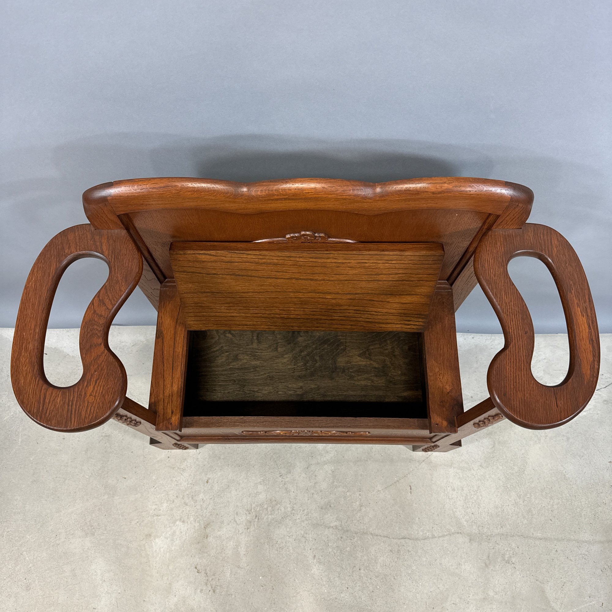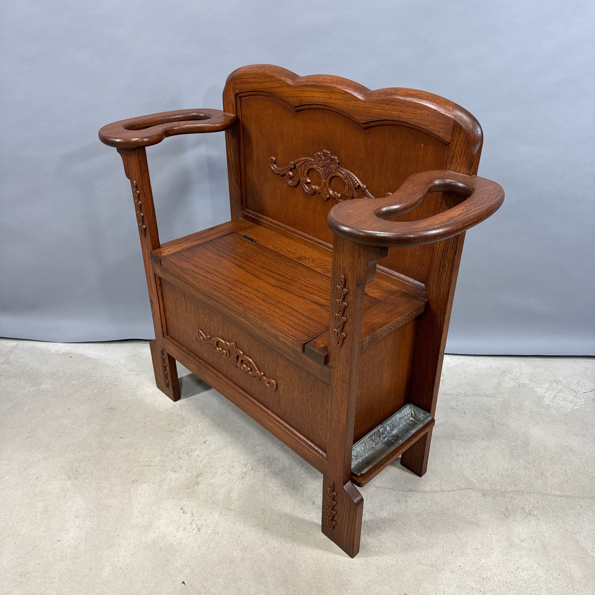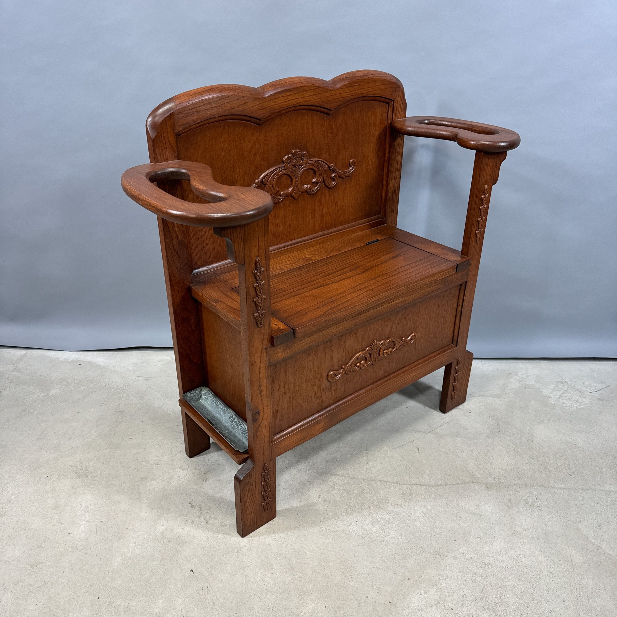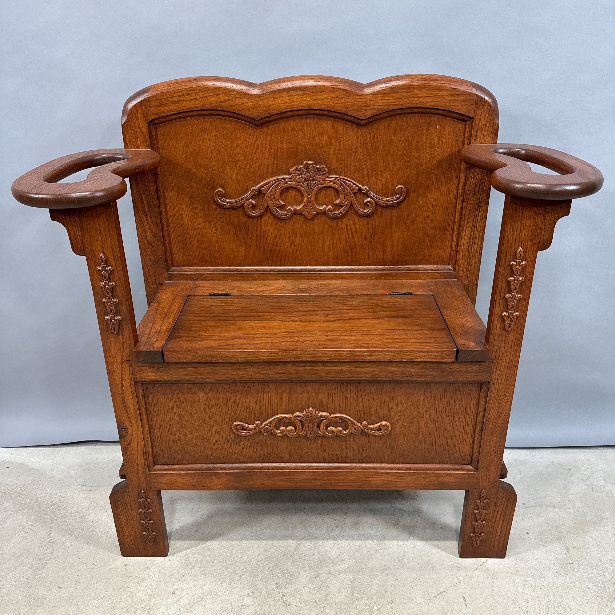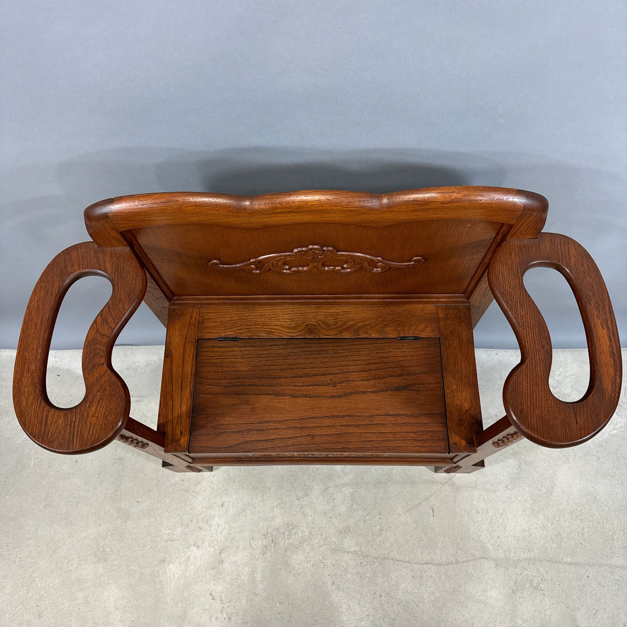 Golden Oak Lift-Top Bench with Umbrella Holders, Early 20th Century. The molded scalloped crest above a floral and foliate-scroll design, the front of the lift-top seat applied with similar molding and within straight sides, each applied with bellflowers and ending in umbrella holders, raised on a plinth base and rectangular frontal feet applied with bellflowers.