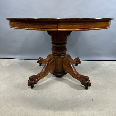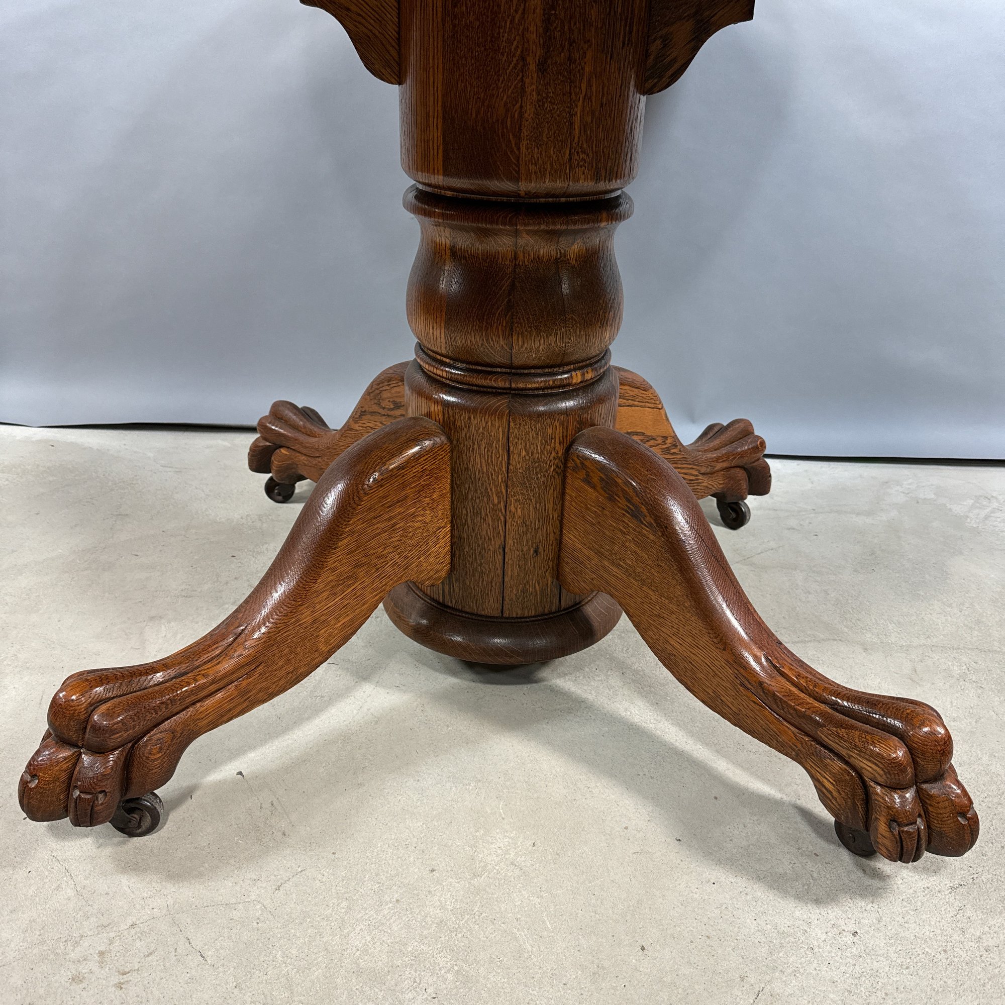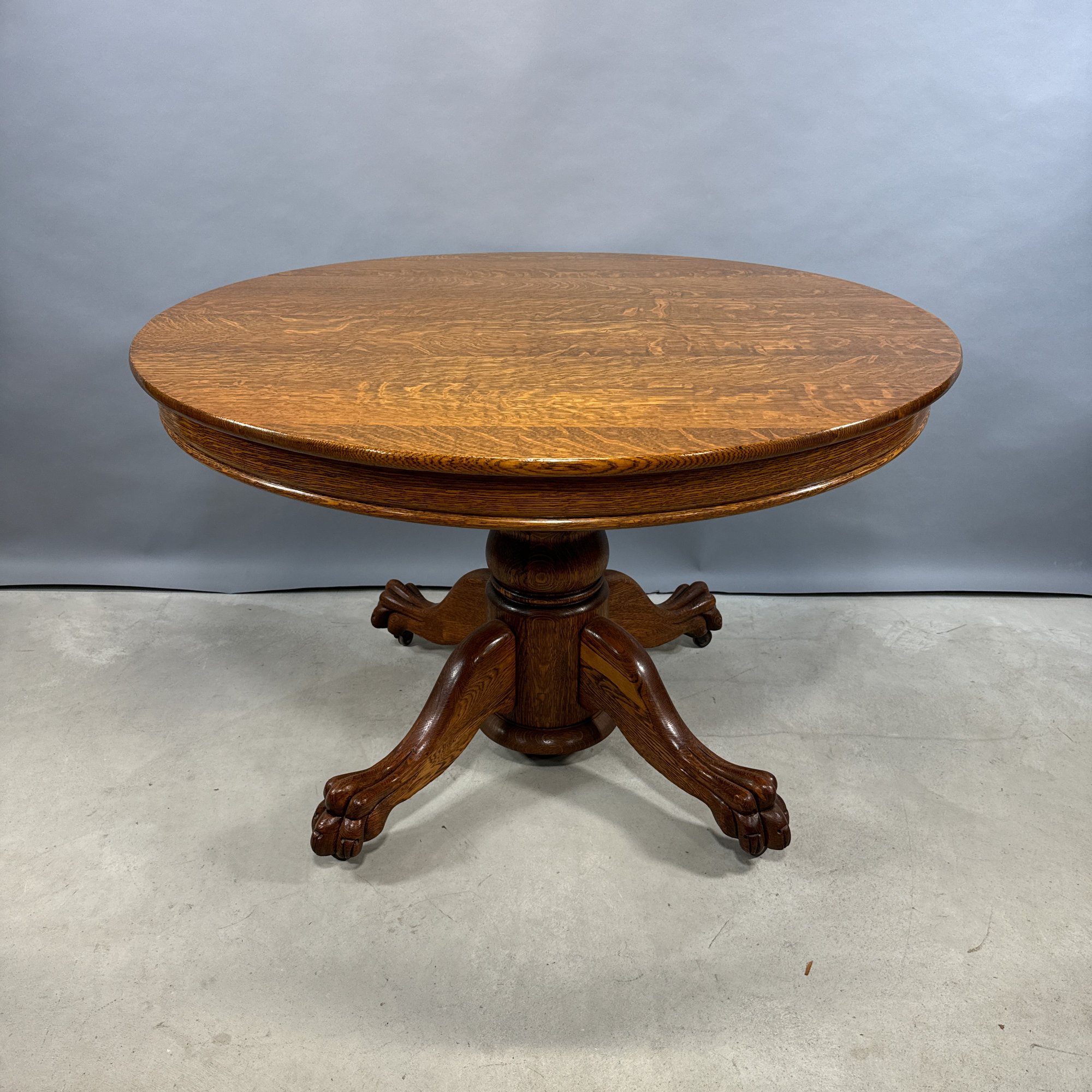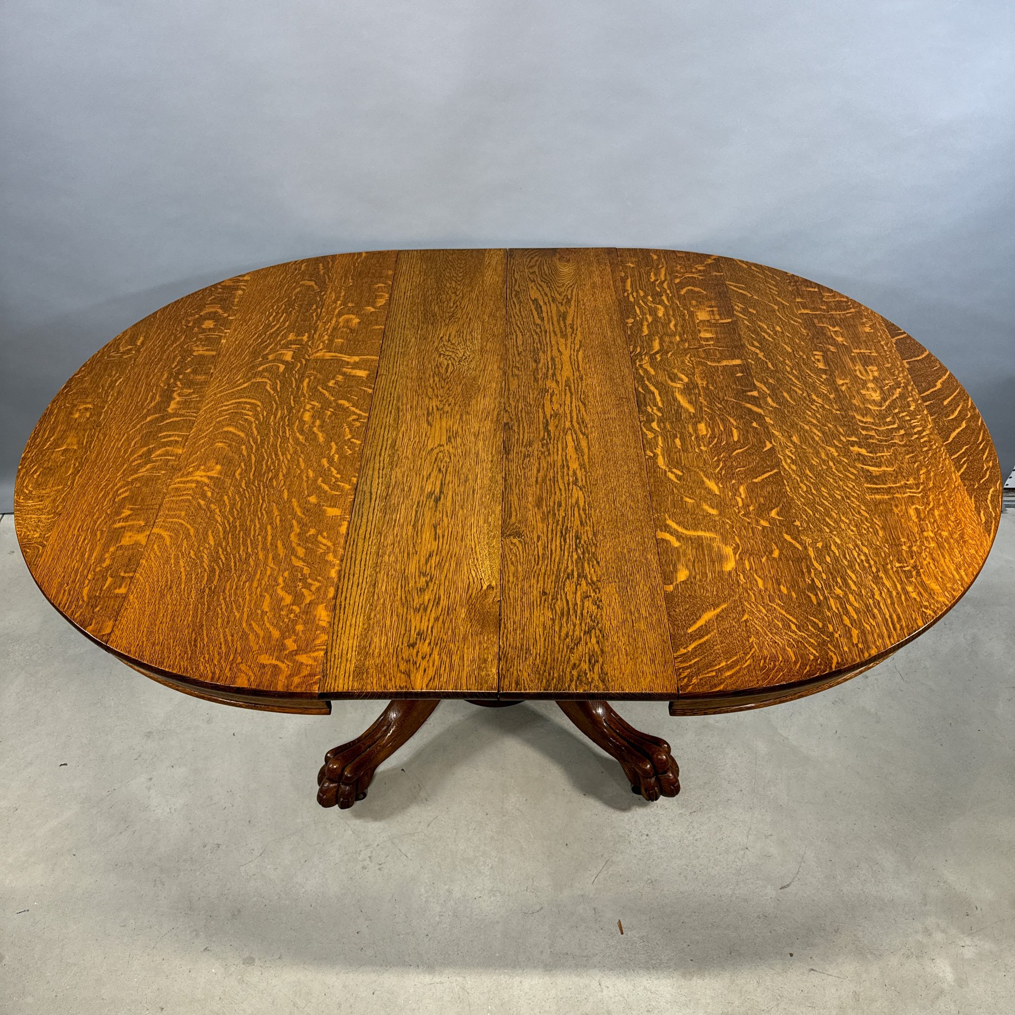 Golden Oak Quarter-Sawn Oak Extension Dining Table, Late 19th-Early 20th Century. The circular top above a cylindrical and bulbous pedestal, raised on cabriole legs ending in massive paw feet; with two extra 9.25- in. leaves.