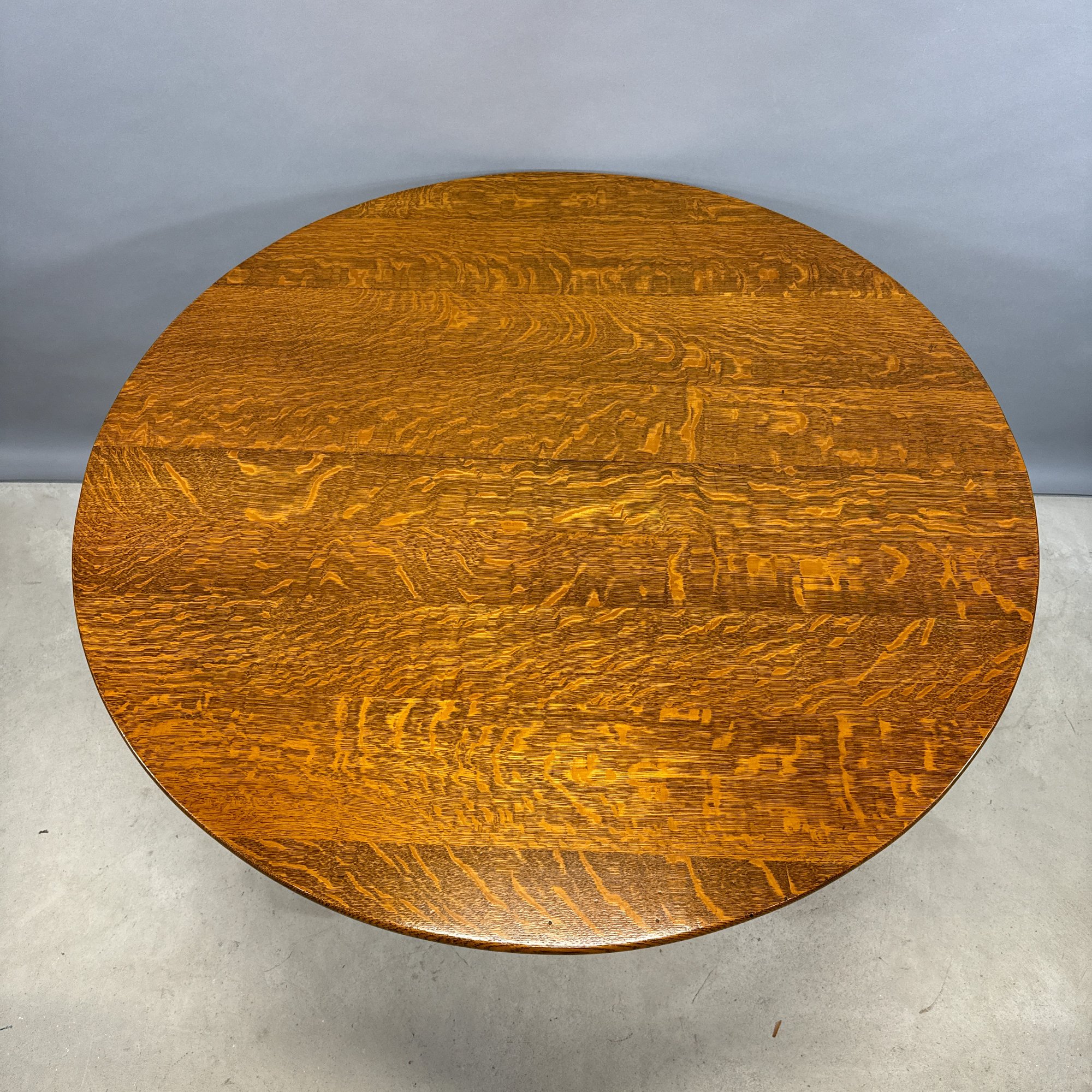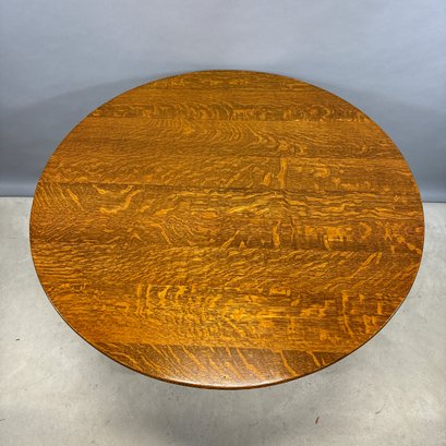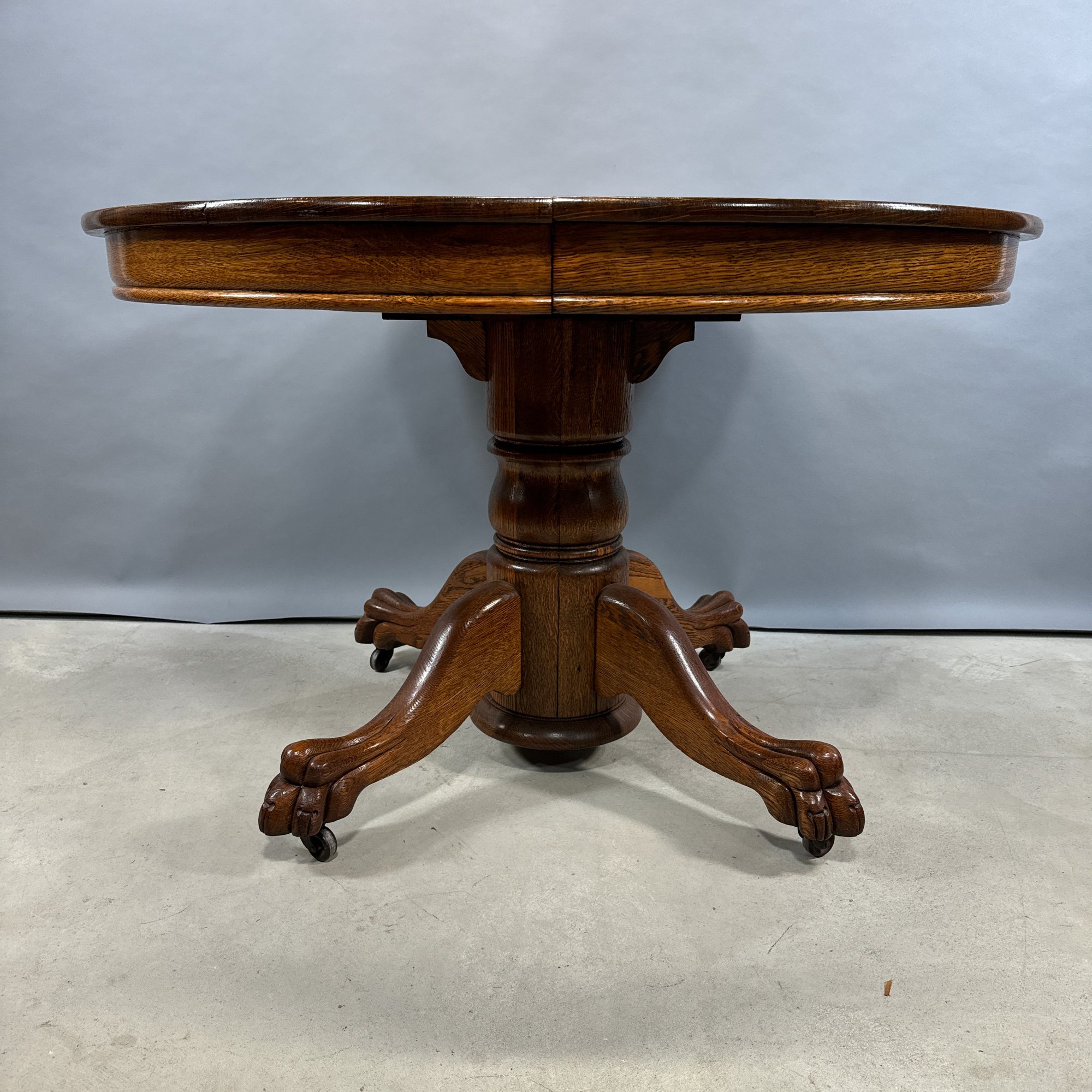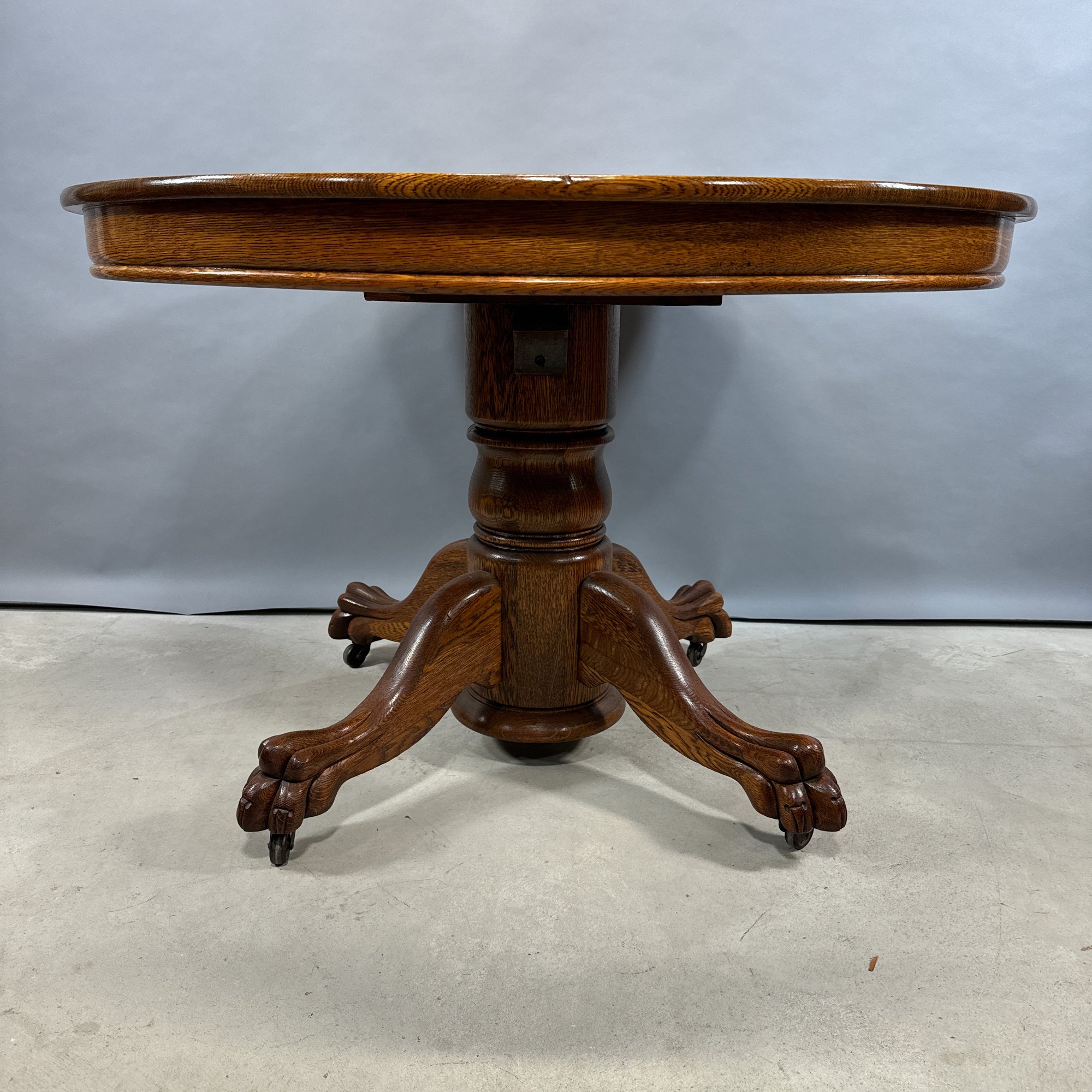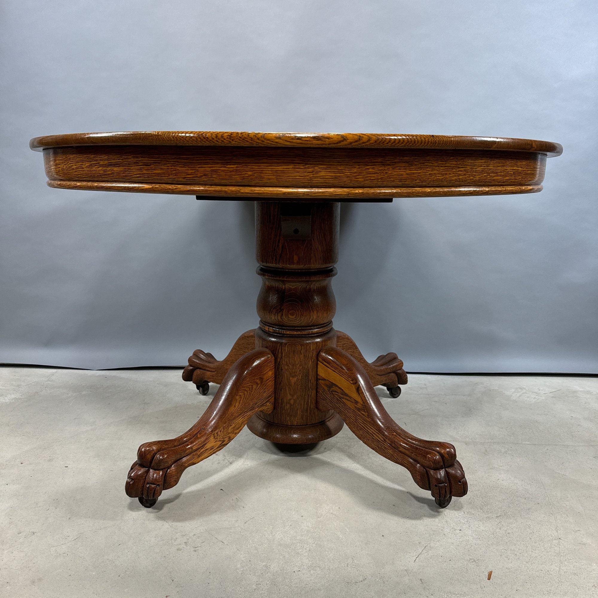 Golden Oak Quarter-Sawn Oak Extension Dining Table, Late 19th-Early 20th Century. The circular top above a cylindrical and bulbous pedestal, raised on cabriole legs ending in massive paw feet; with two extra 9.25- in. leaves.