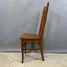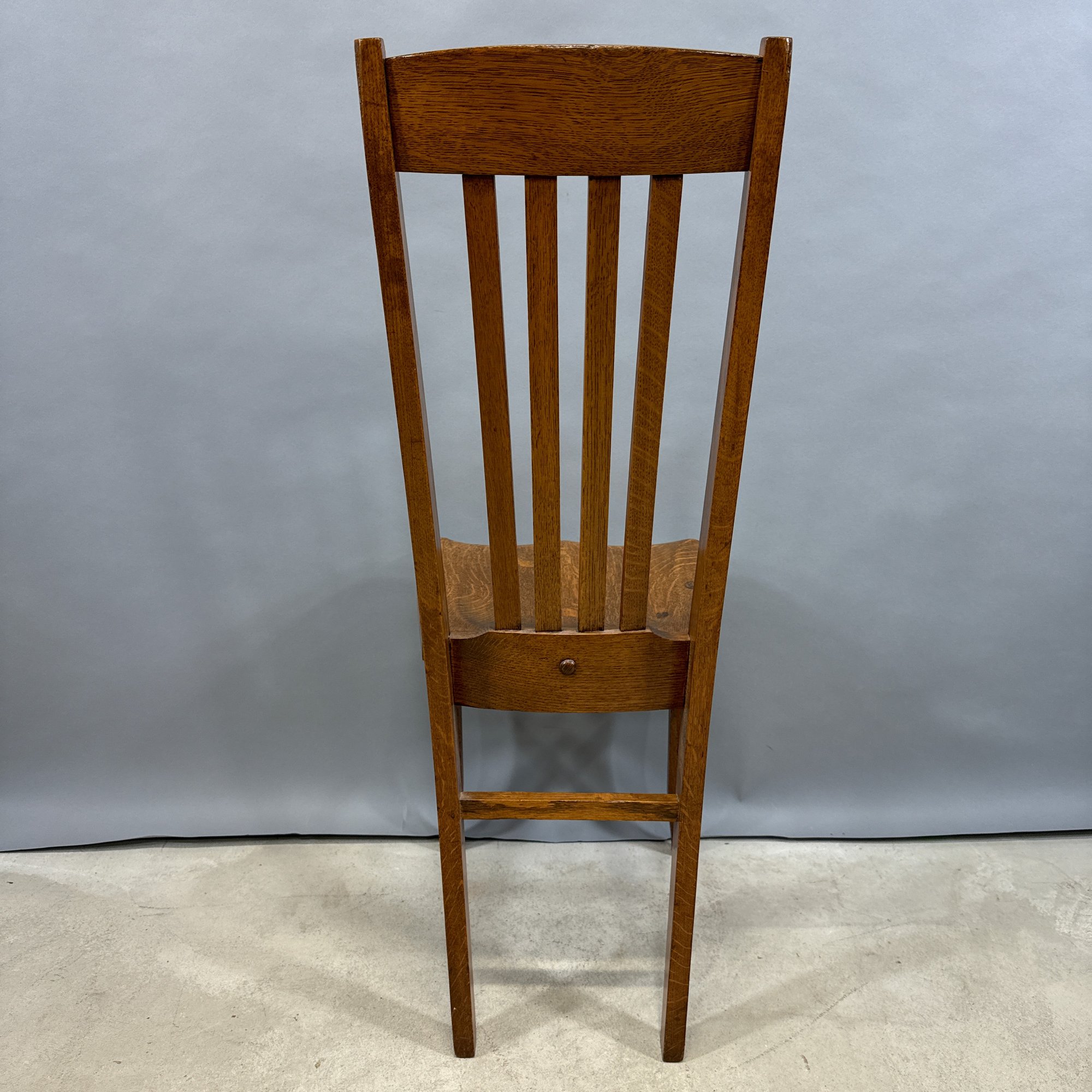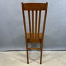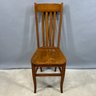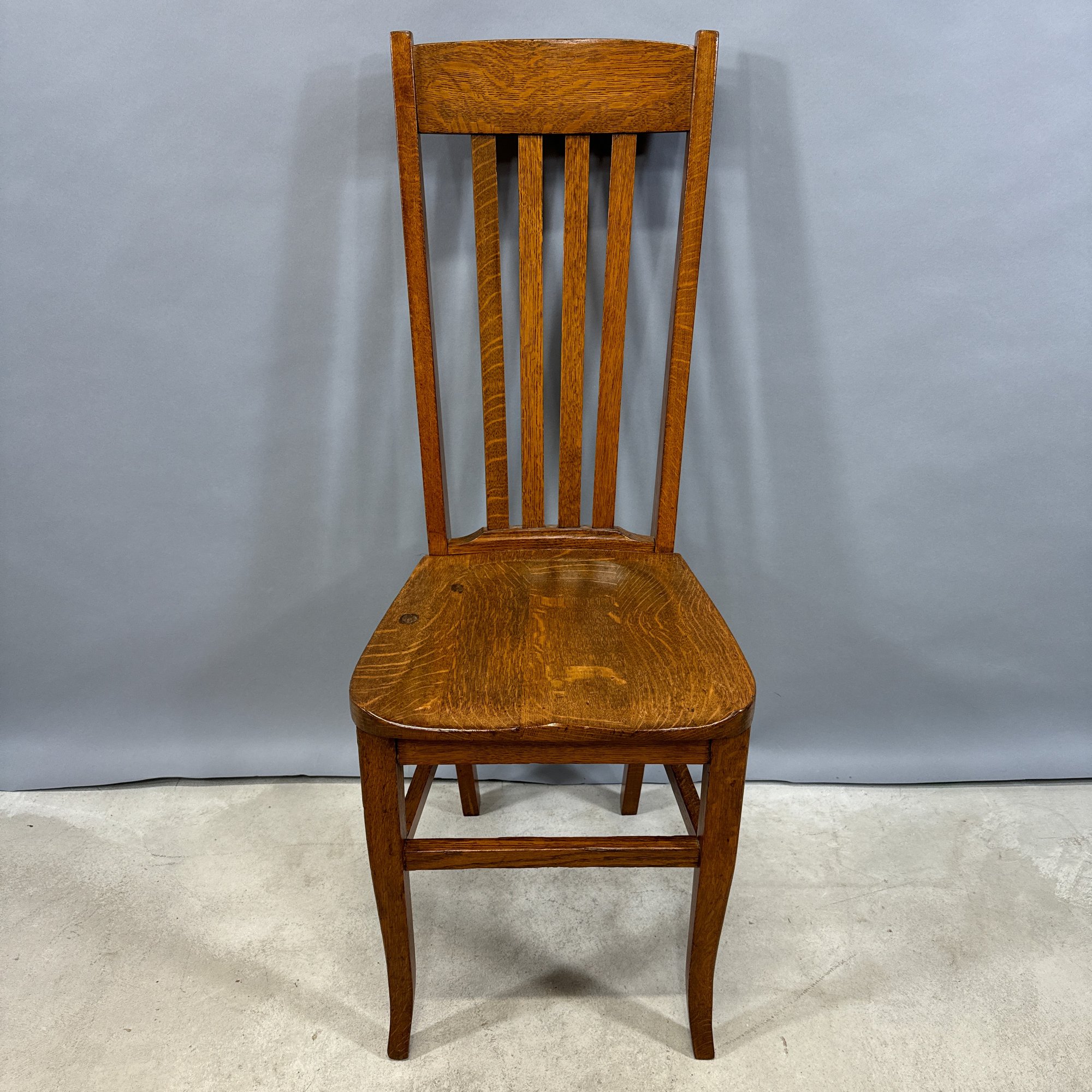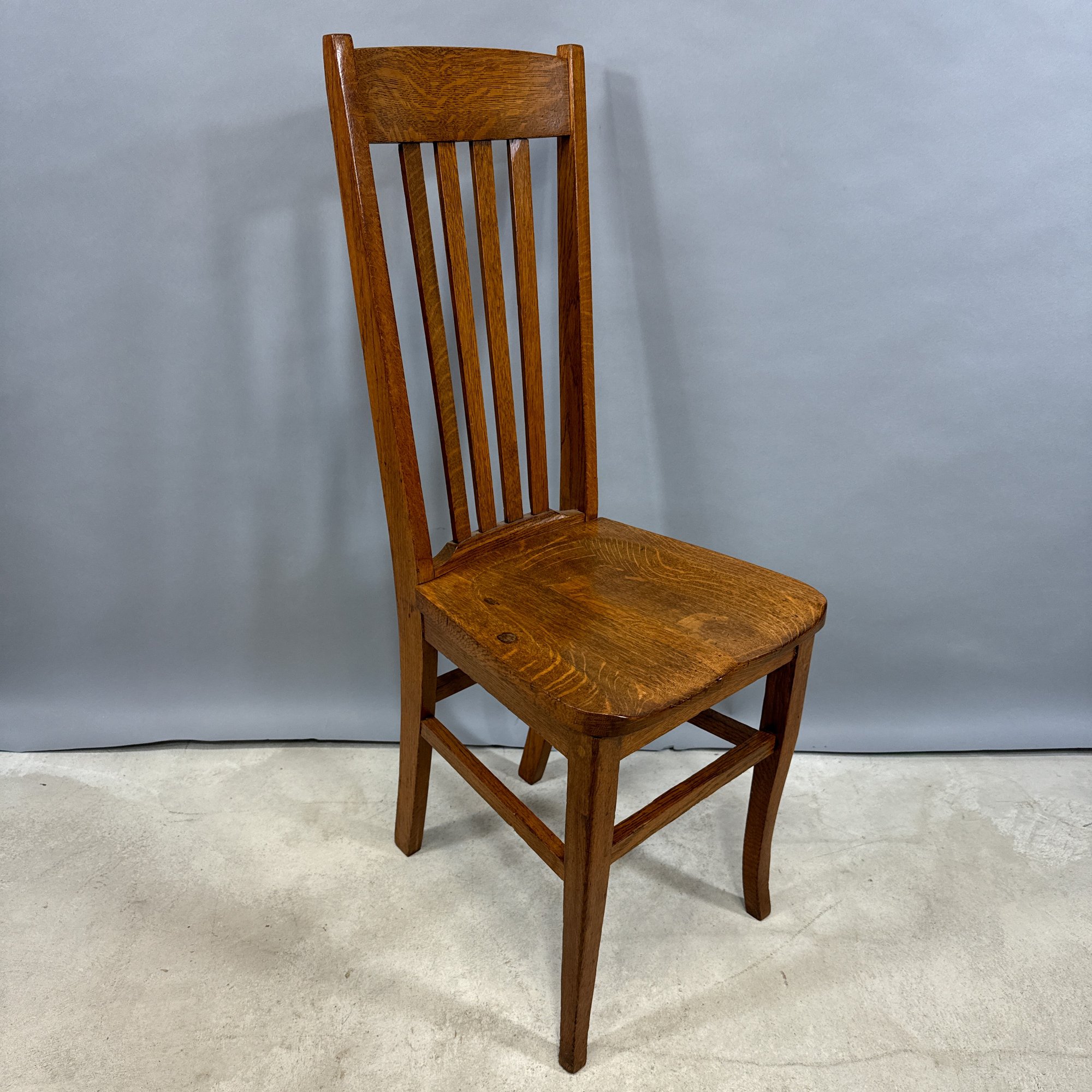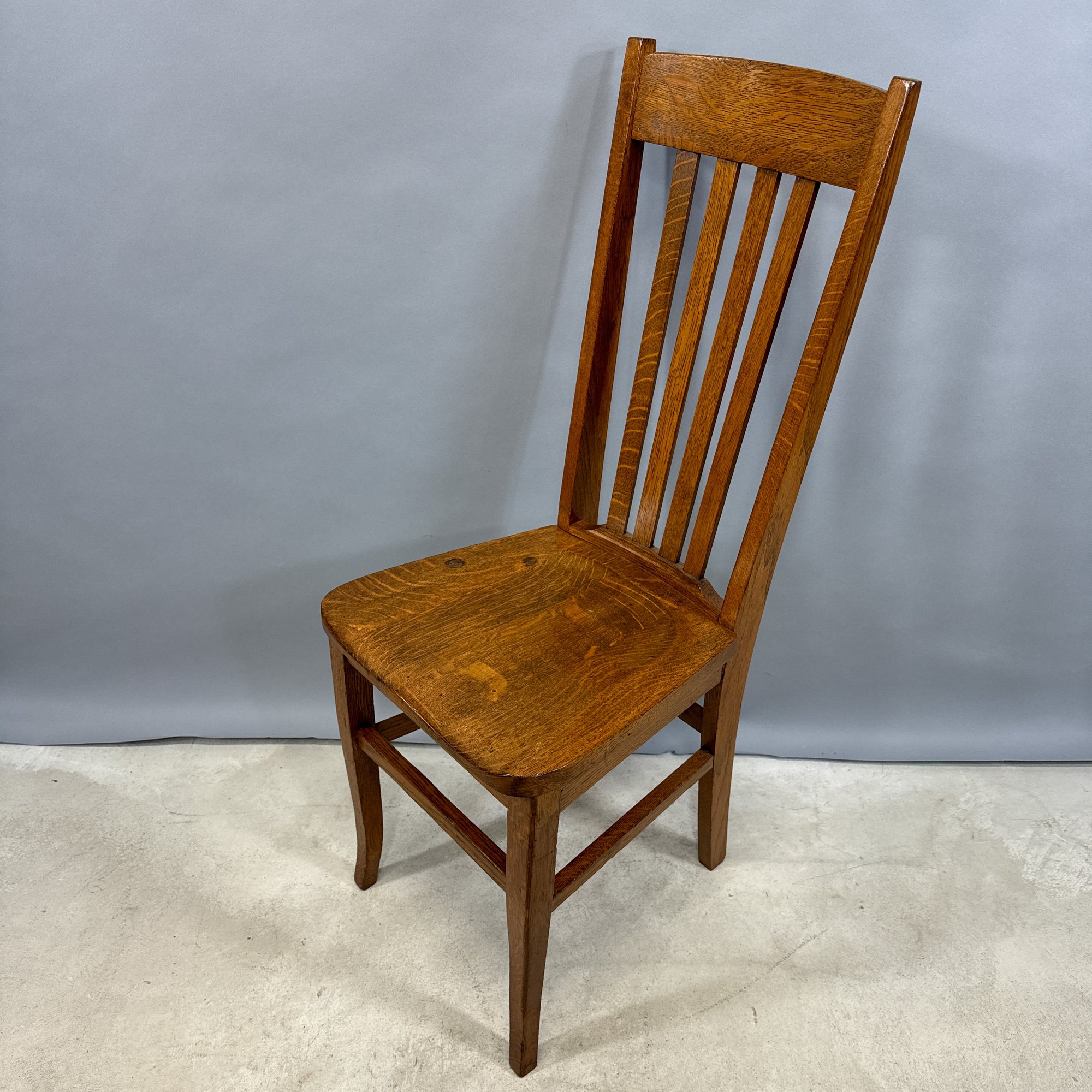 Golden Oak Side Chair, Late 19th-Early 20th Century. The tall back with tablet crest above four spindles and a plank seat, raised on slightly curved legs joined by a box stretcher.
