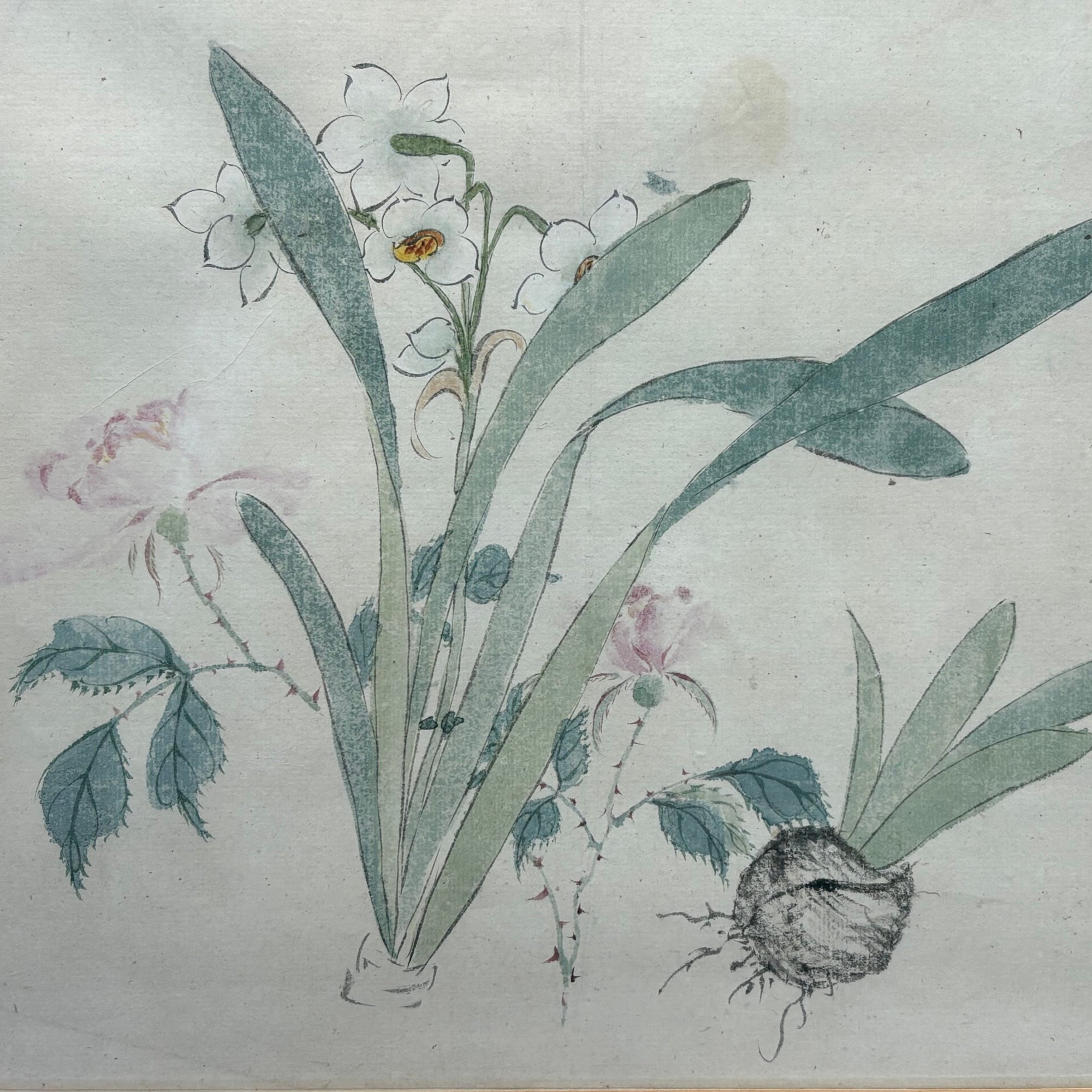 Orchids and Roses. Woodblock print, (9.25 x 9.75 inches, sight).