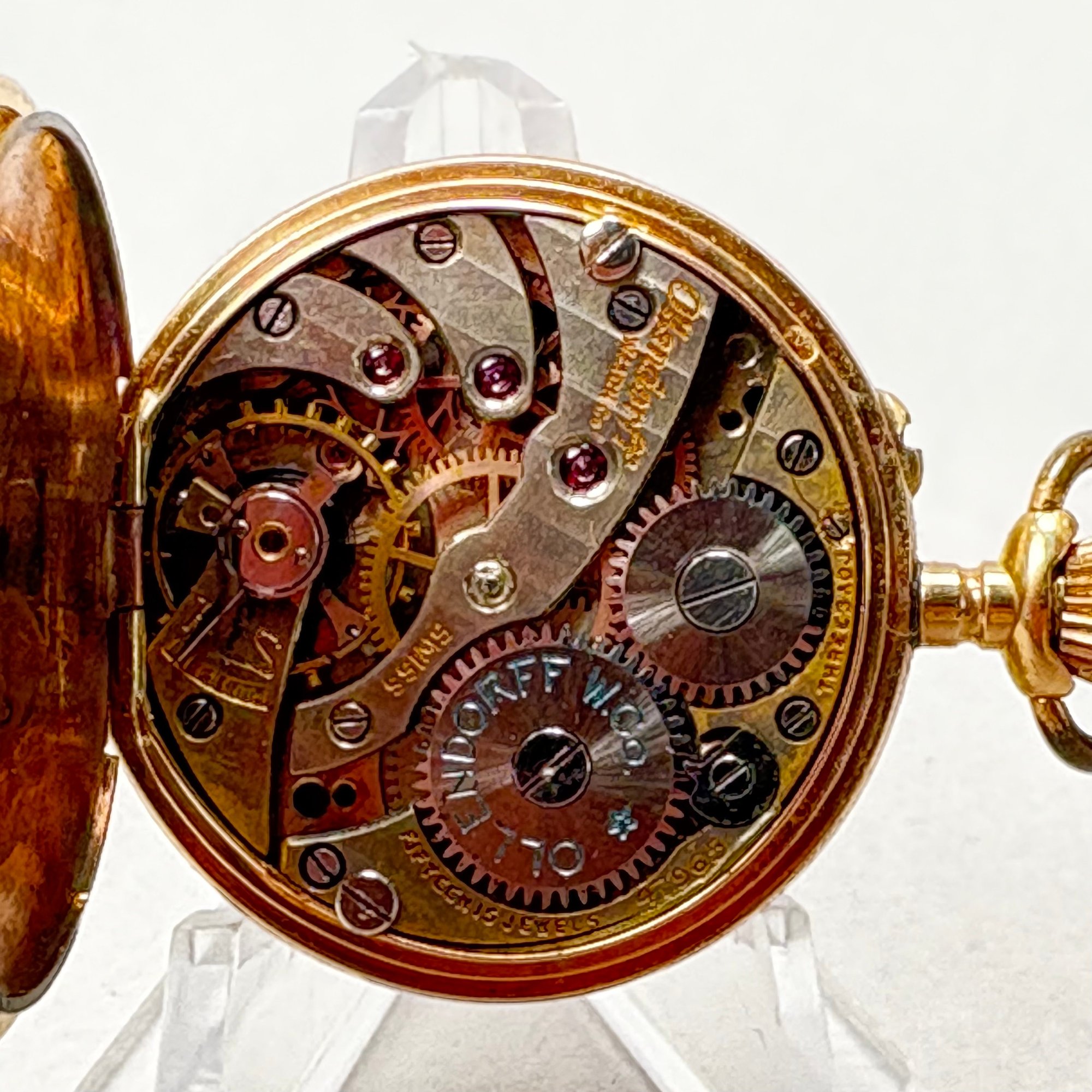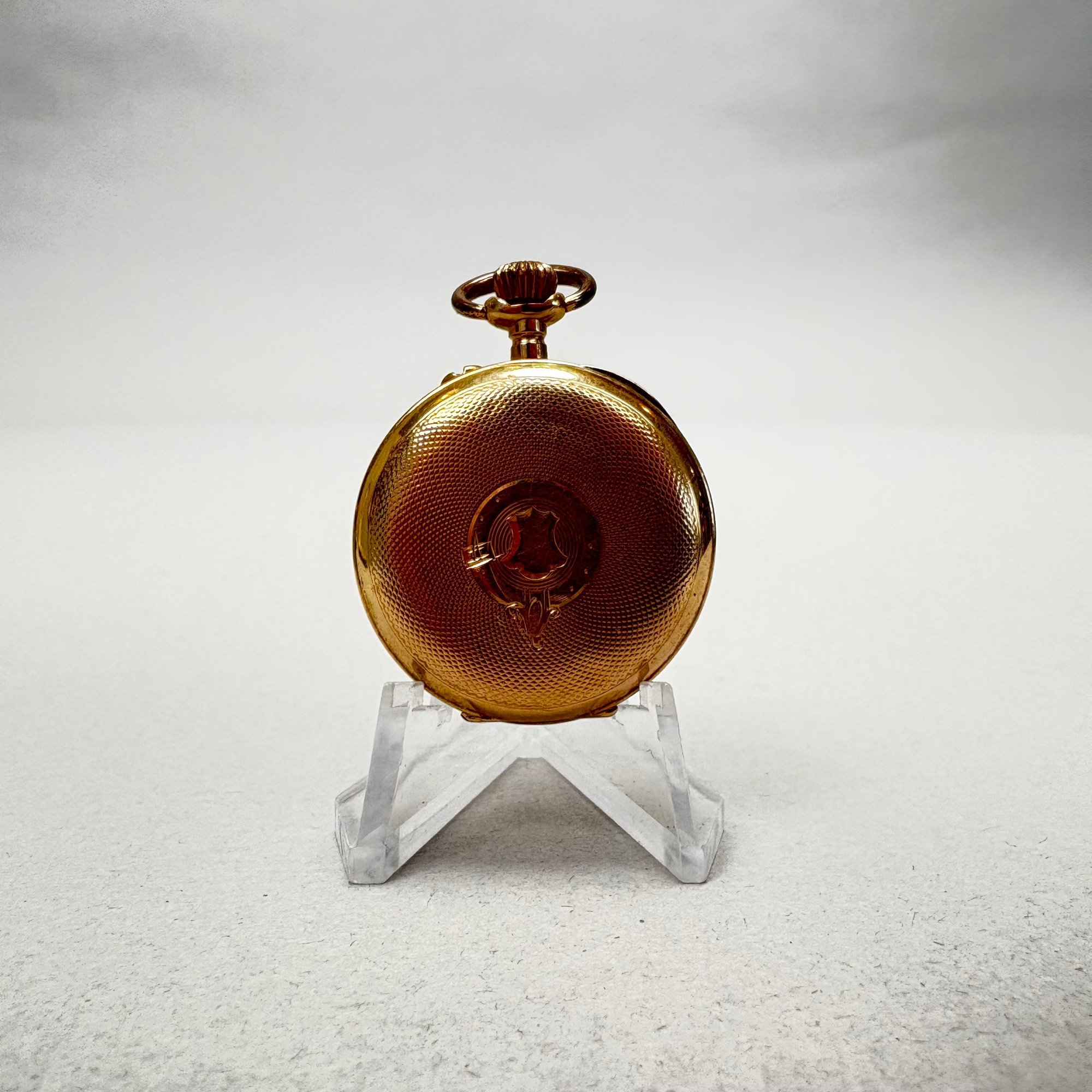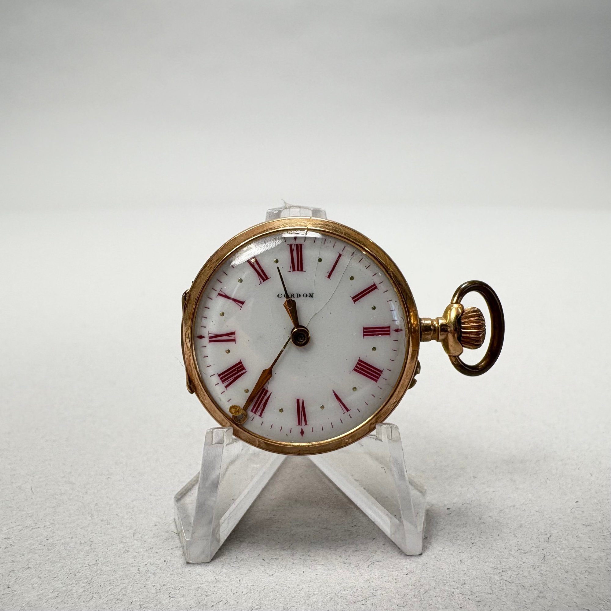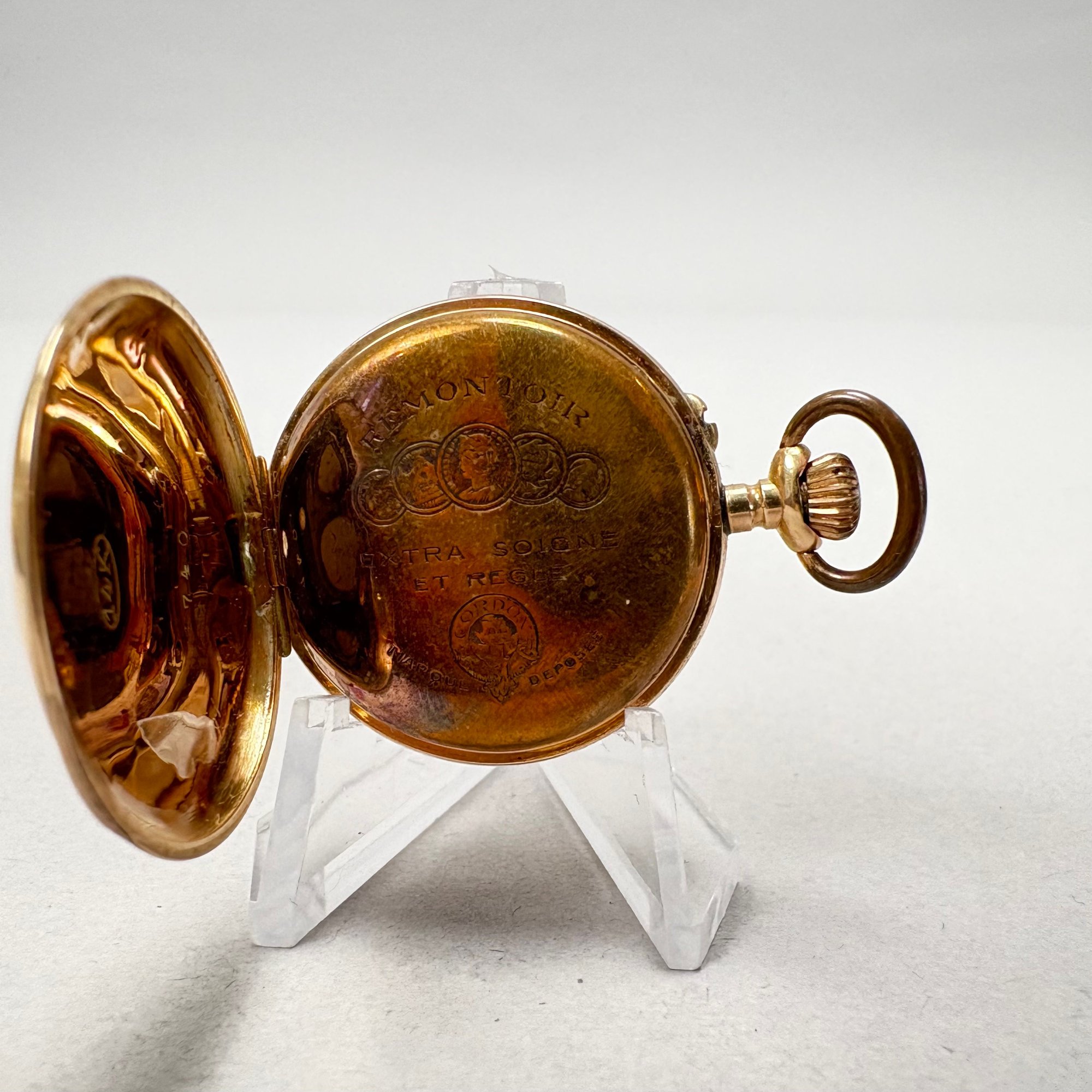 Remontoir 14k Yellow Gold Ladies Pocket Watch. Marked "REMONTOIR/ EXTRA SOIGNE/ ET REGLE/ CORDON/ MARQUE DEPOSEE," NUMBER "740" and "14k;" housed in a Mulard E. Wood Jeweller, Lowell, Mass. box.