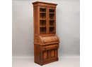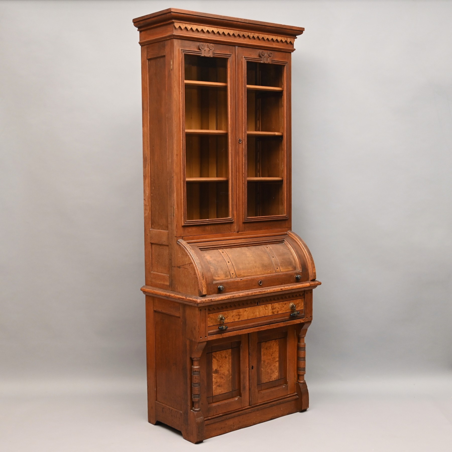 In two parts: the upper section with molded sawtooth-decorated cornice above two doors opening to an adjustable shelved interior, over a quarter round cylinder, opening to a fitted interior. The lower section with sliding writing surface, above a single long drawer over a pair of raised panel cabinet doors, flanked by turned columns, raised on a plinth base.