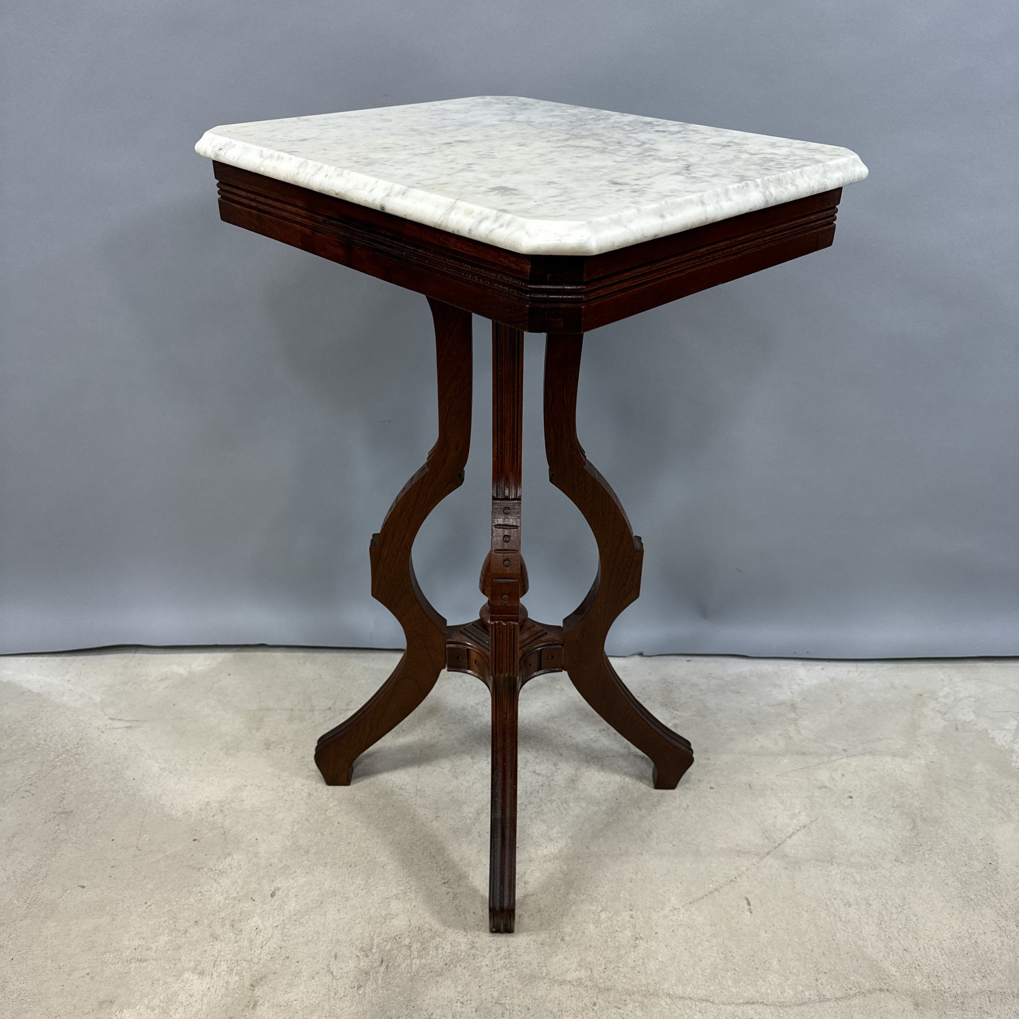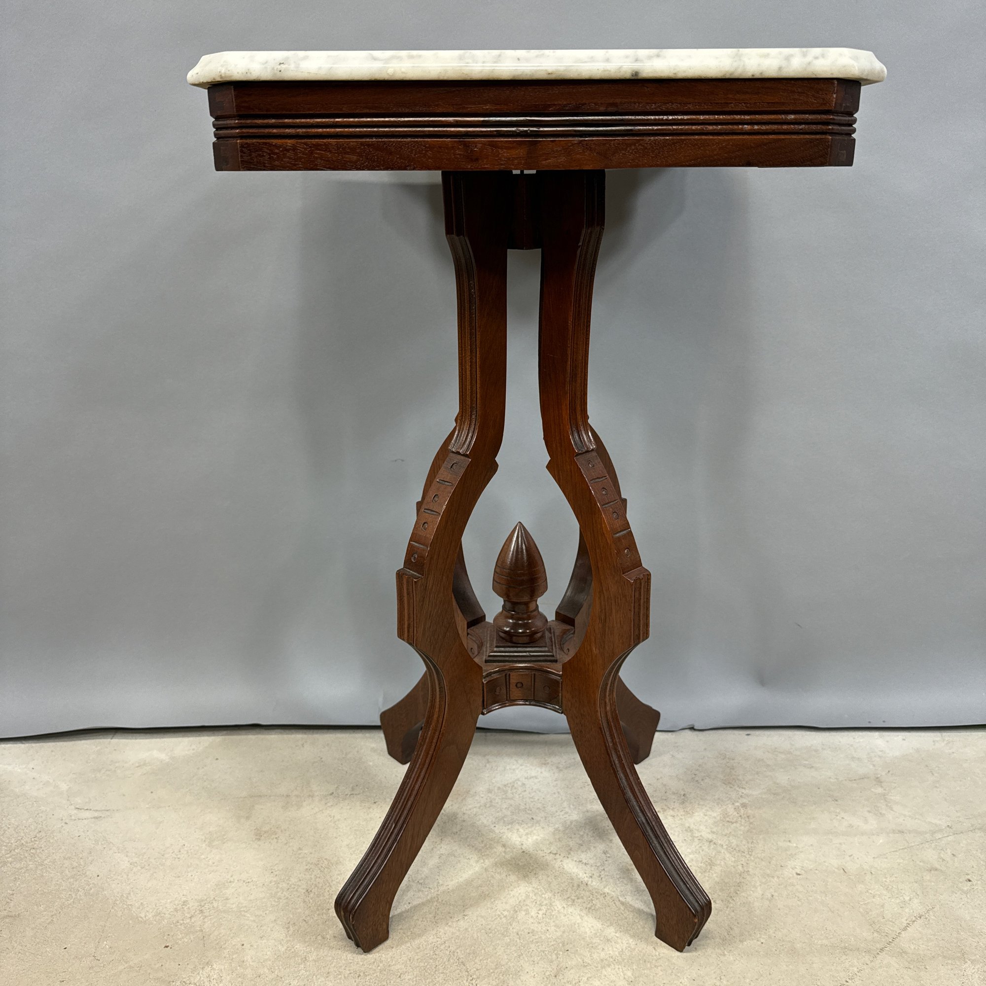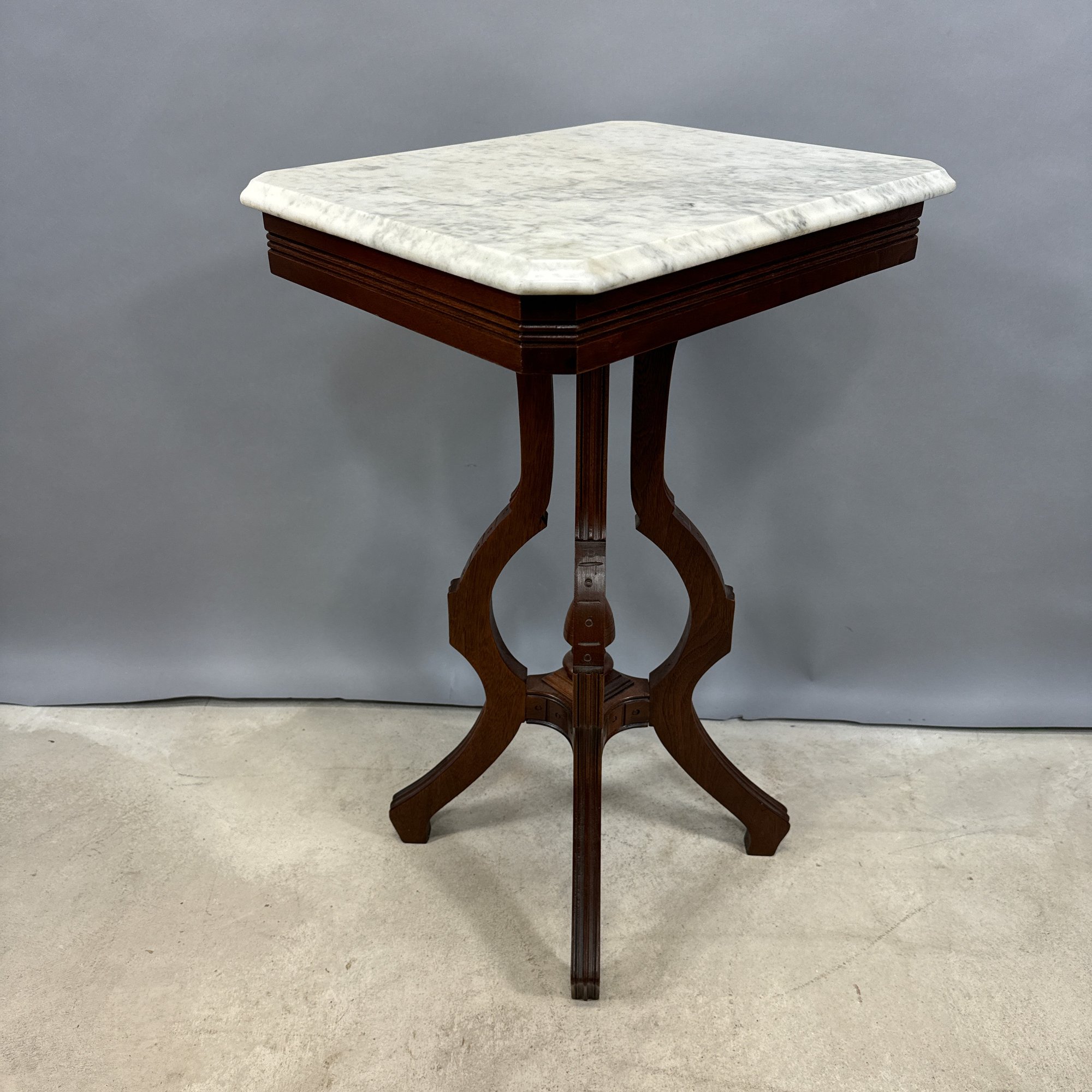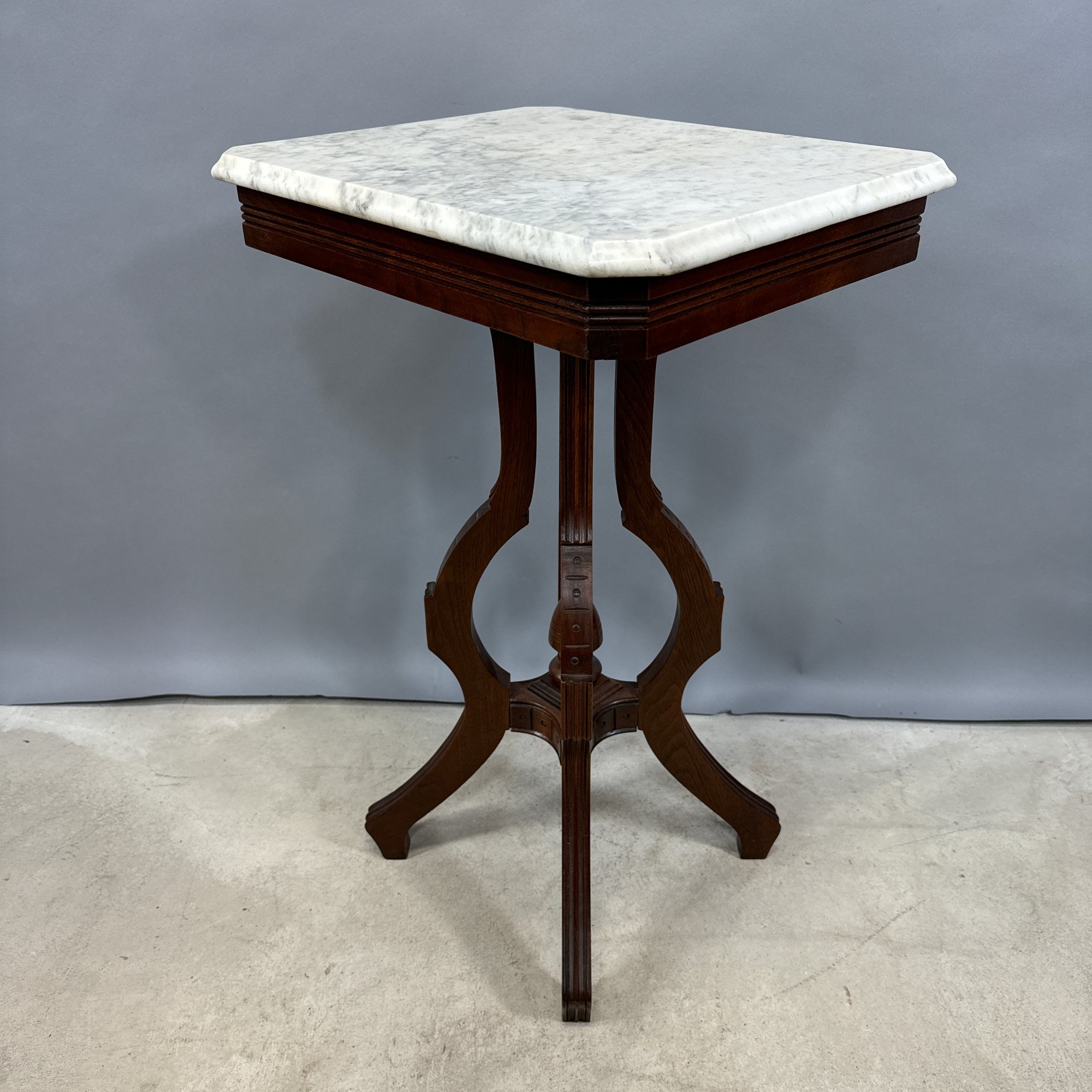 Renaissance Revival Walnut Marble-Top Stand, Late 19th Century. The rectangular white marble top with cut corners above a conforming frieze, raised on four out-curved shaped legs joined by a medial shelf.