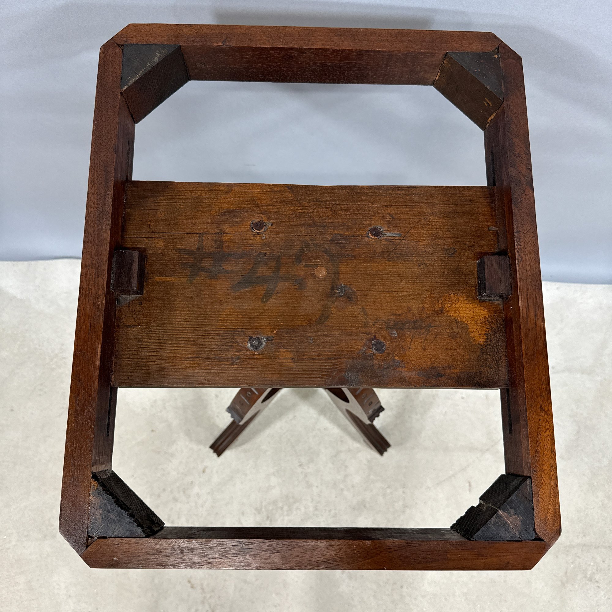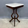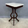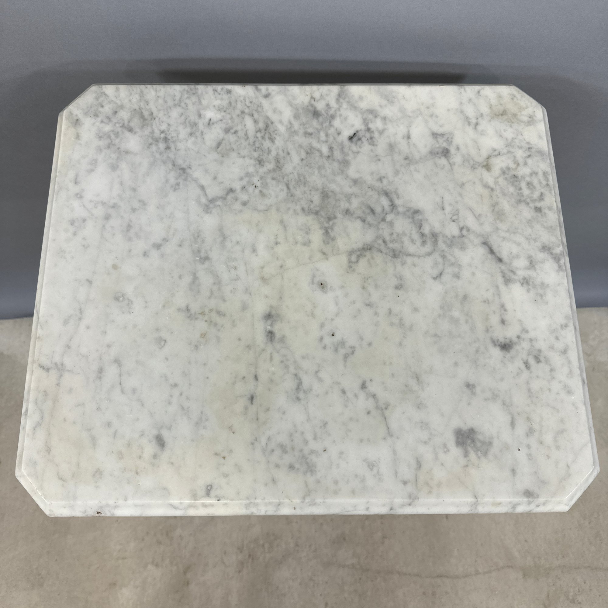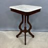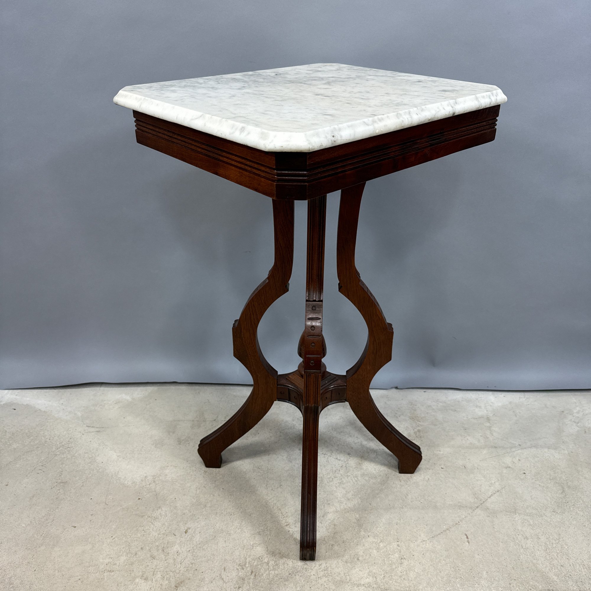 Renaissance Revival Walnut Marble-Top Stand, Late 19th Century. The rectangular white marble top with cut corners above a conforming frieze, raised on four out-curved shaped legs joined by a medial shelf.