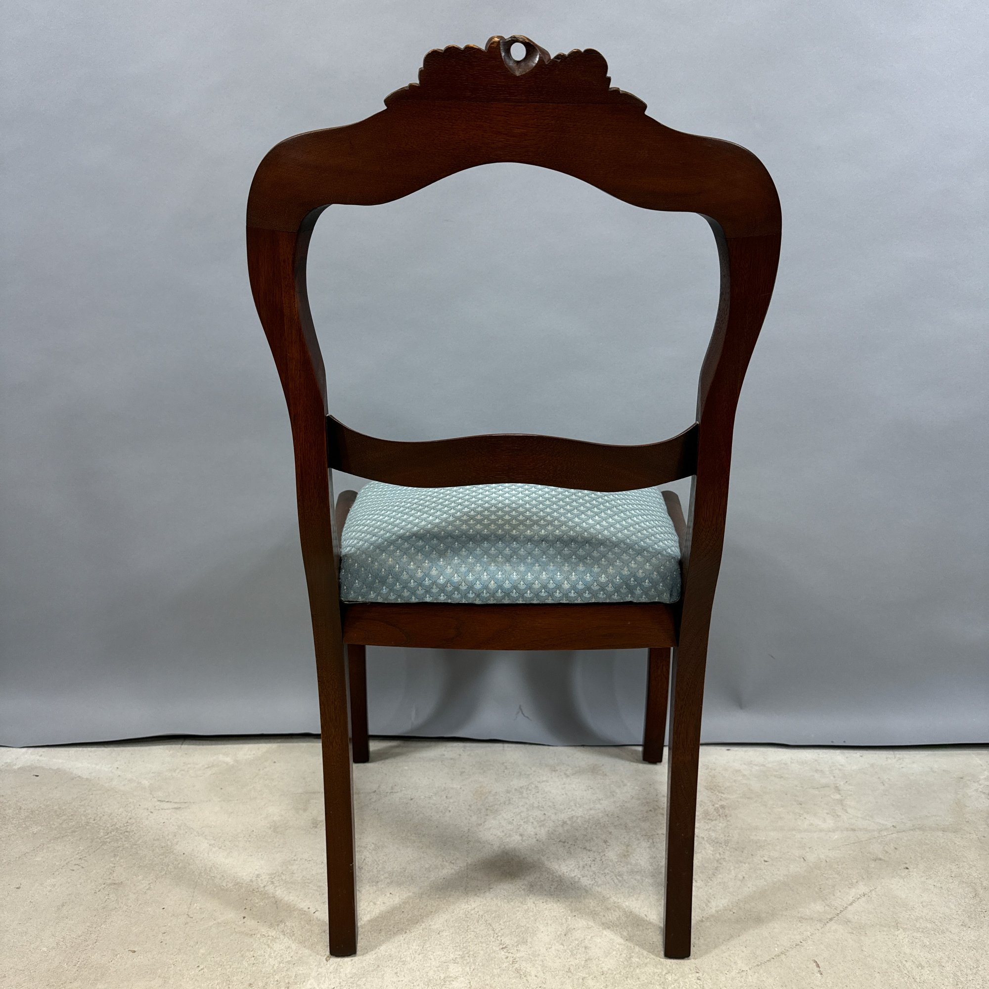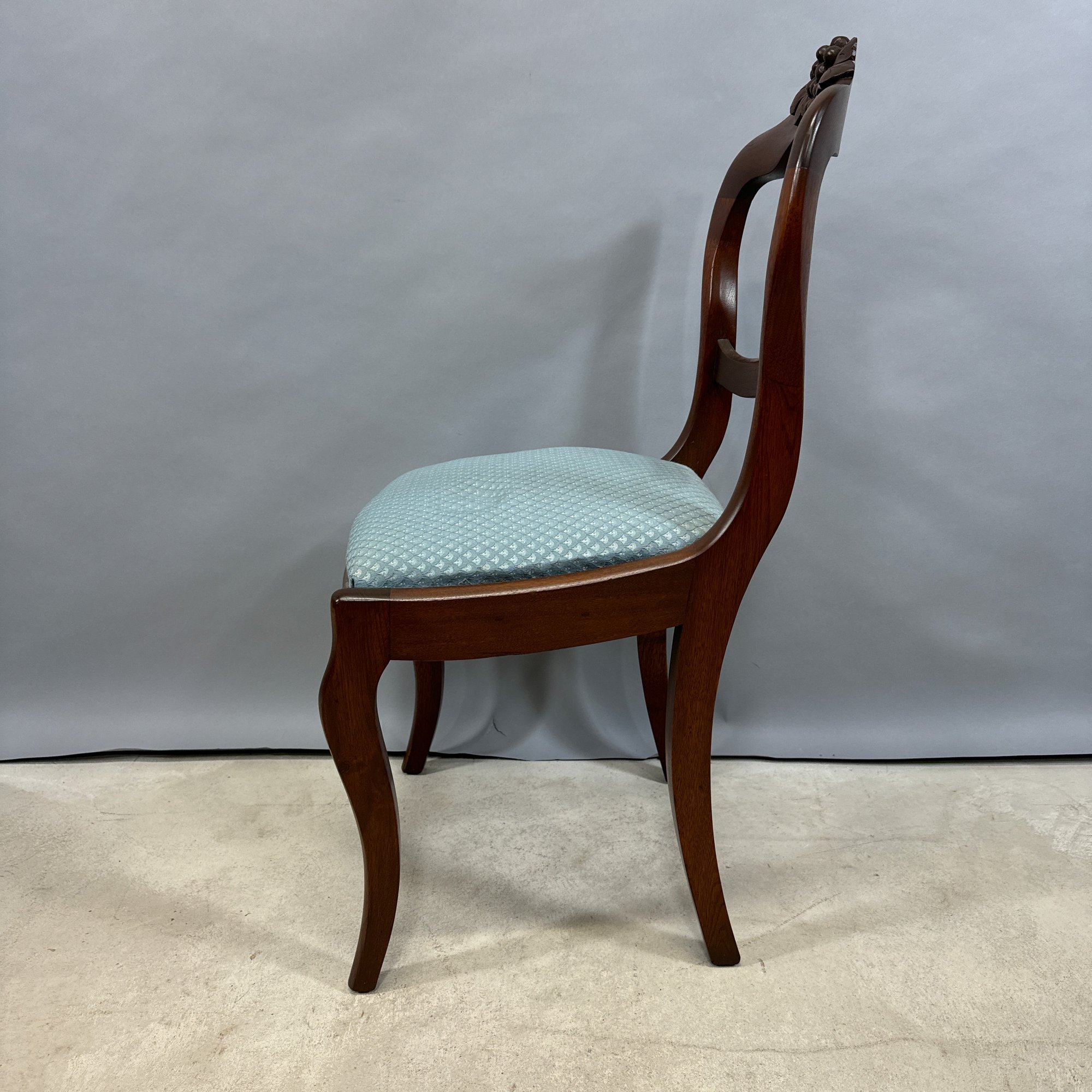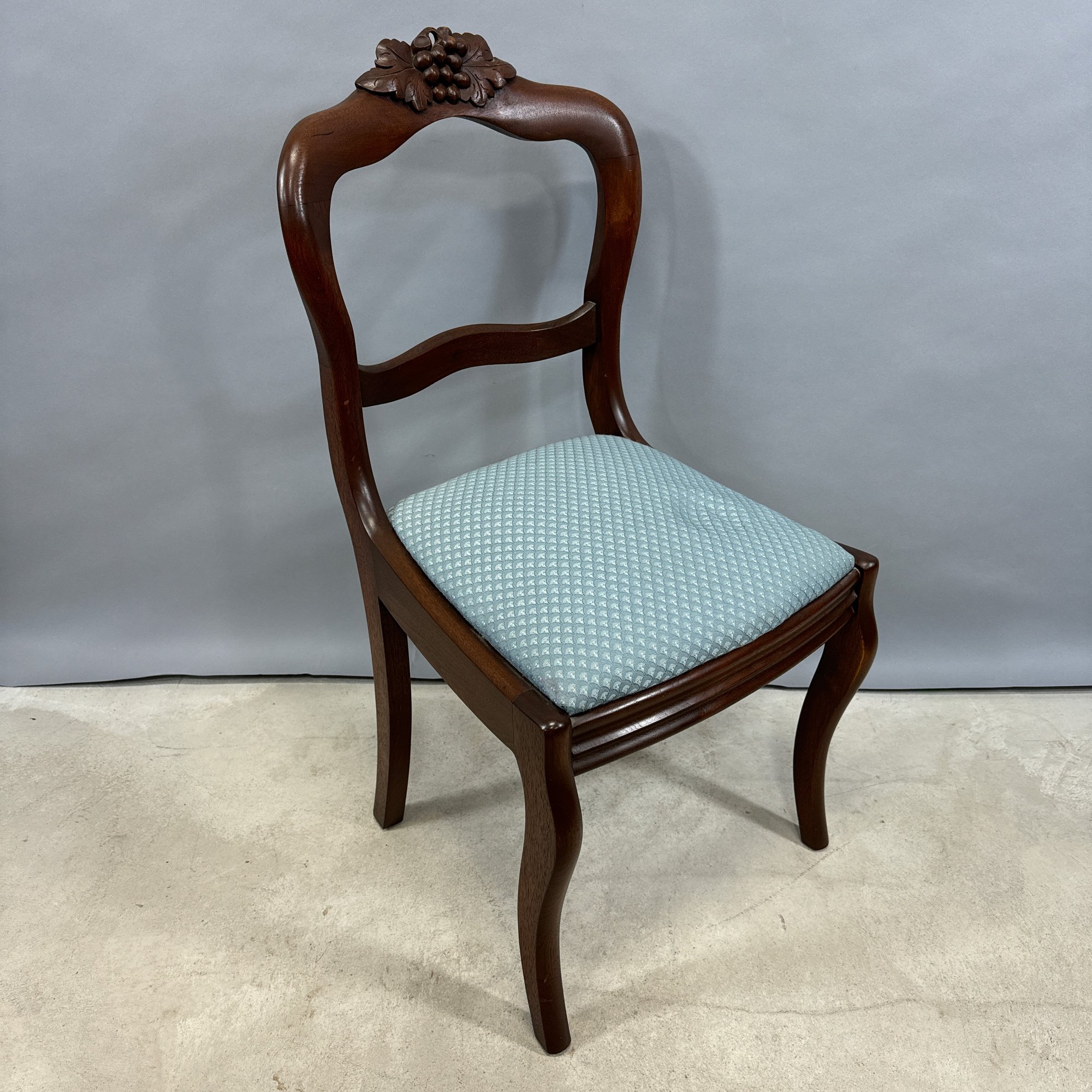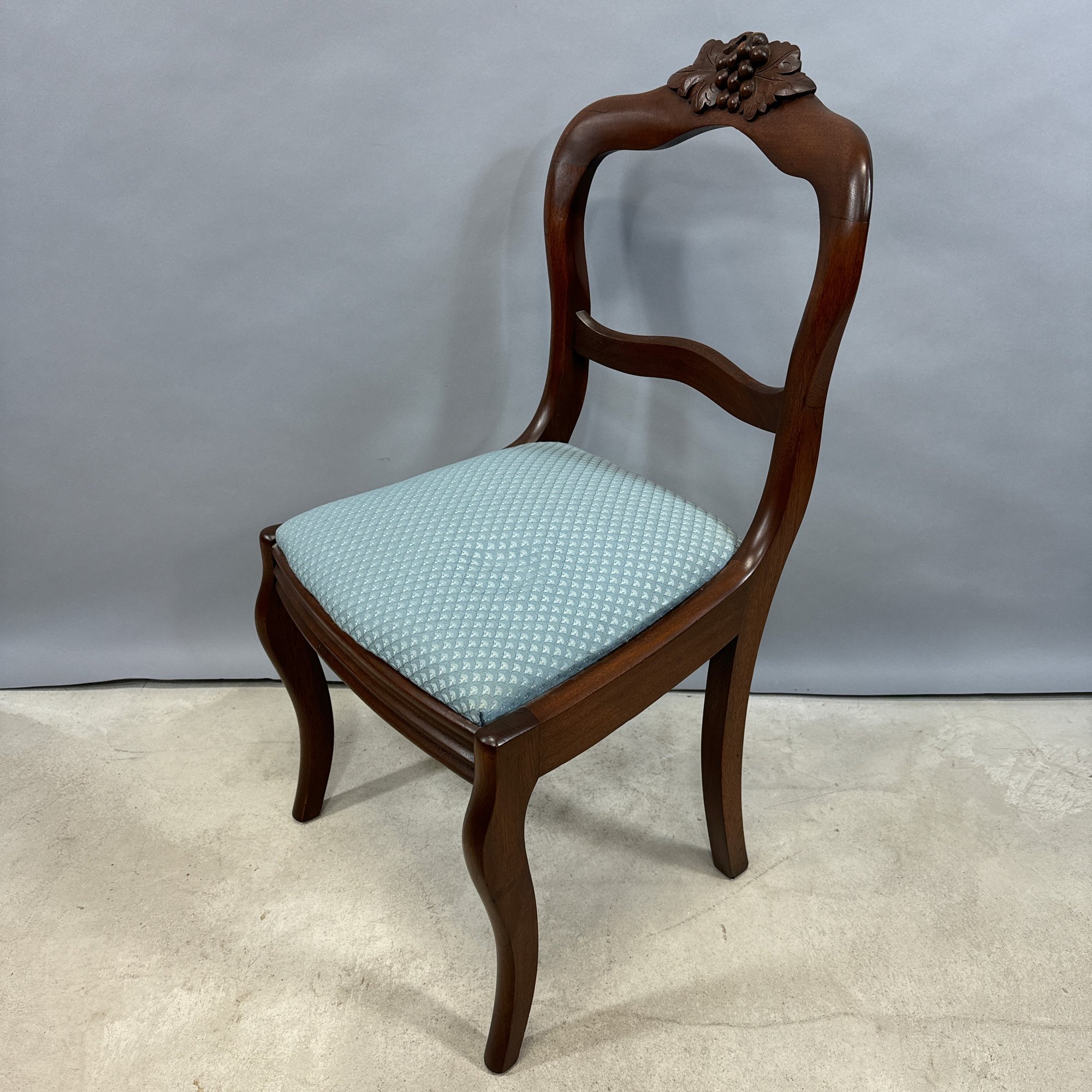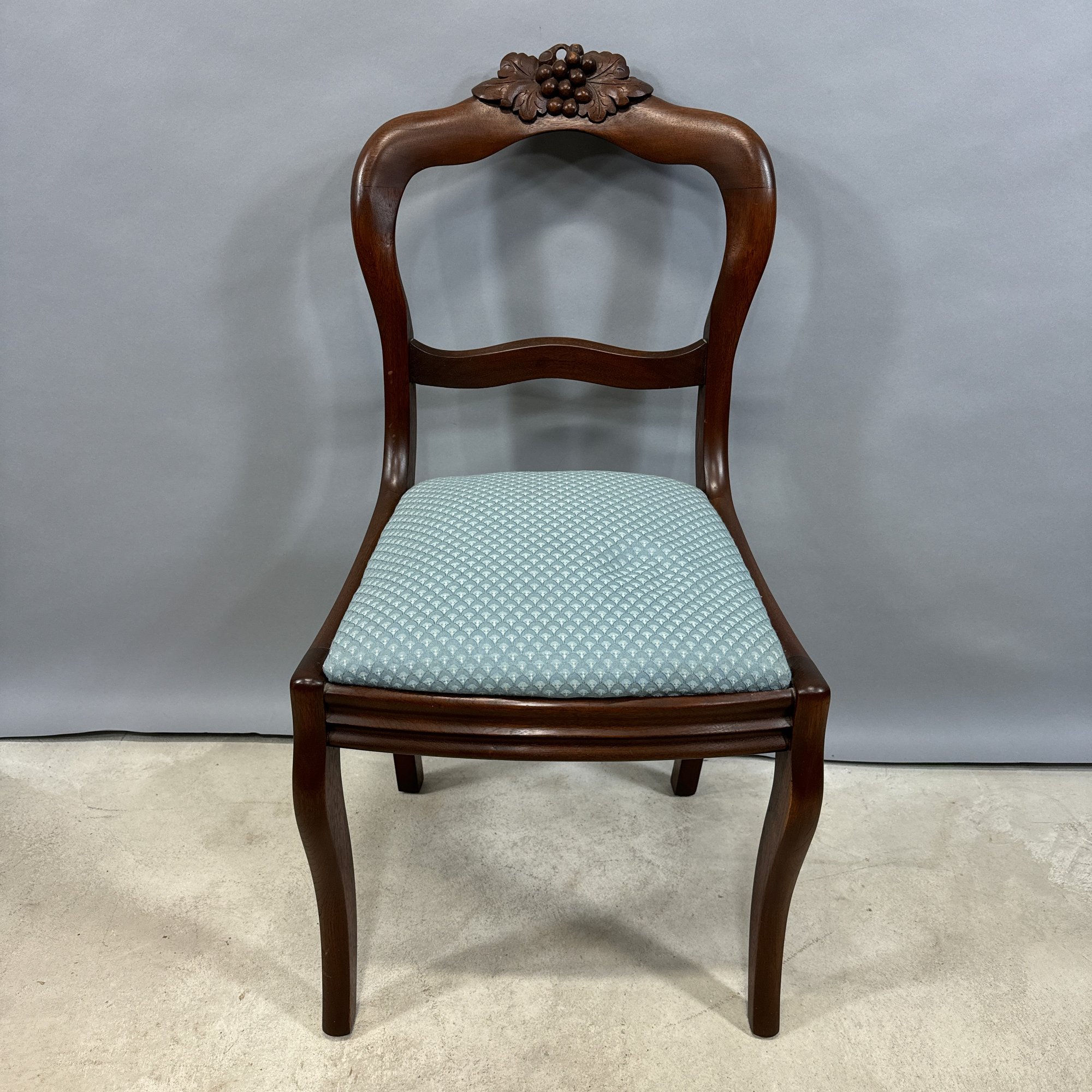 Rococo Revival Walnut Side Chair, Mid-19th Century. The serpentine-shaped back and splat surmounted by the crest of a bunch of grapes and leaves, the slip-seat and molded apron raised on frontal serpentine legs.
