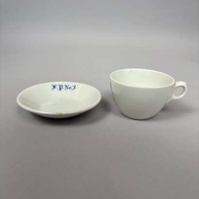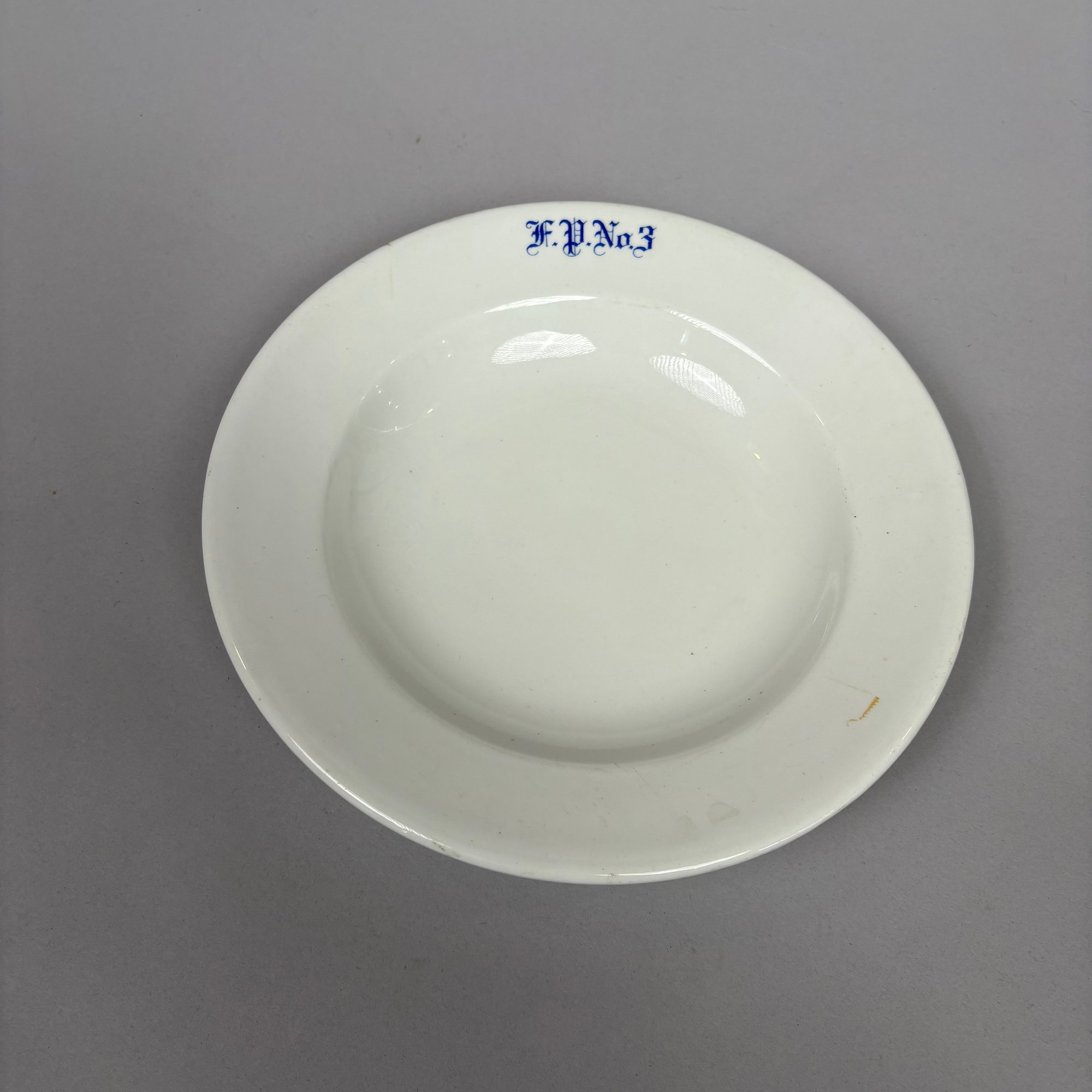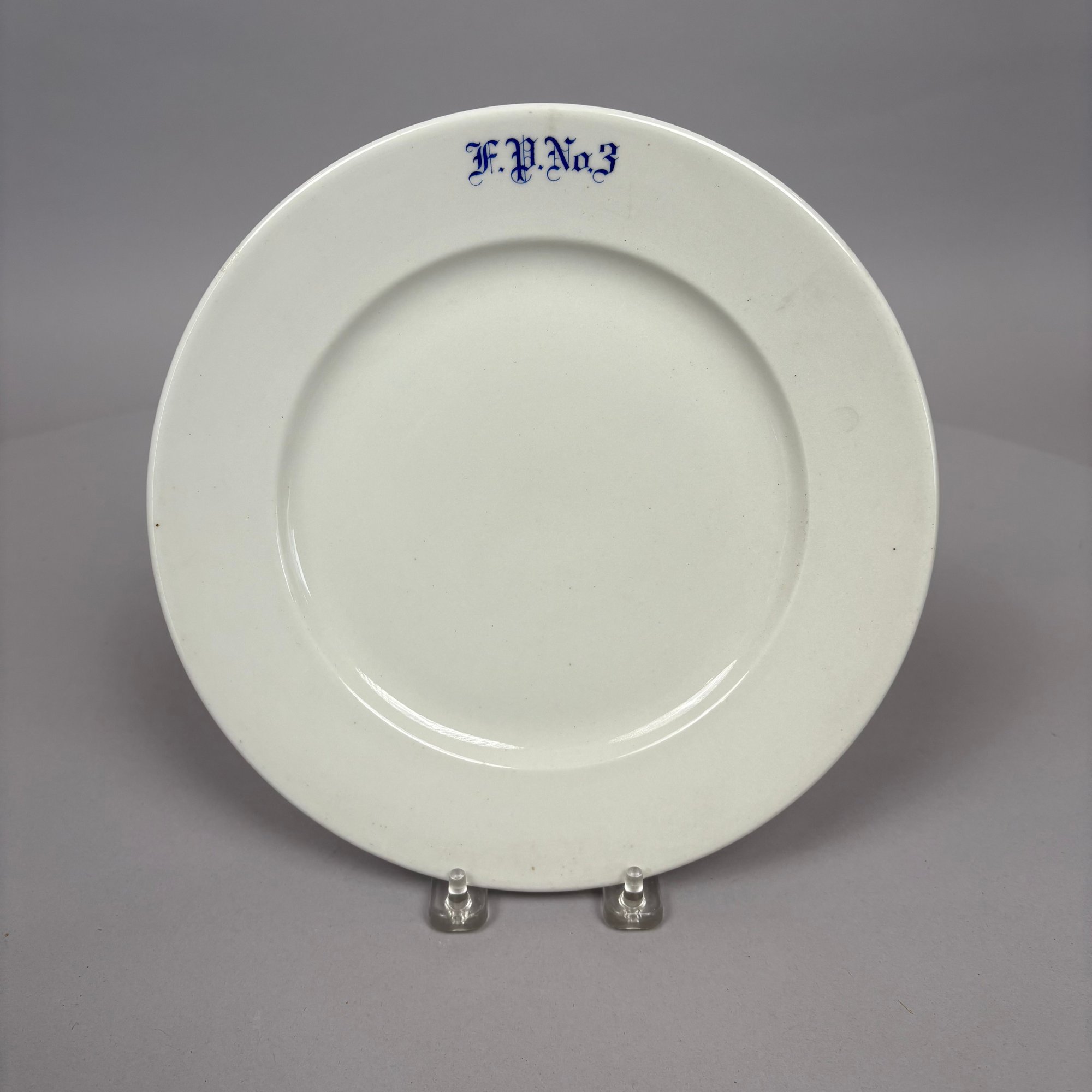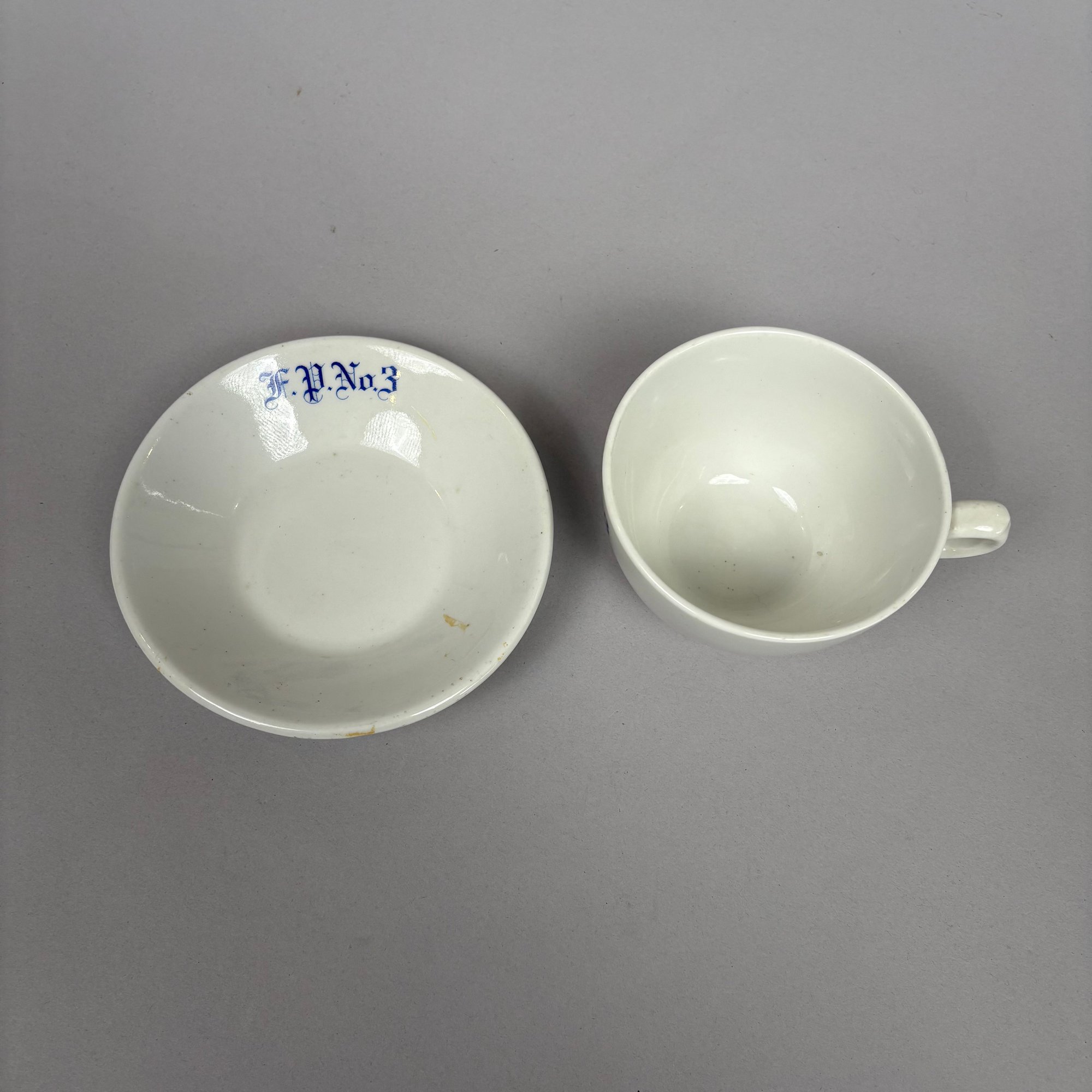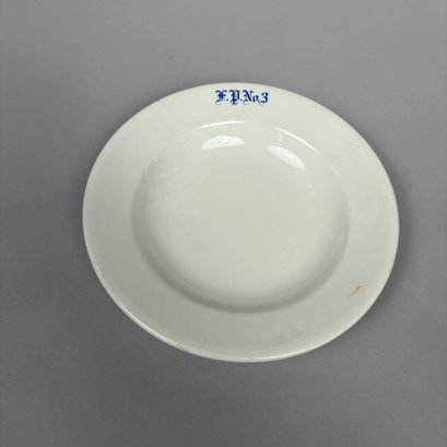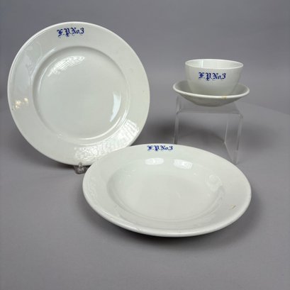 White Ironstone Hotel Ware "F.P. No. 3" Place Setting, Possibly for a Fire Department. Comprising a soup plate, dinner plate and cup and saucer, each stencilled "F.P. No.3" in blue.