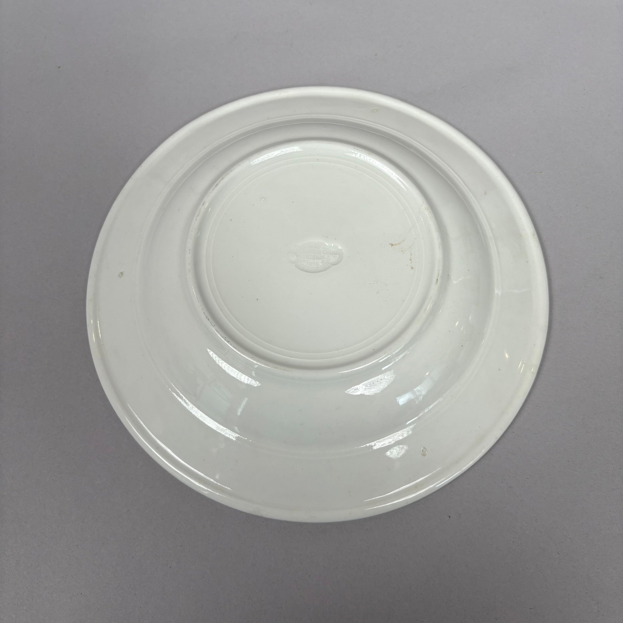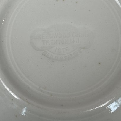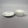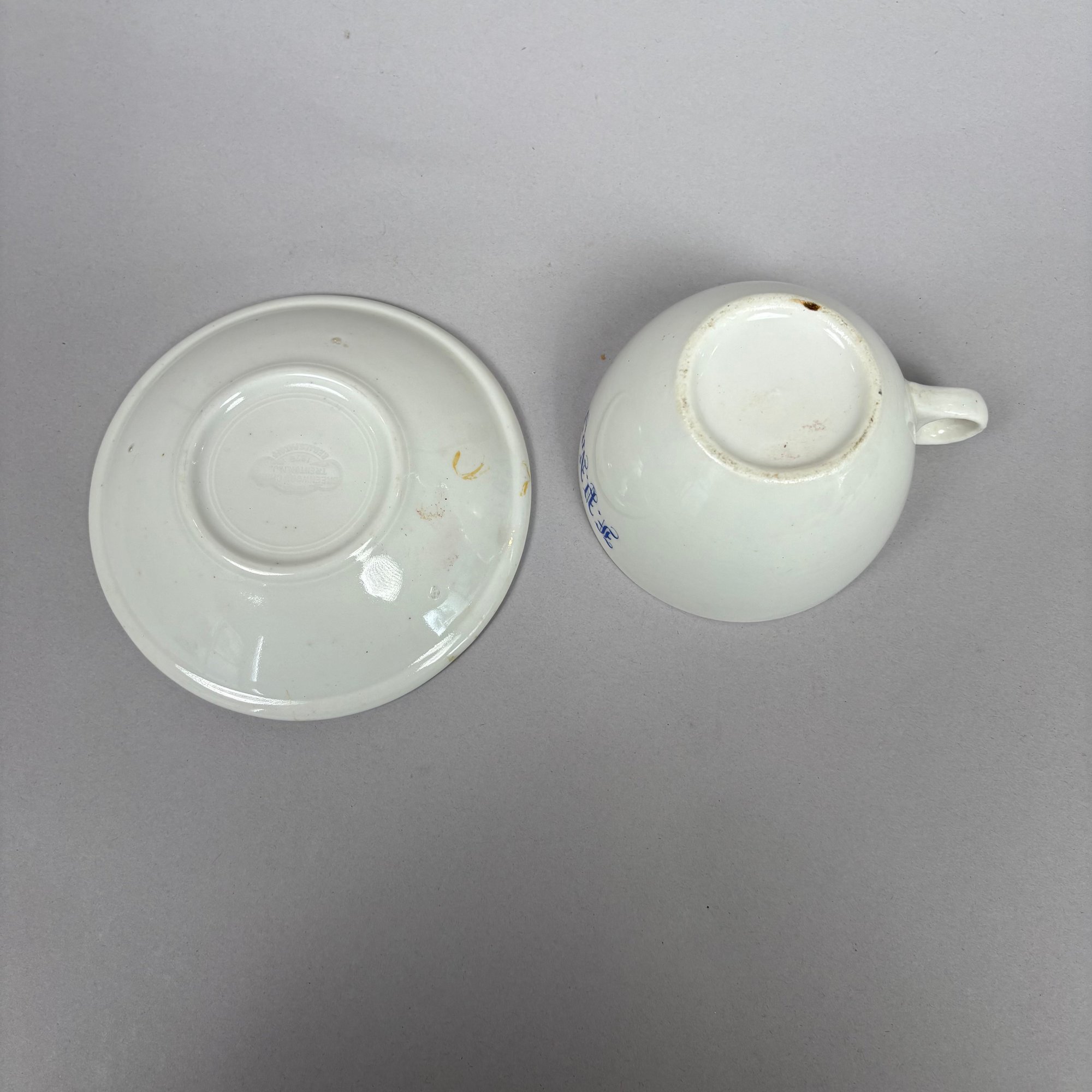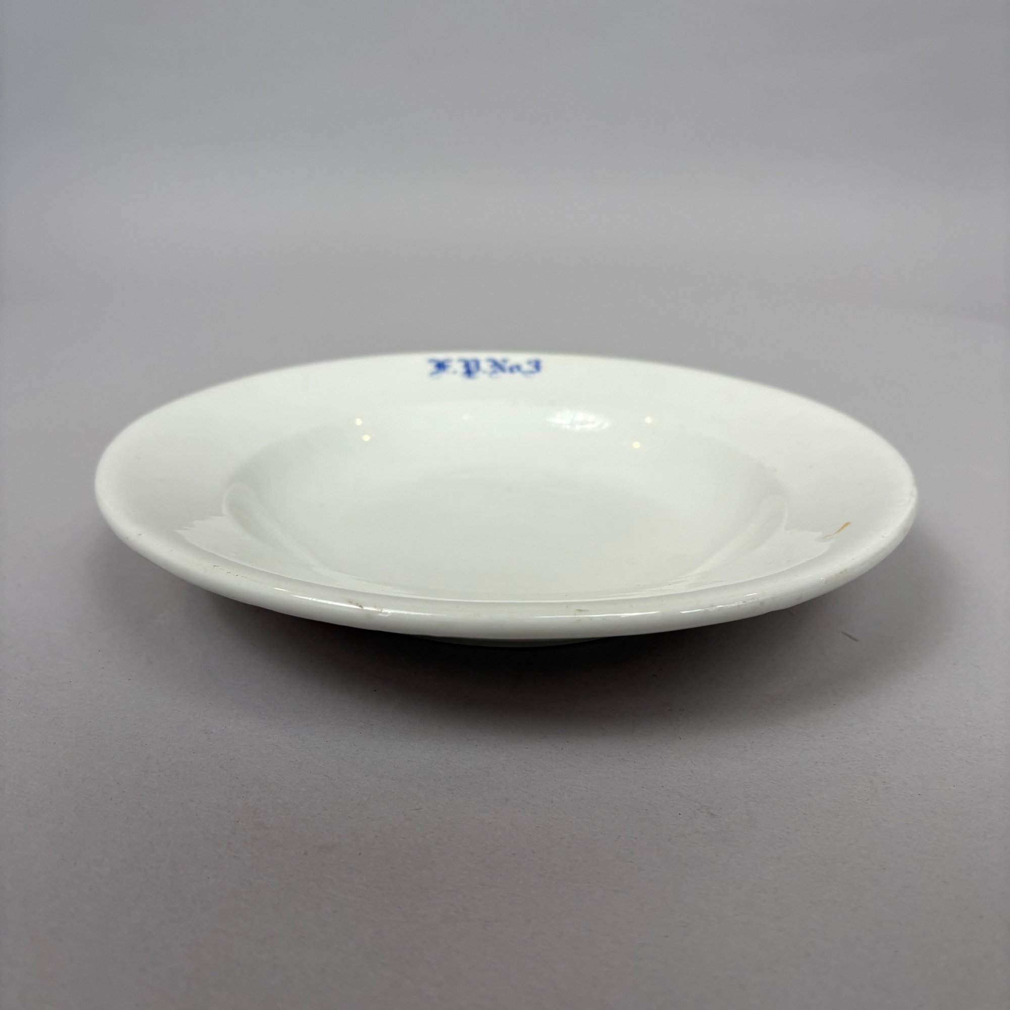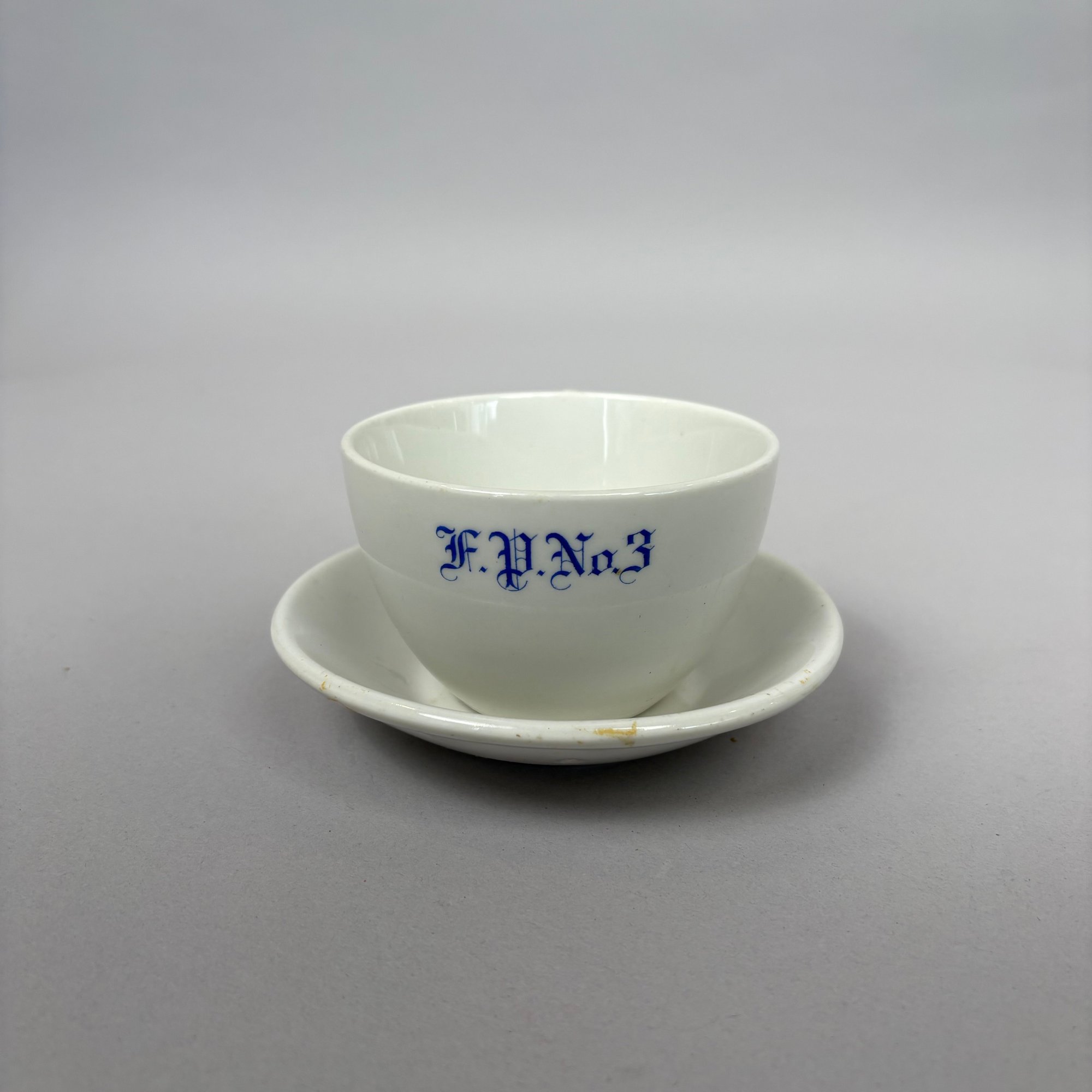 White Ironstone Hotel Ware "F.P. No. 3" Place Setting, Possibly for a Fire Department. Comprising a soup plate, dinner plate and cup and saucer, each stencilled "F.P. No.3" in blue.