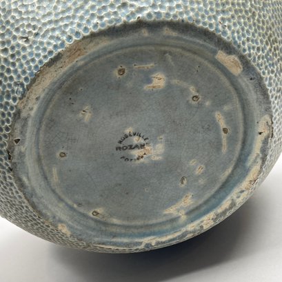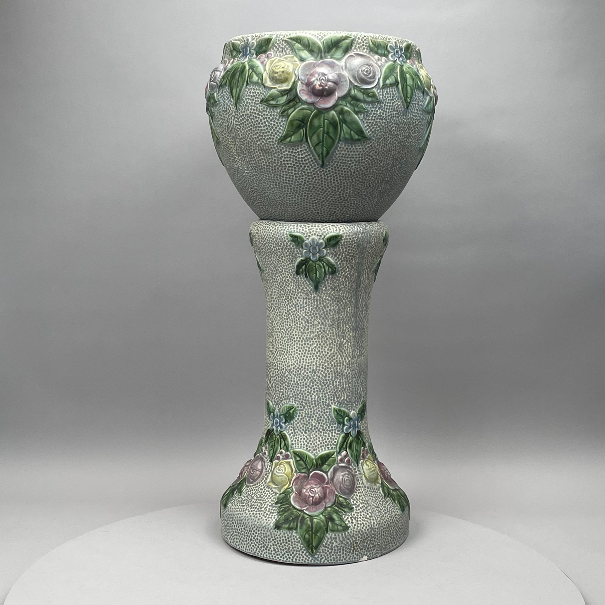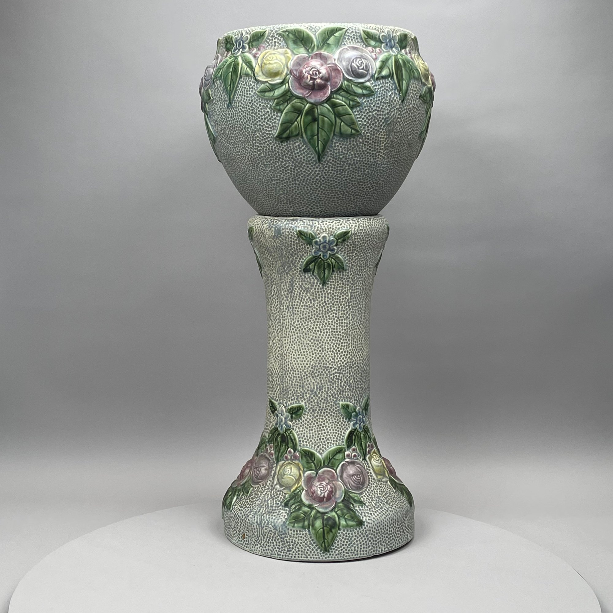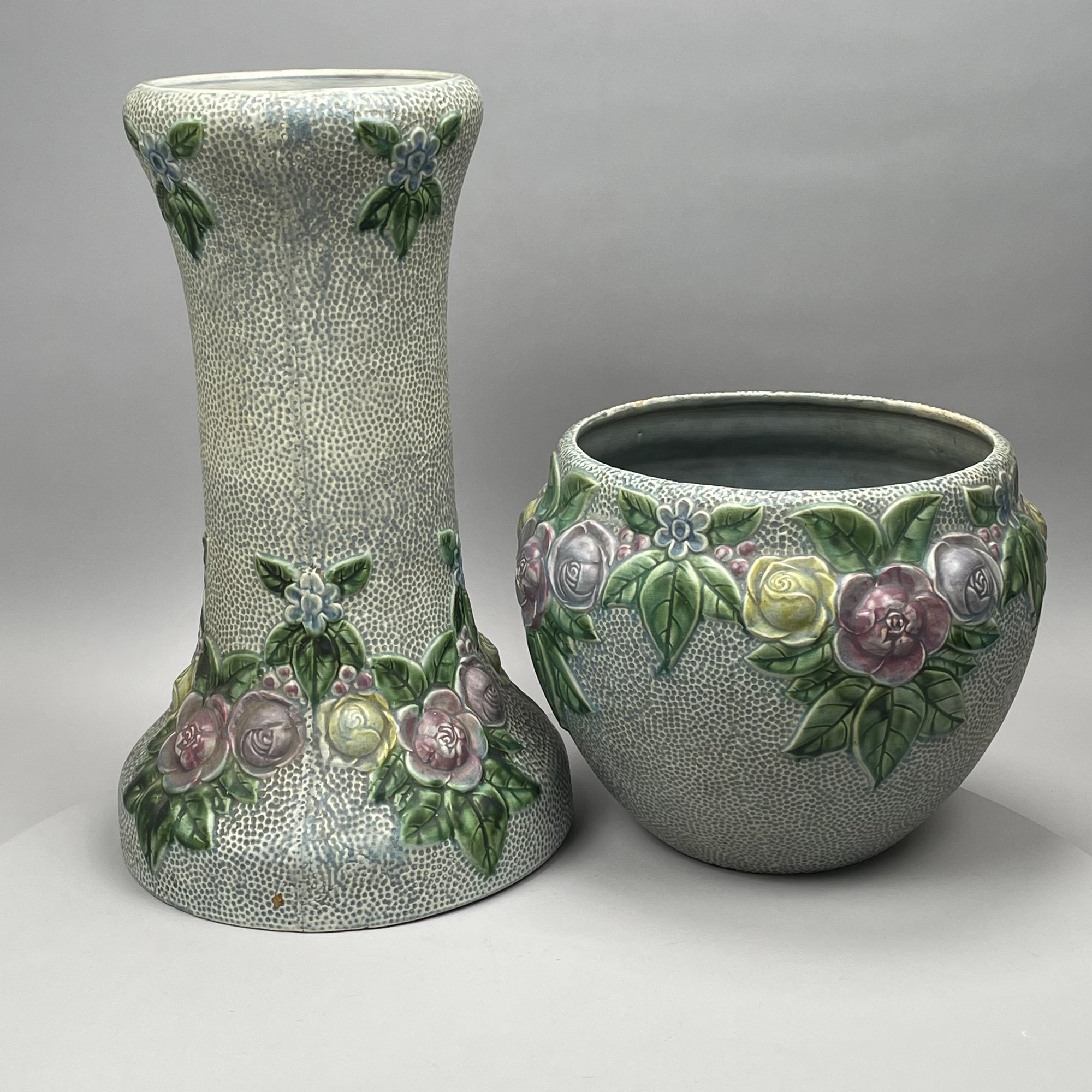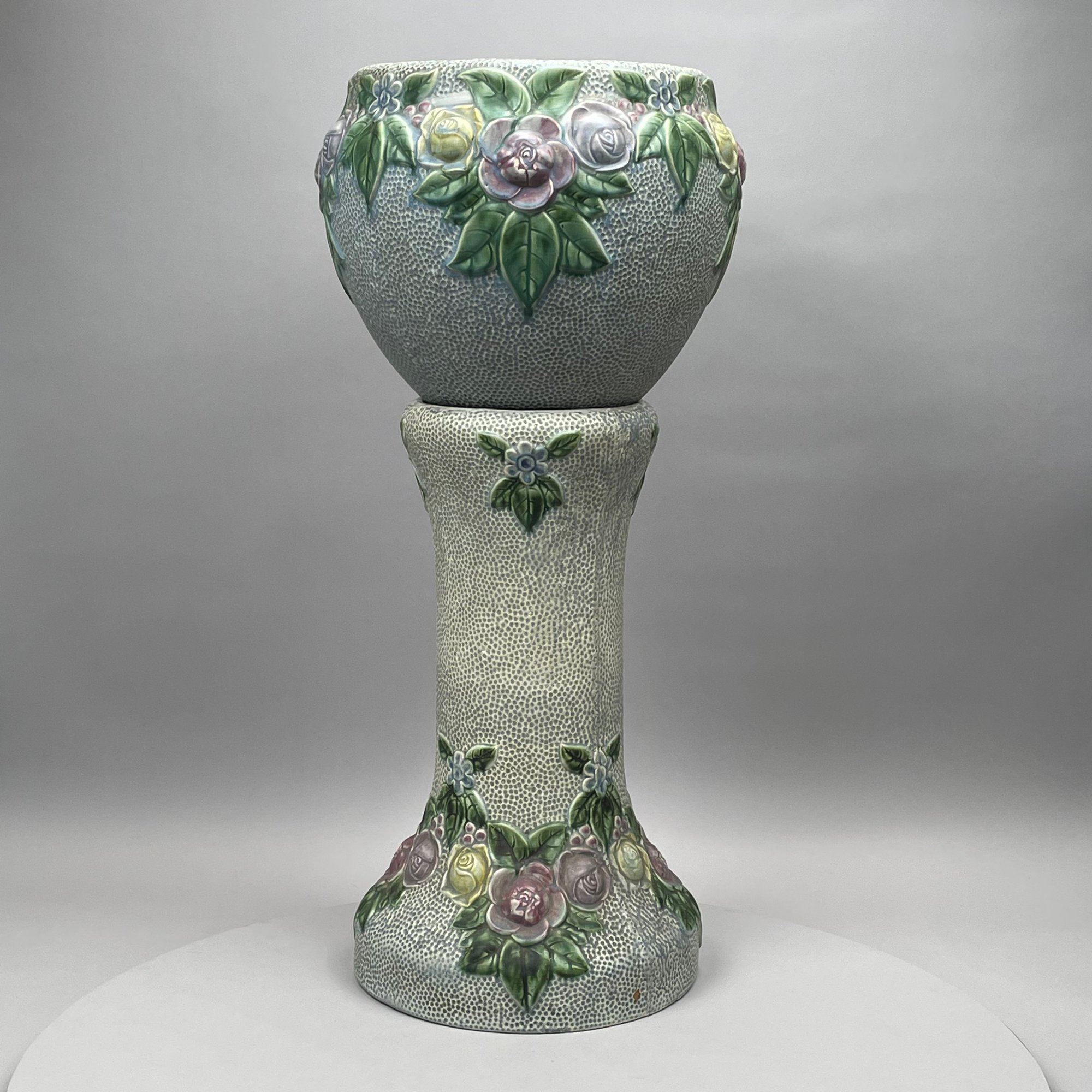 Roseville Pottery Company 'Rozane' Jardiniere and Pedestal, Zanesville, Ohio, Introduced in 1917. Each piece covered in blue glaze, each stamped "ROSEVILLE ROZANE POTTERY" in black ink.