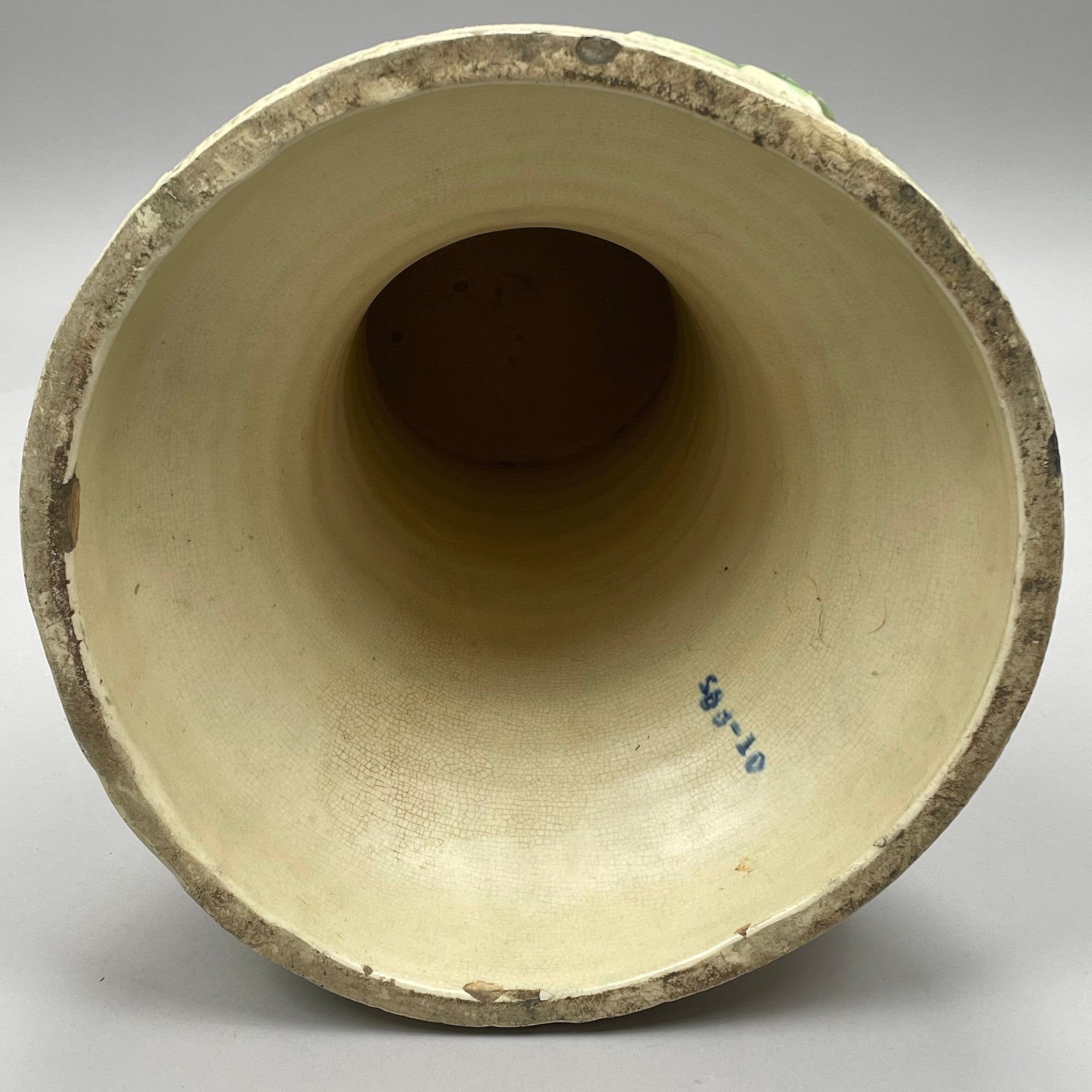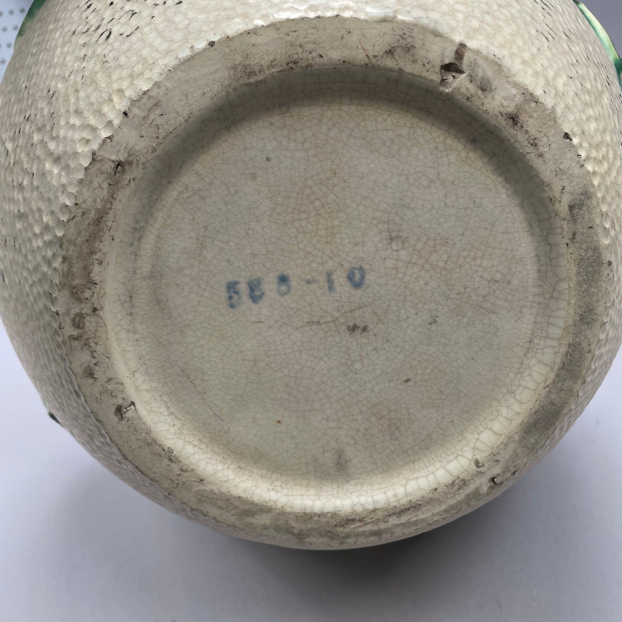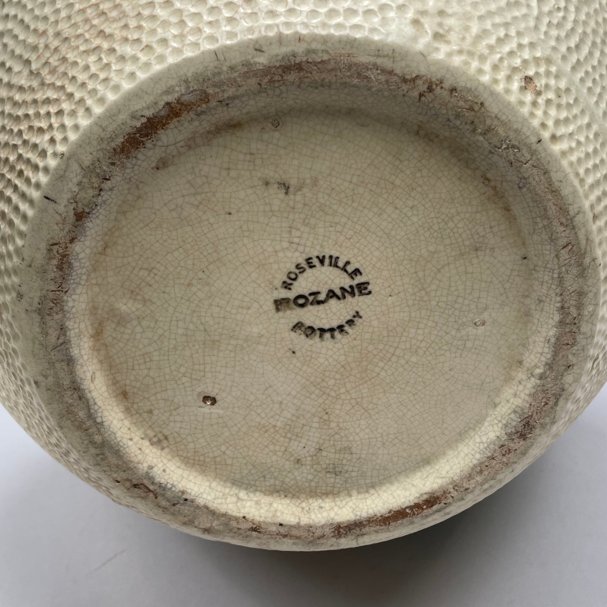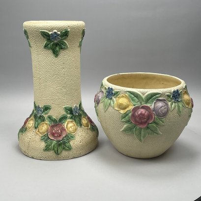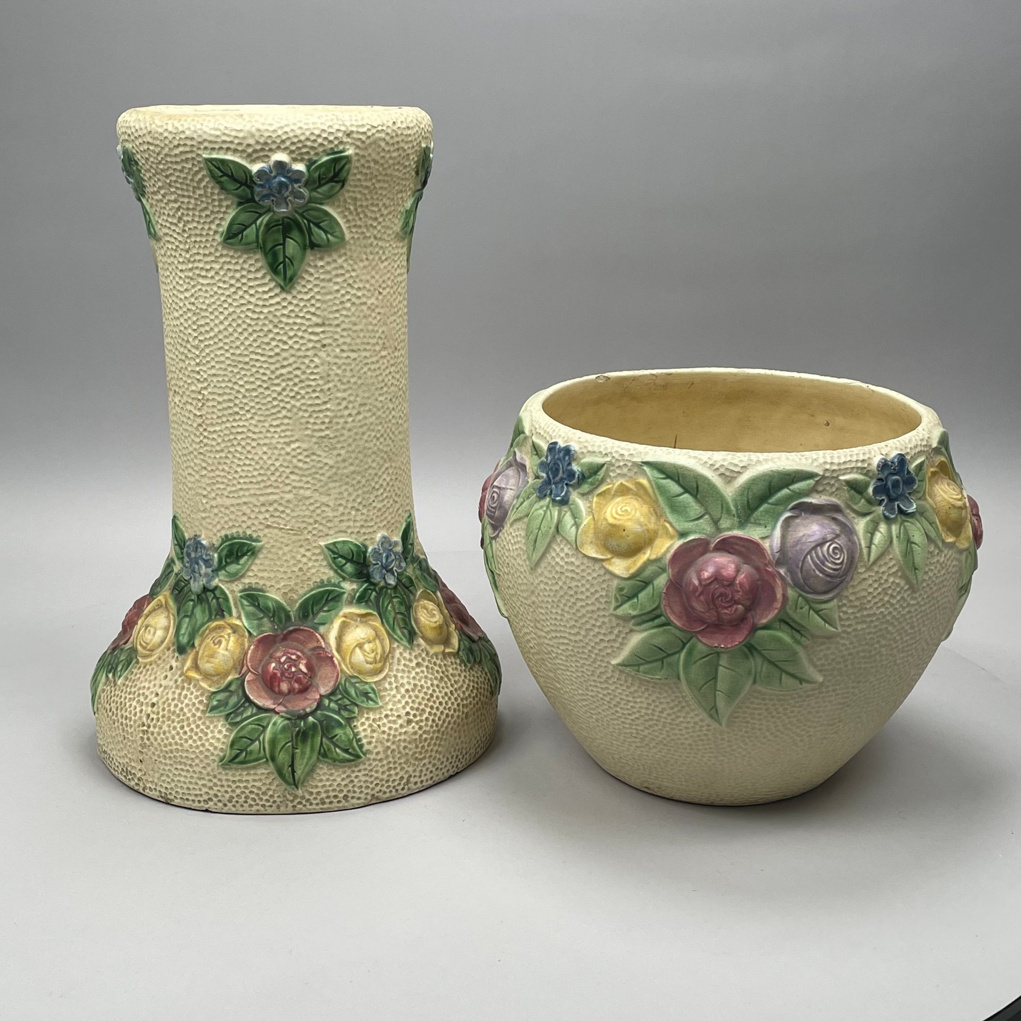 Roseville Pottery 'Rozane' Jardiniere and Pedestal, and a Single Jardiniere, Zanesville, Ohio, Introduced in 1917. The jardiniere and pedestal each printed "585-10" in blue ink, the second jardiniere stamped "ROSEVILLE ROZANE POTTERY" in black ink.