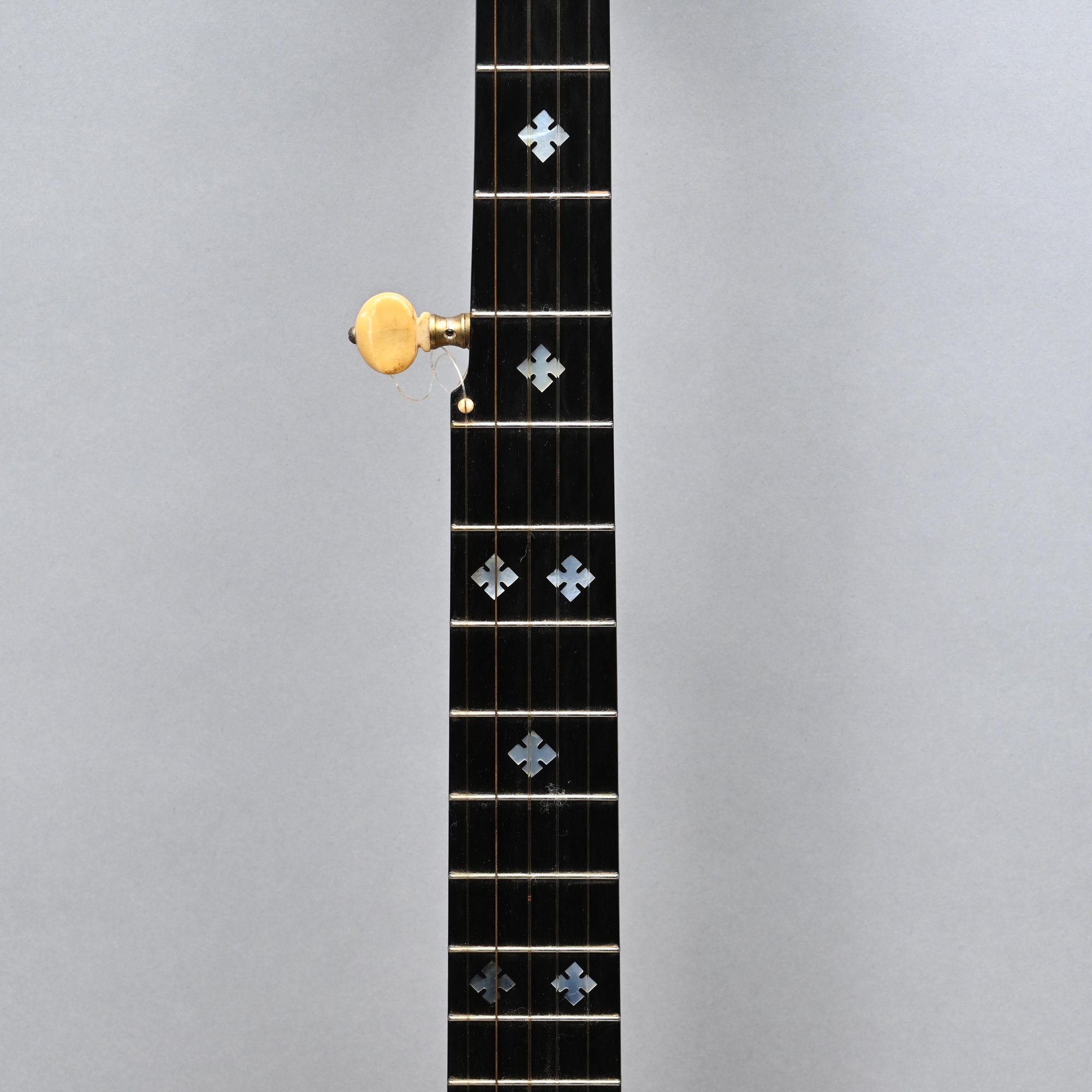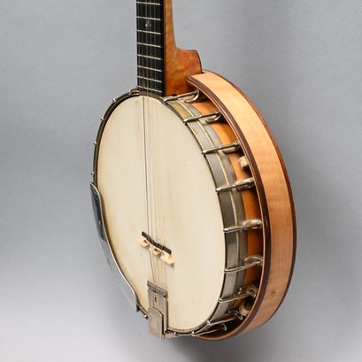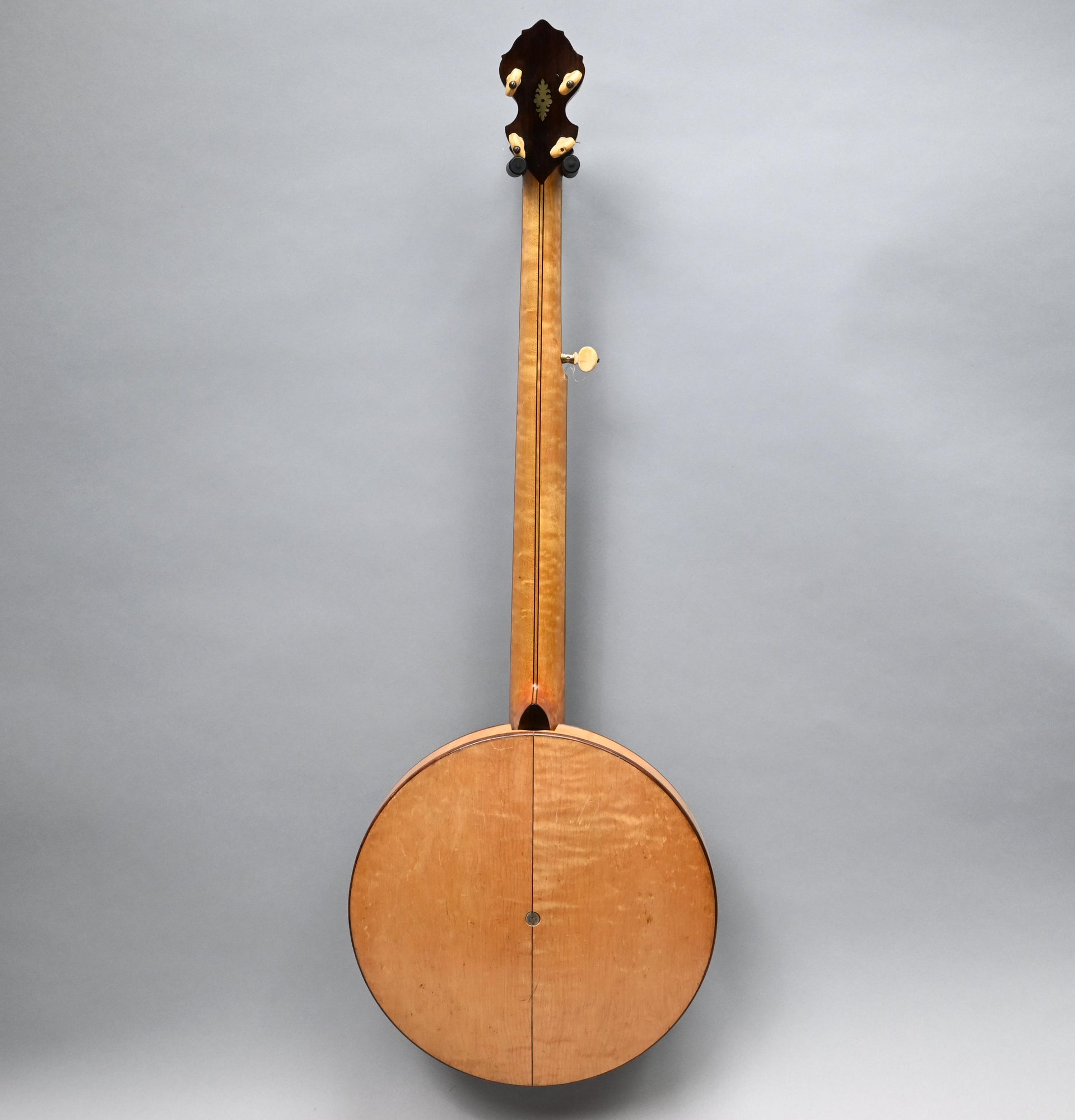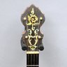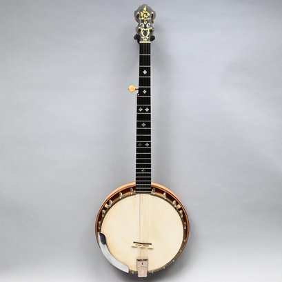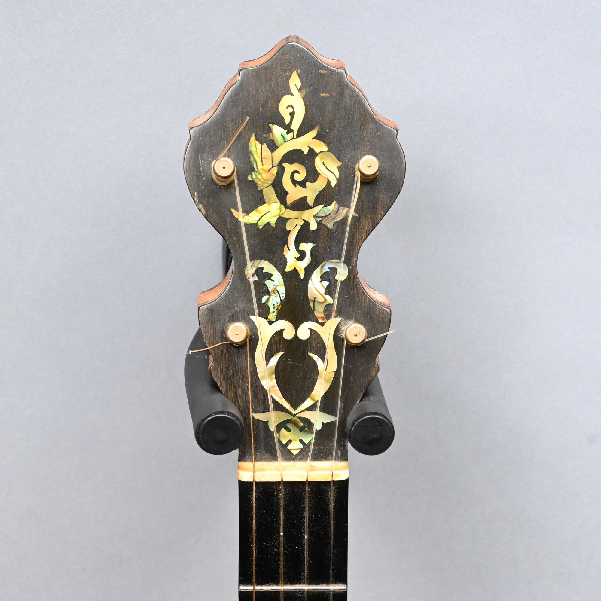 Rosewood, Maple and Mother-of-Pearl Inlaid Five-String Resonator Banjo. With Prucha Presto tailpiece, inlaid in gold plate on the peghead with scroll foliate devices with one on the reverse, the neck inlaid in mother-of-pearl with snowflakes.
