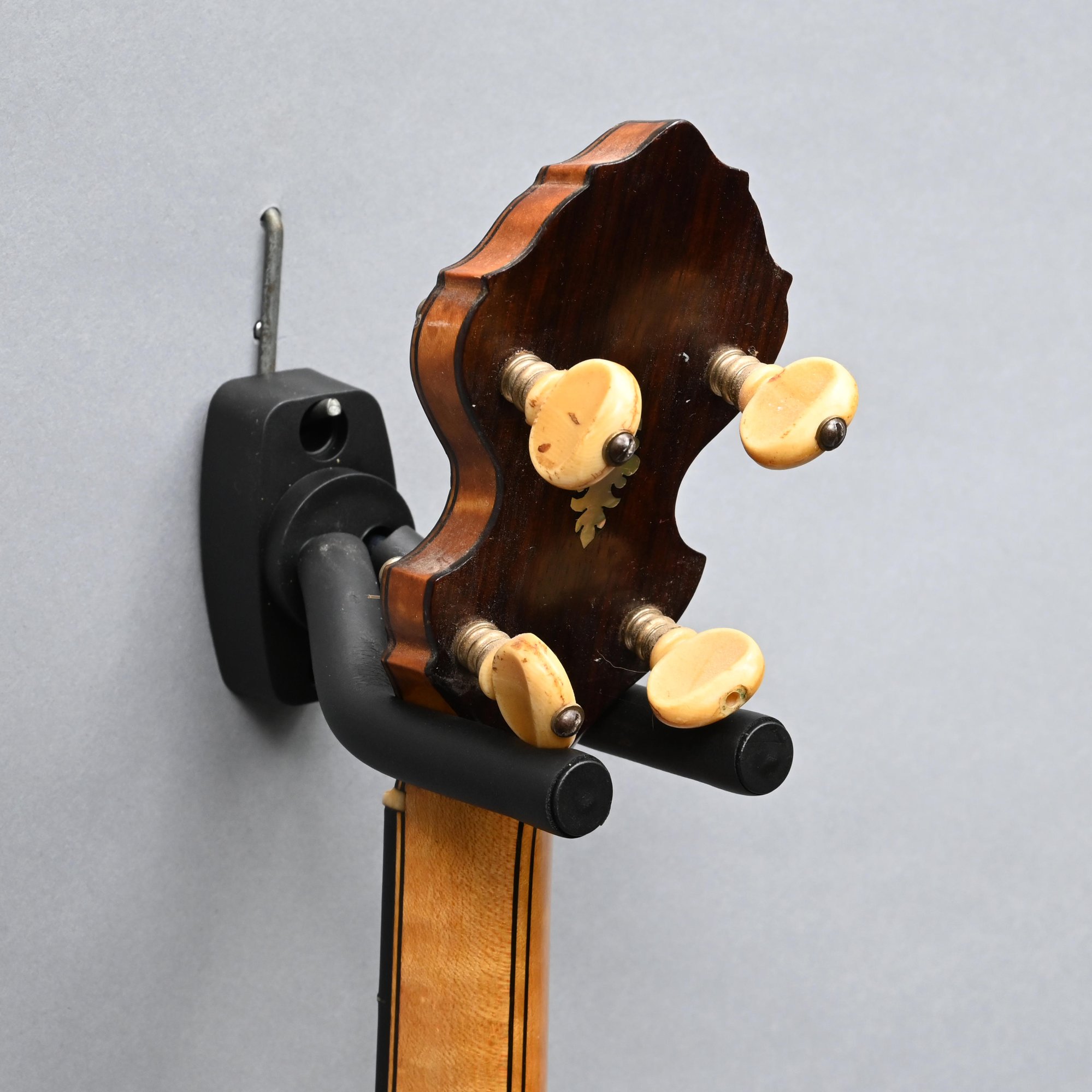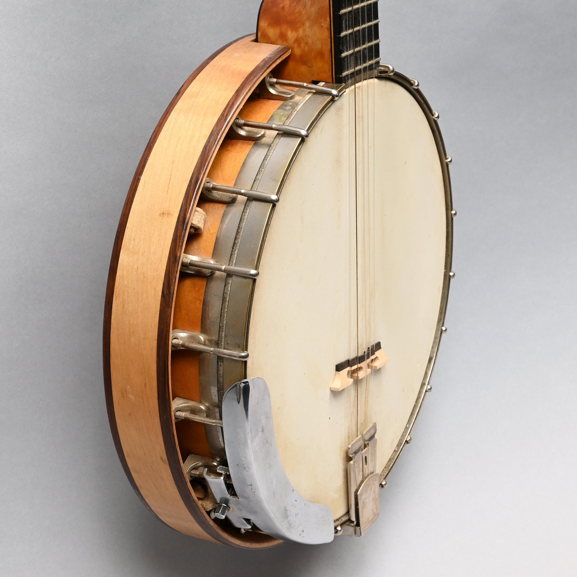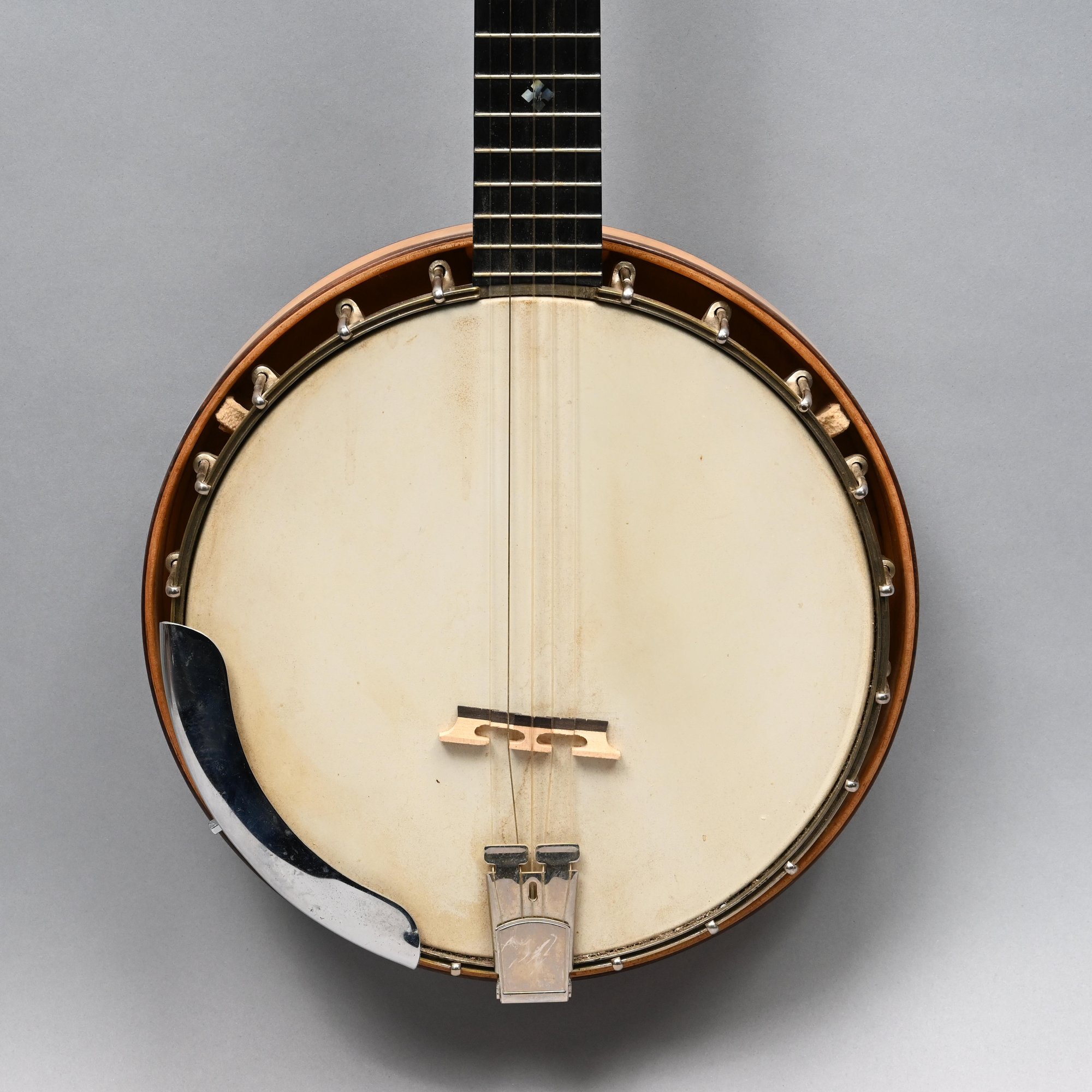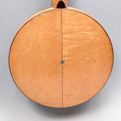 Rosewood, Maple and Mother-of-Pearl Inlaid Five-String Resonator Banjo. With Prucha Presto tailpiece, inlaid in gold plate on the peghead with scroll foliate devices with one on the reverse, the neck inlaid in mother-of-pearl with snowflakes.