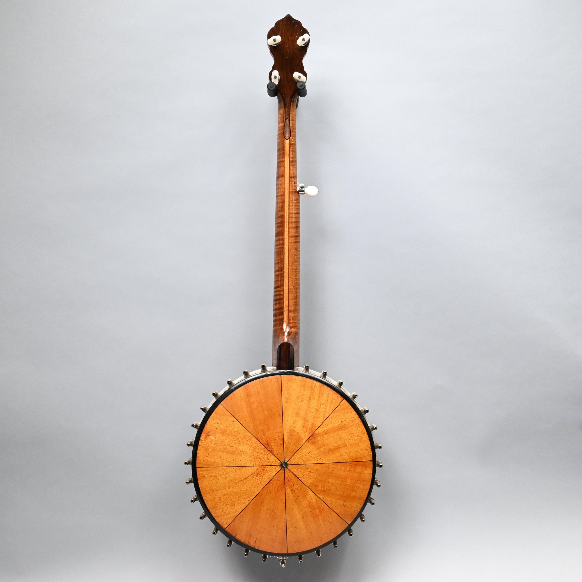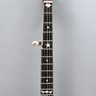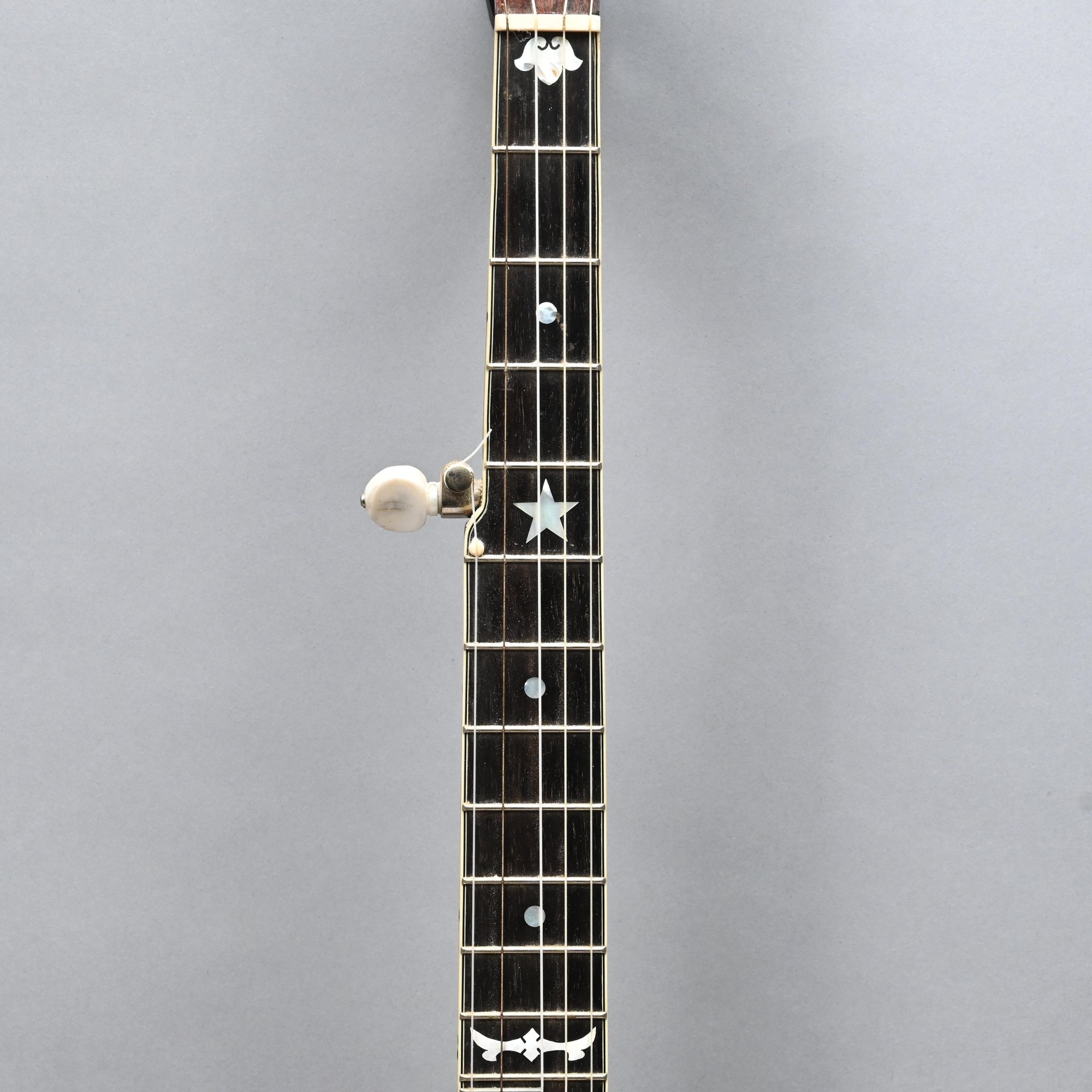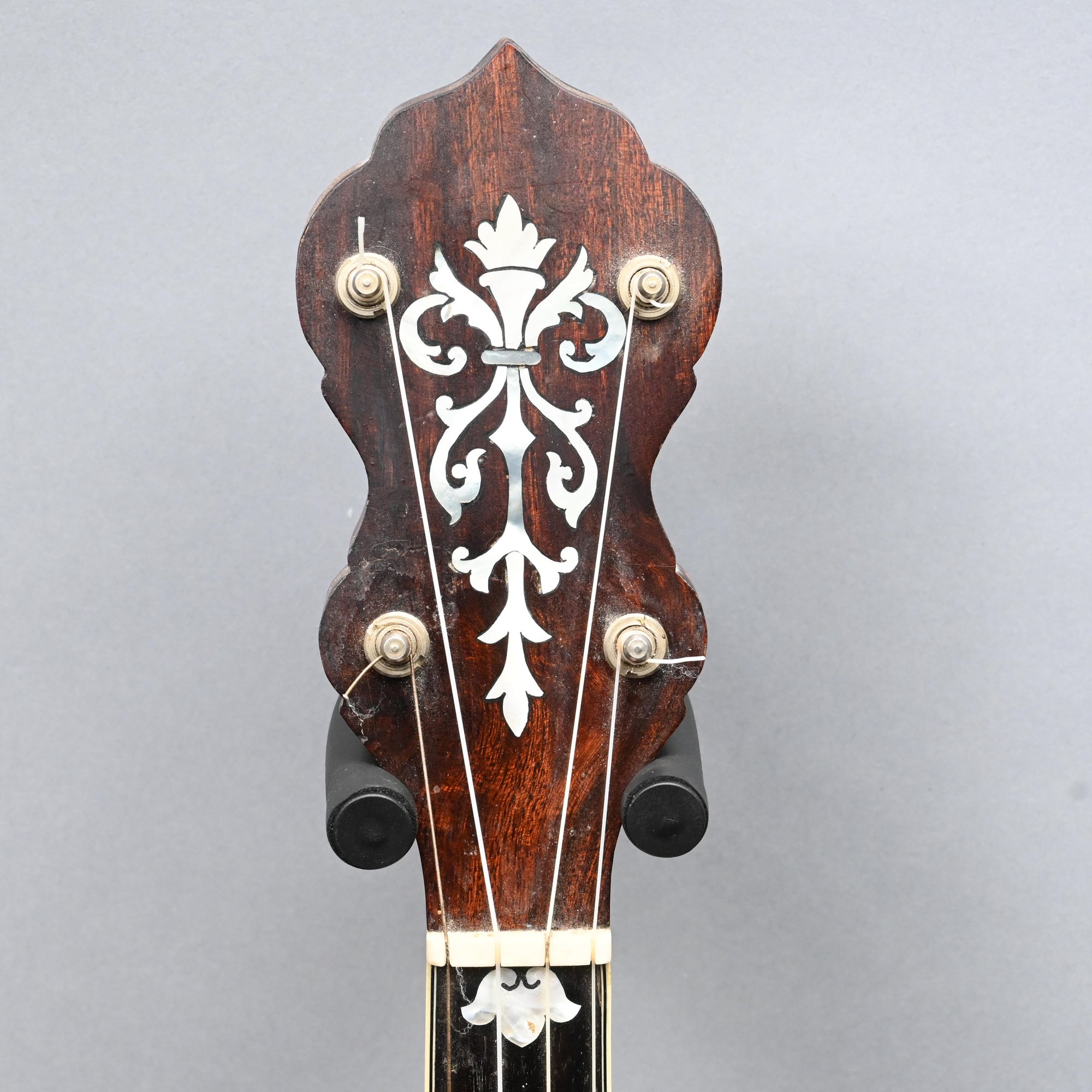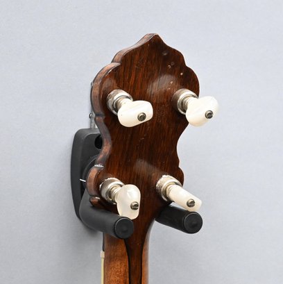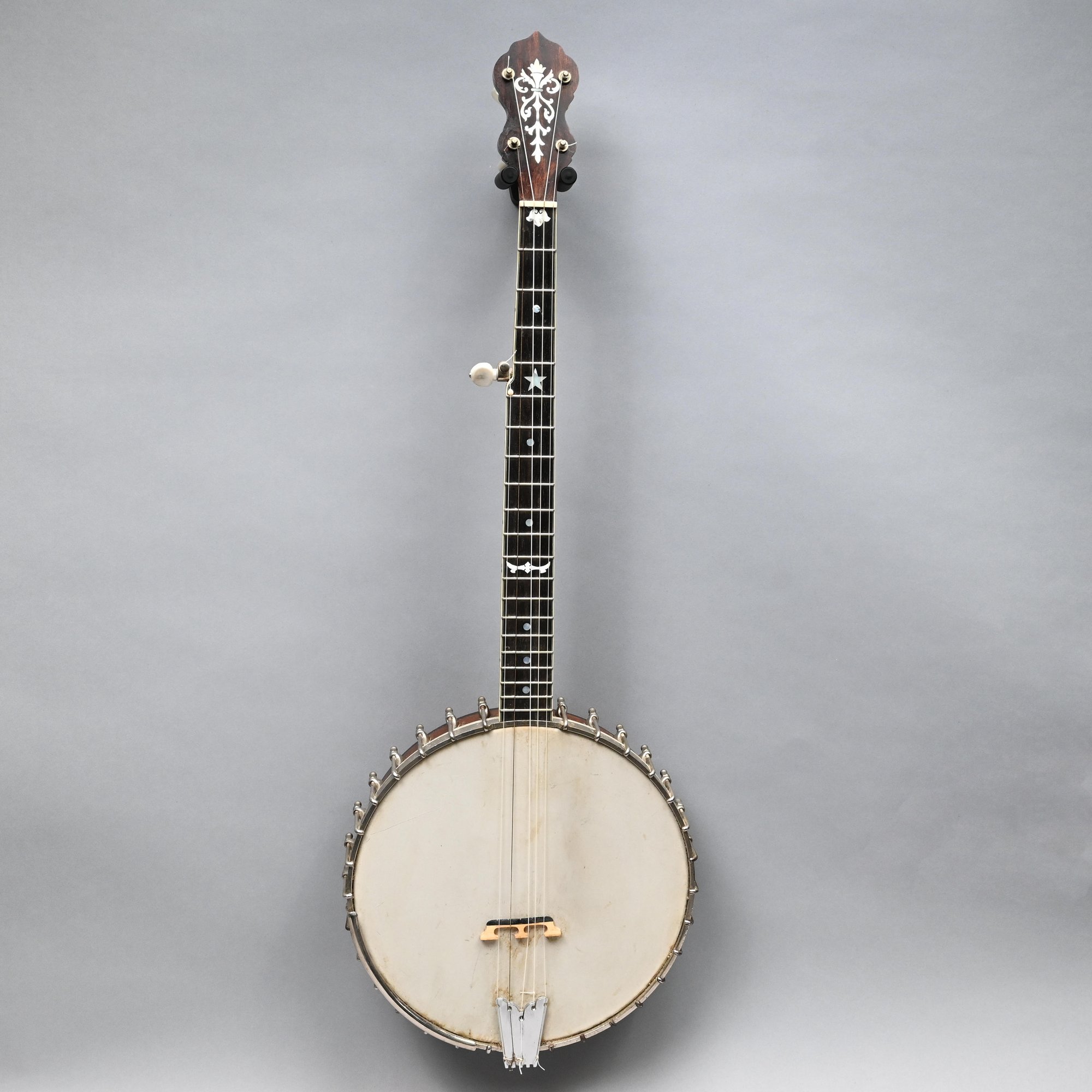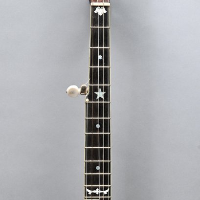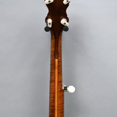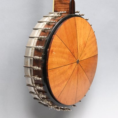 Rosewood, Tiger Maple, Maple and Mother-of-Pearl Inlaid Five-String Resonator Banjo. Inlaid in mother-of-pearl on the peghead with a torch and pendant scrolls and leaves, a star and geometric device on the neck.