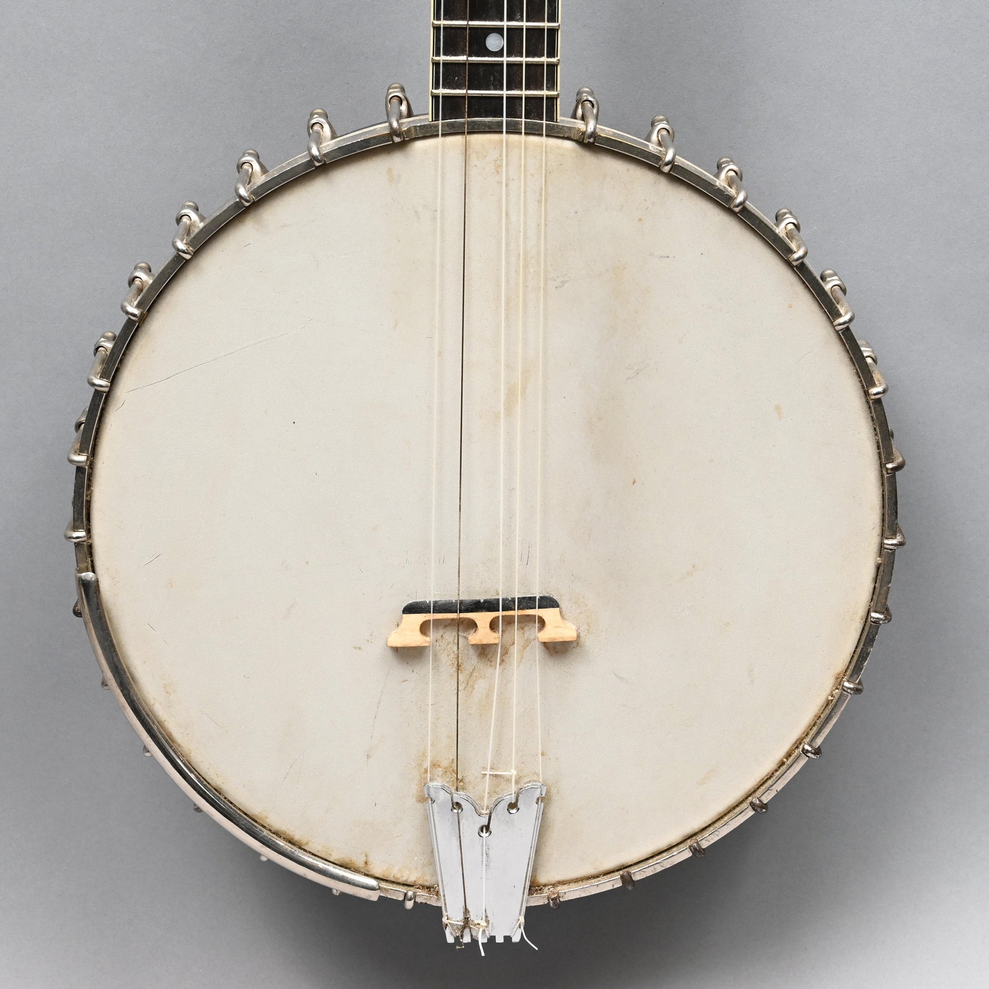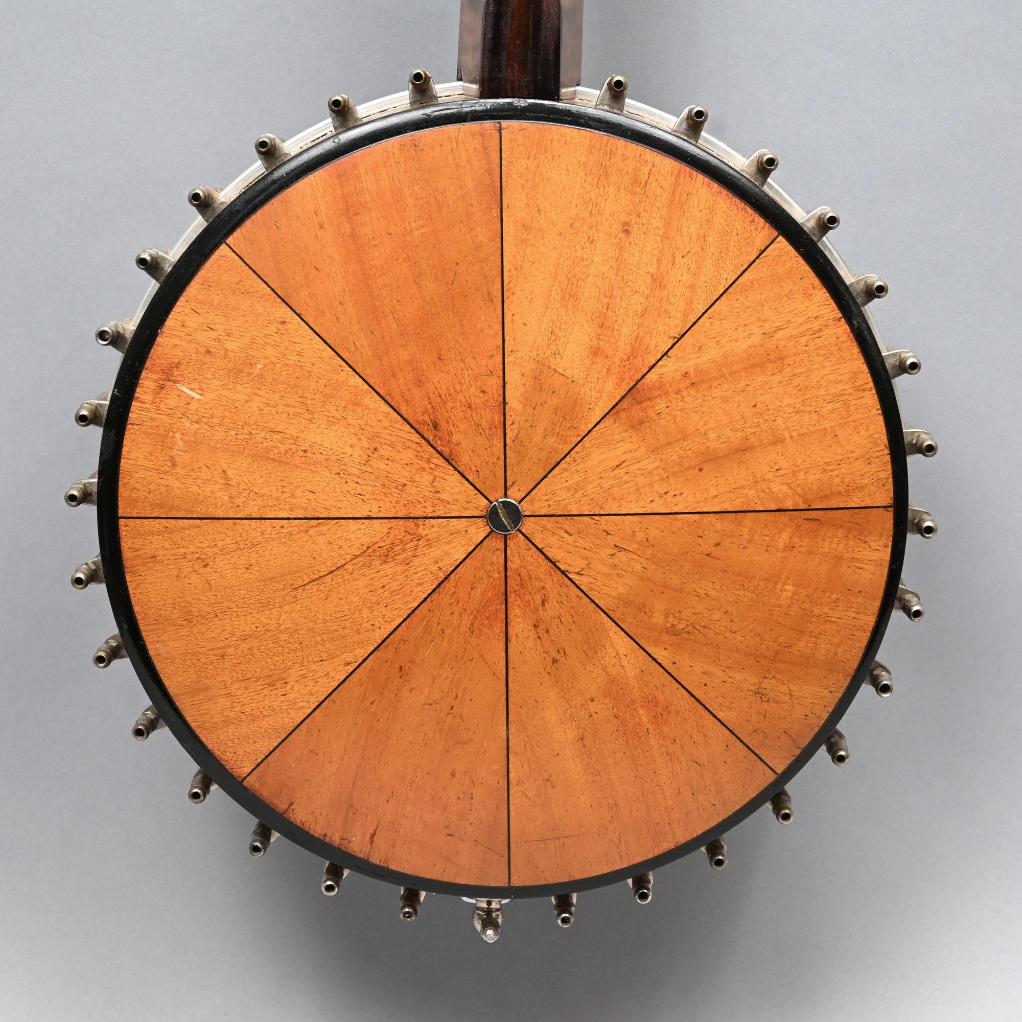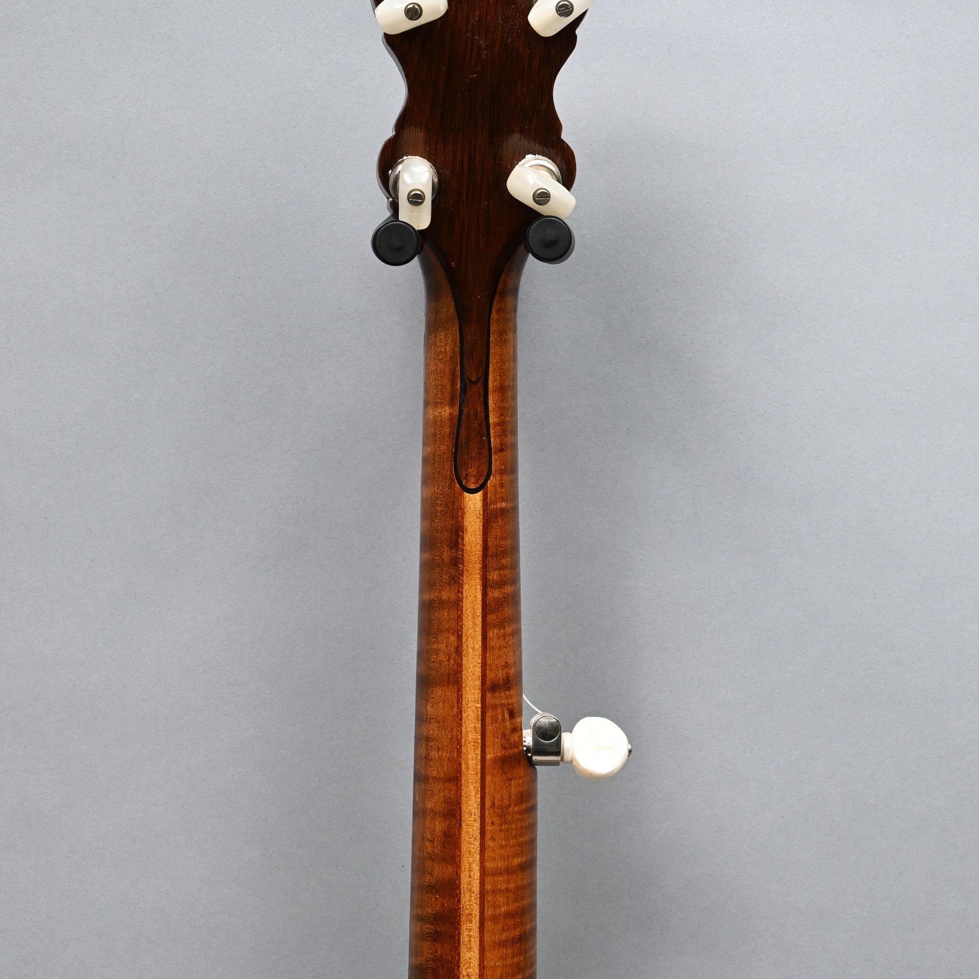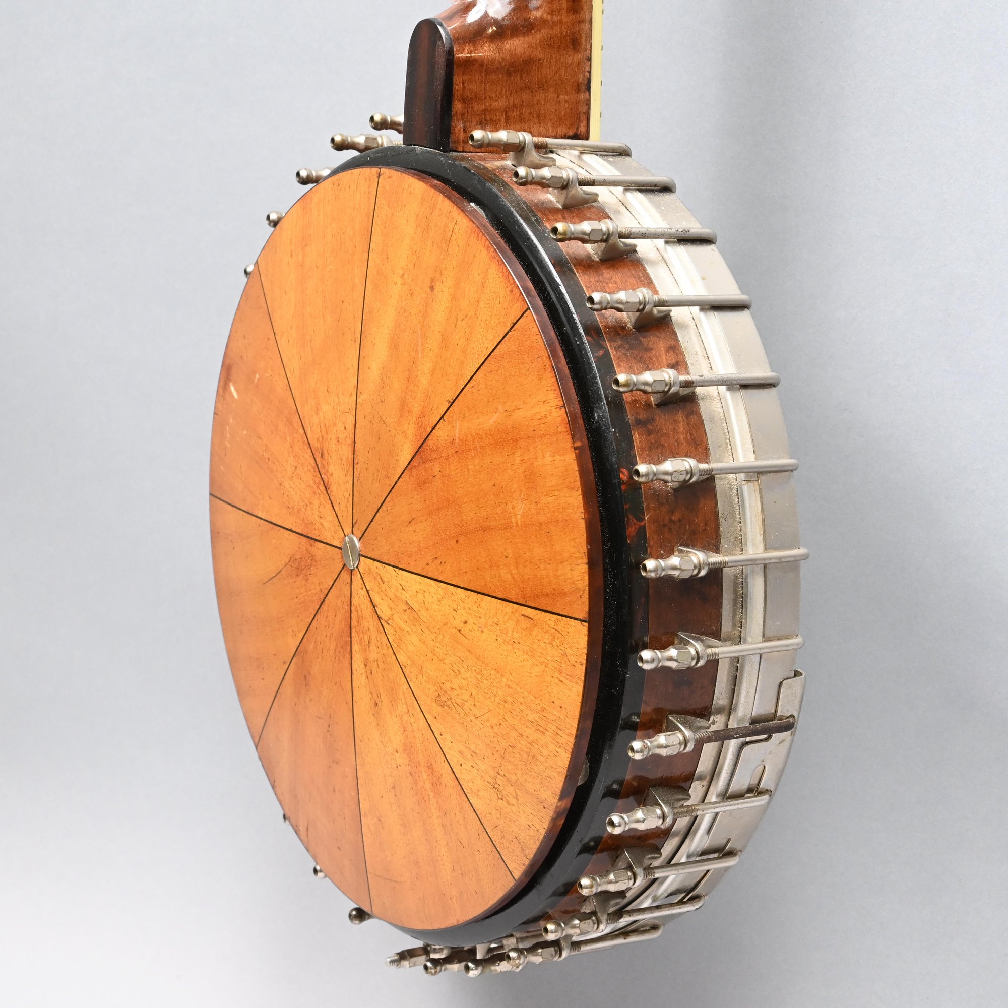 Rosewood, Tiger Maple, Maple and Mother-of-Pearl Inlaid Five-String Resonator Banjo. Inlaid in mother-of-pearl on the peghead with a torch and pendant scrolls and leaves, a star and geometric device on the neck.