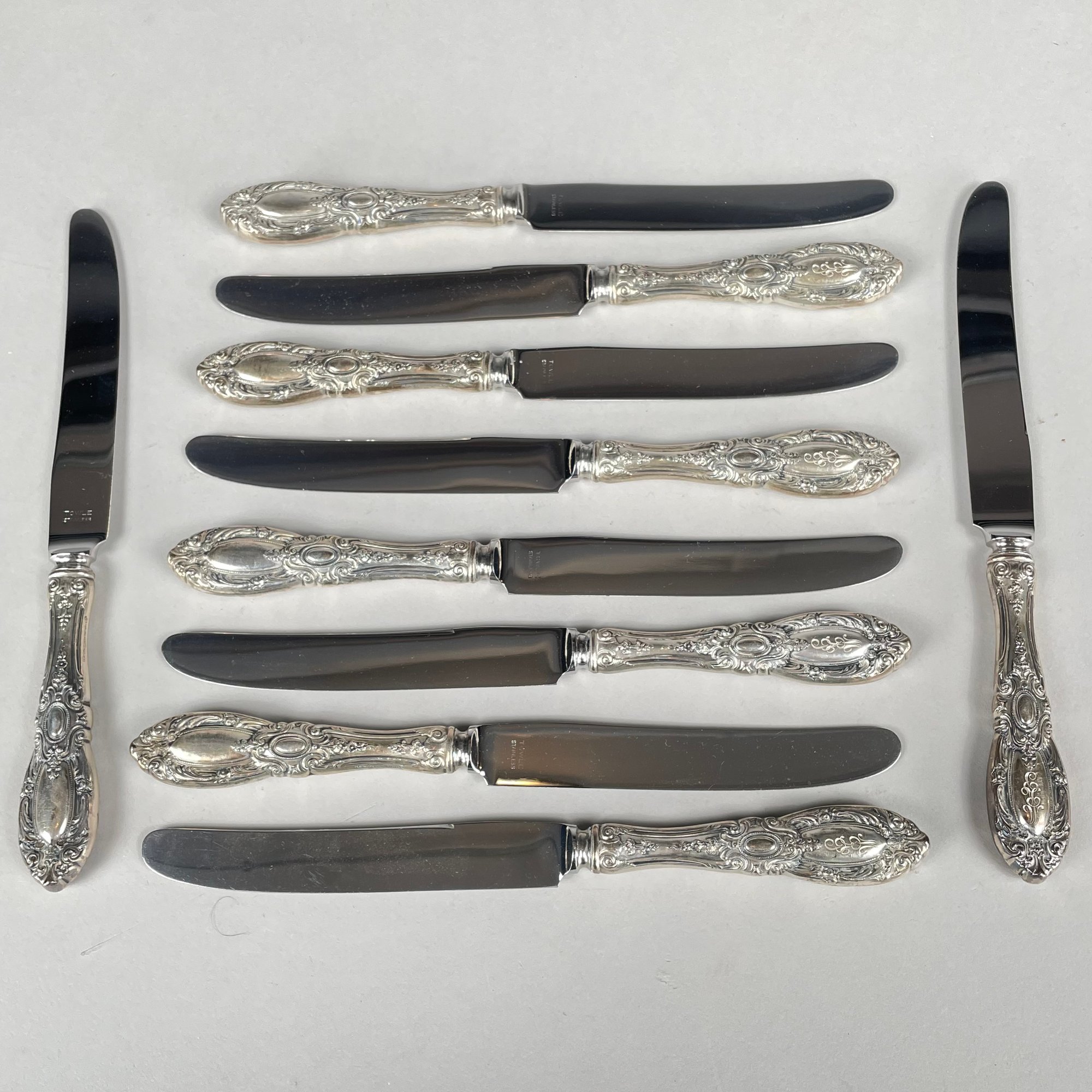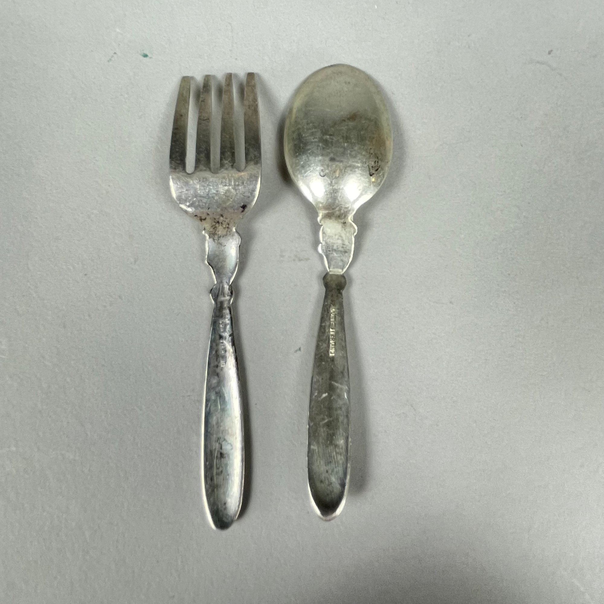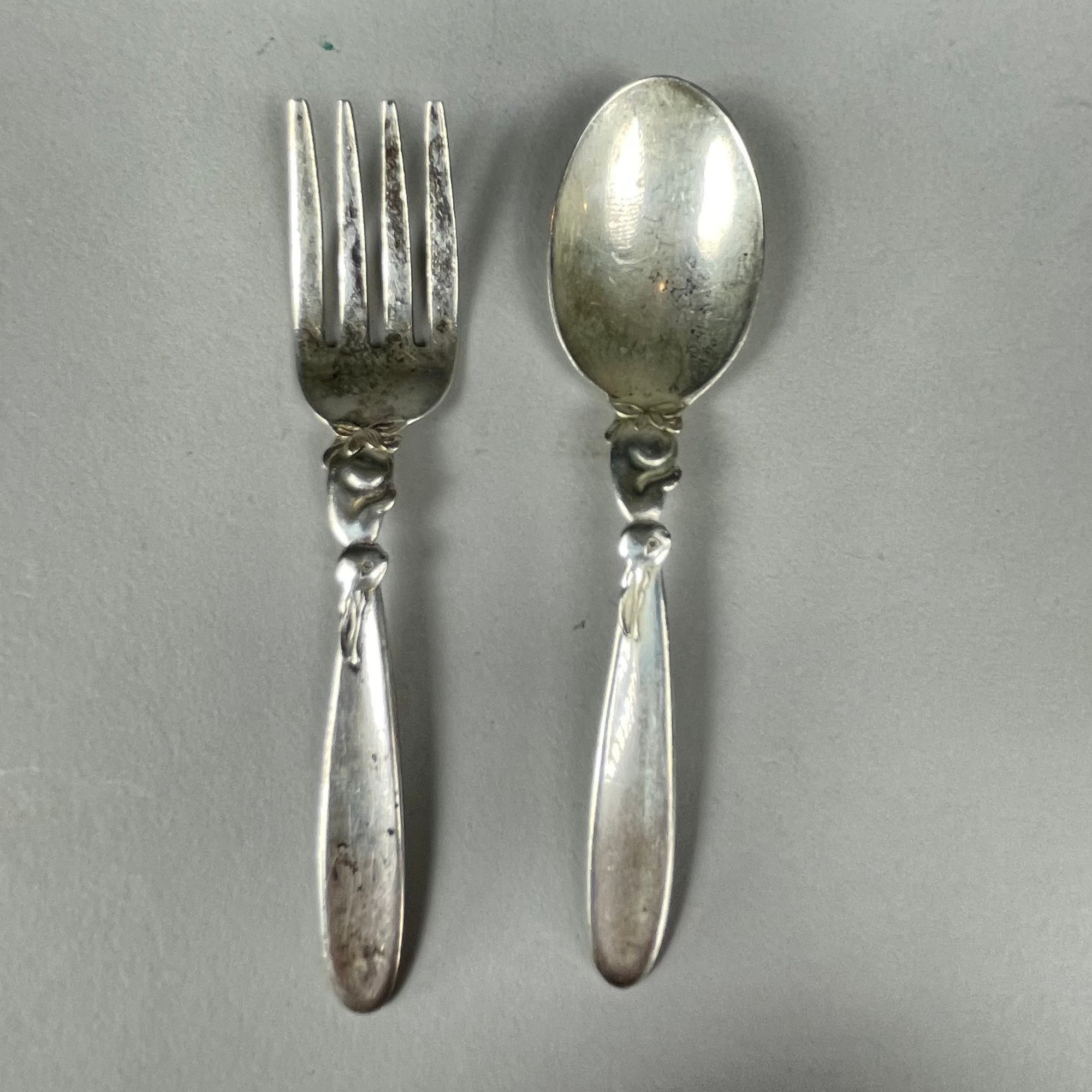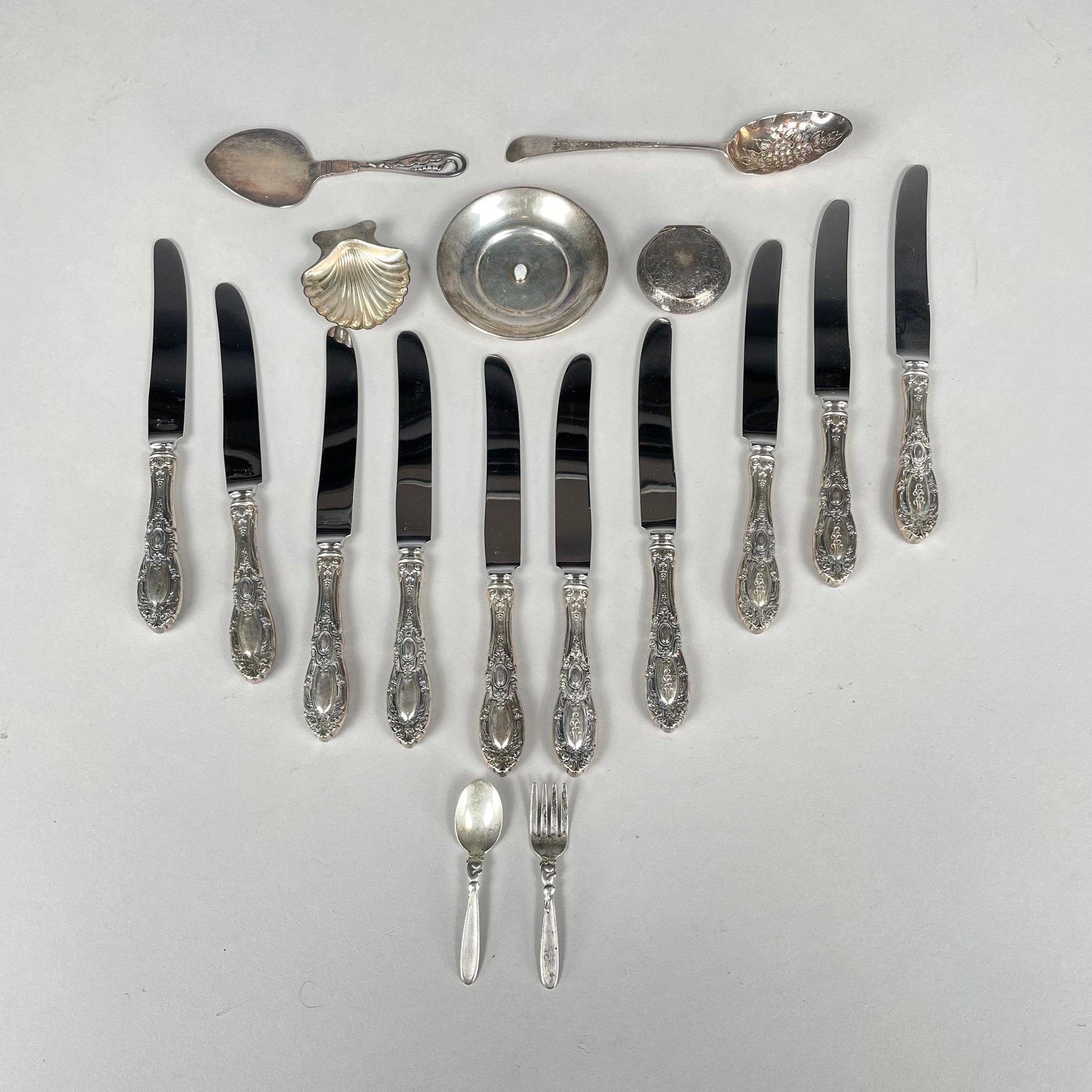 Group of Australian, Danish, English and American Sterling Silver Flatware and Table Objects. Comprising an Australian dish mounted with a moonstone, engraved "from The Simpsons Adelaide," marked "STG.SIL.;" a Danish Georg Jensen pastry server, 1933-44; an English silver-gilt circular box; a George III later repousse dessert spoon, George Gray, London, 1787; a Tiffany & Co. scallop shell nut dish; a Lunt infant's bunny fork and spoon; and a set of ten Towle Silversmiths 'King Richard' pattern dinner knives, various monograms, all marked. (16)